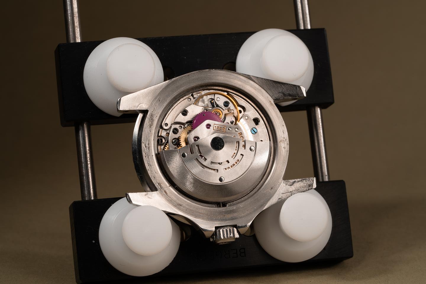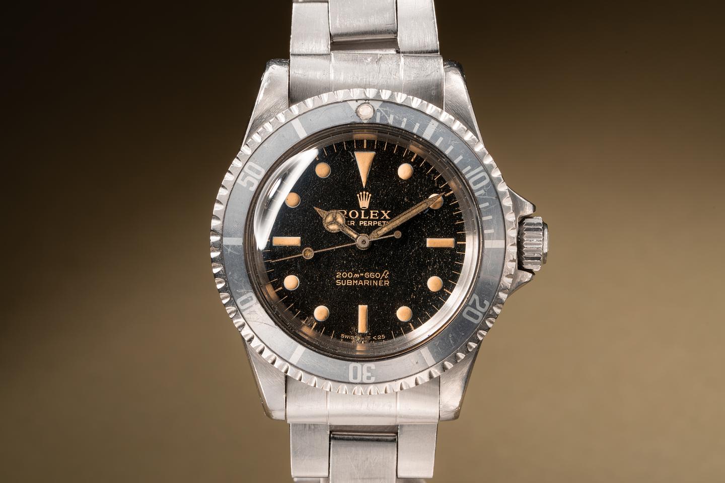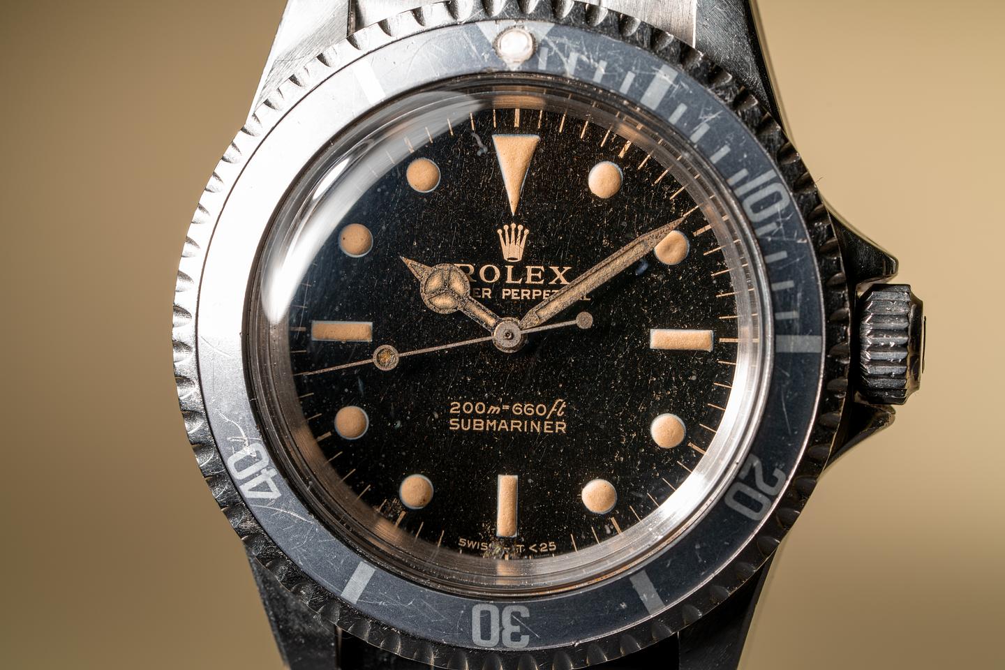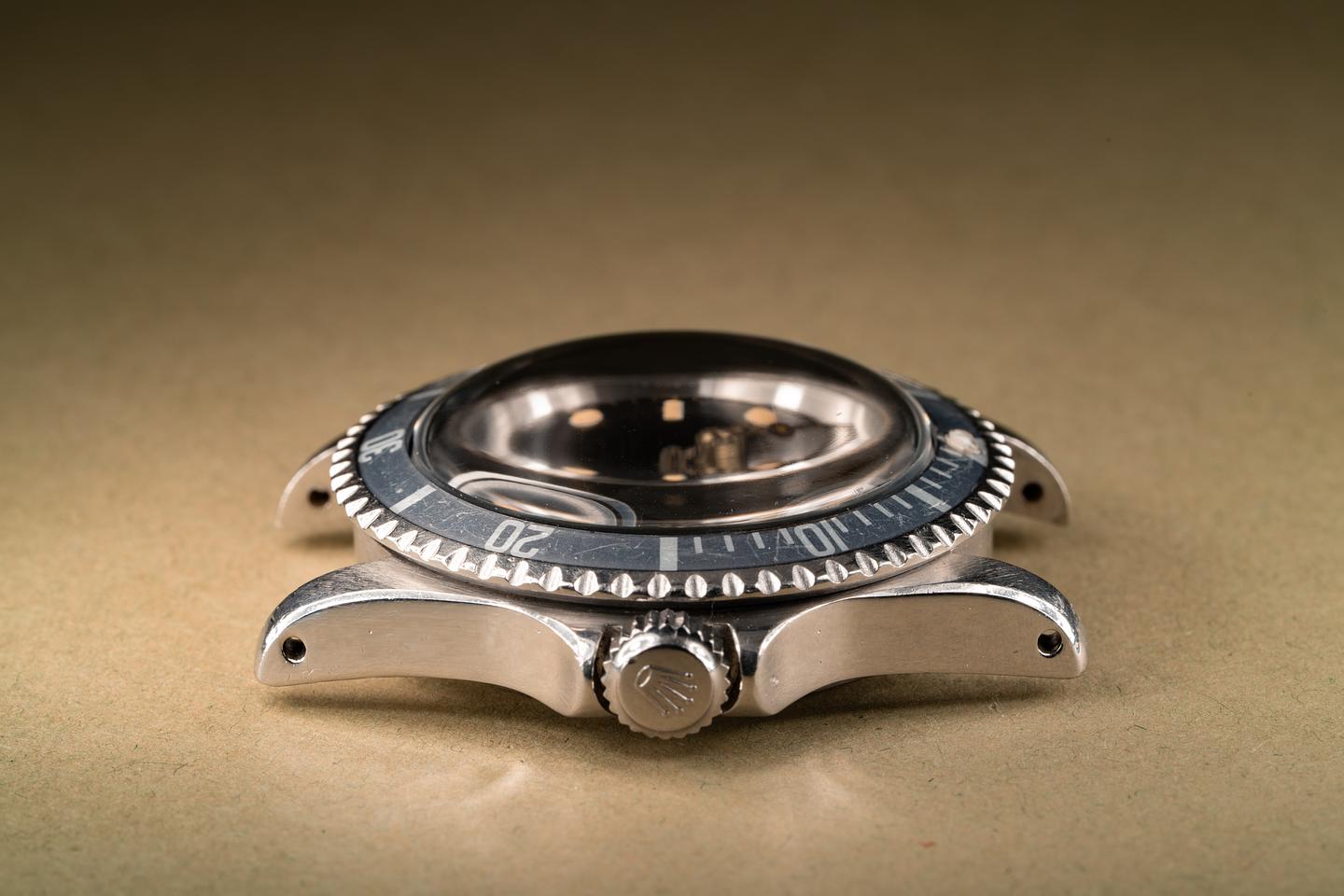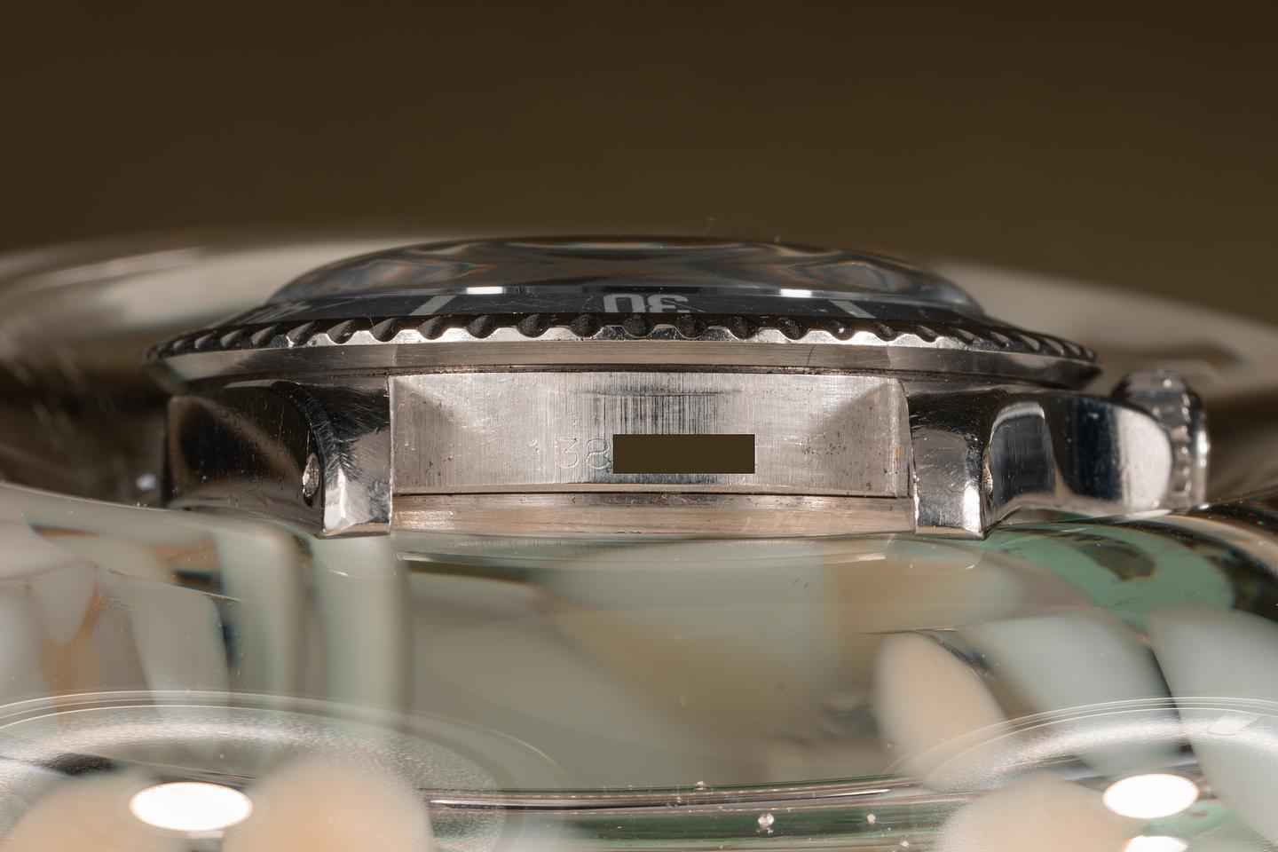 Case: The thick case has been polished in the past and shows some wear from use. The wide bevel profile of the case remains intact. The bezel insert has faded to a light silvery blue and shows some wear for its age.