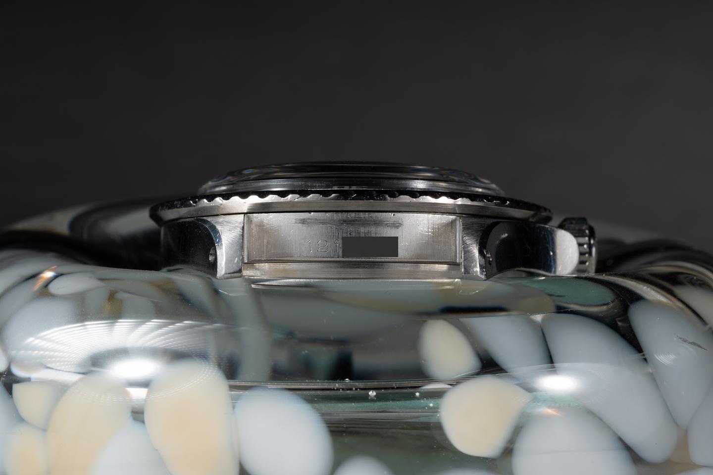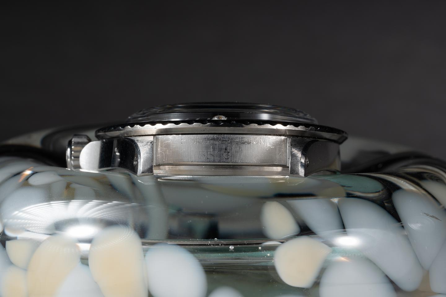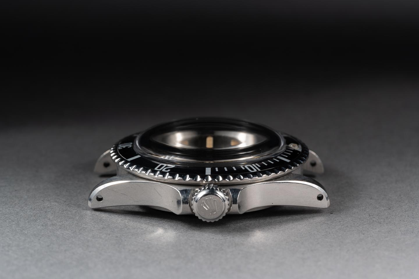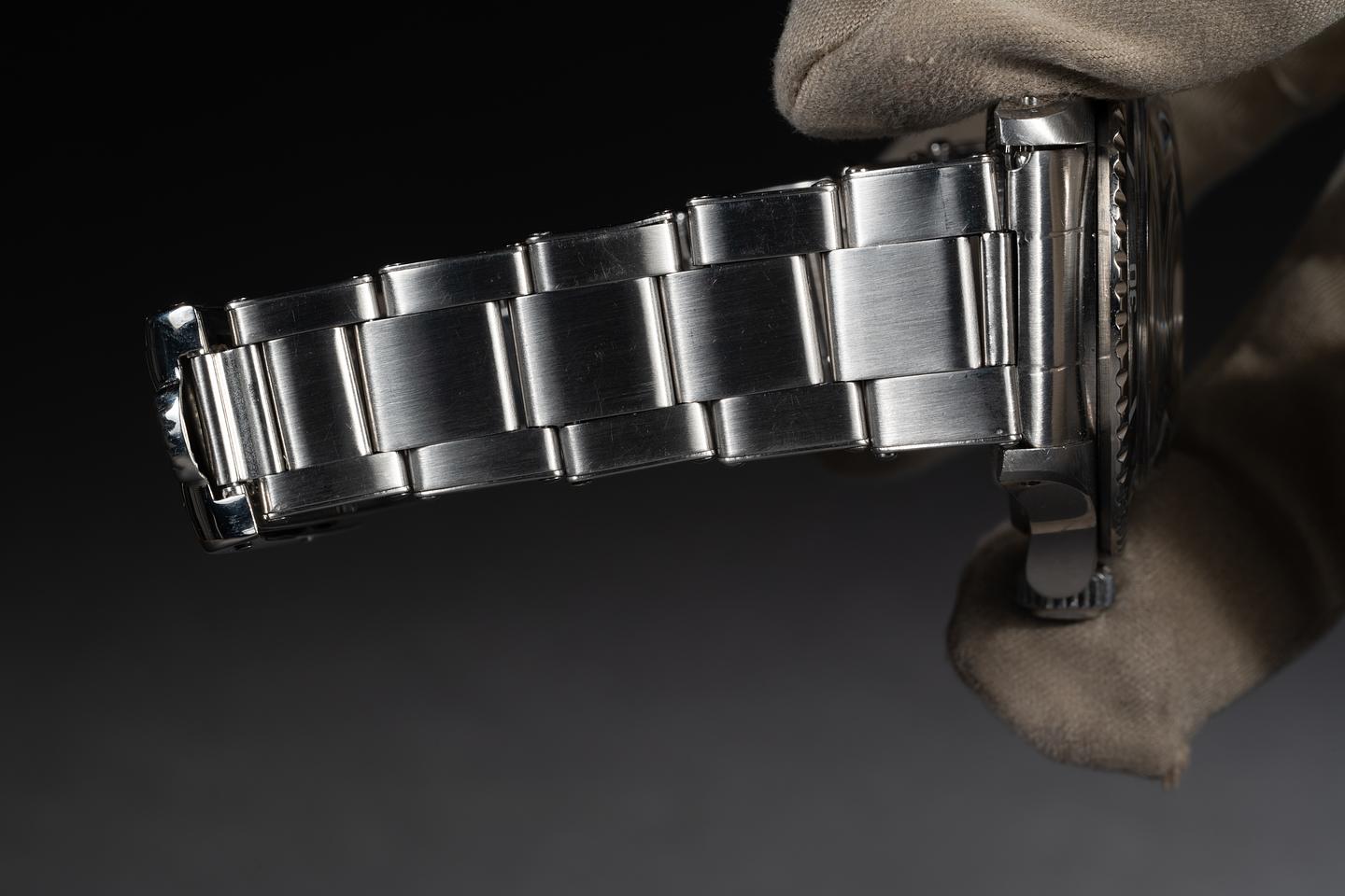 Case: The previously polished case is very good showing sharp prominent bevels and only light wear from use. The bezel insert is also in excellent condition and has aged to a dark charcoal grey.