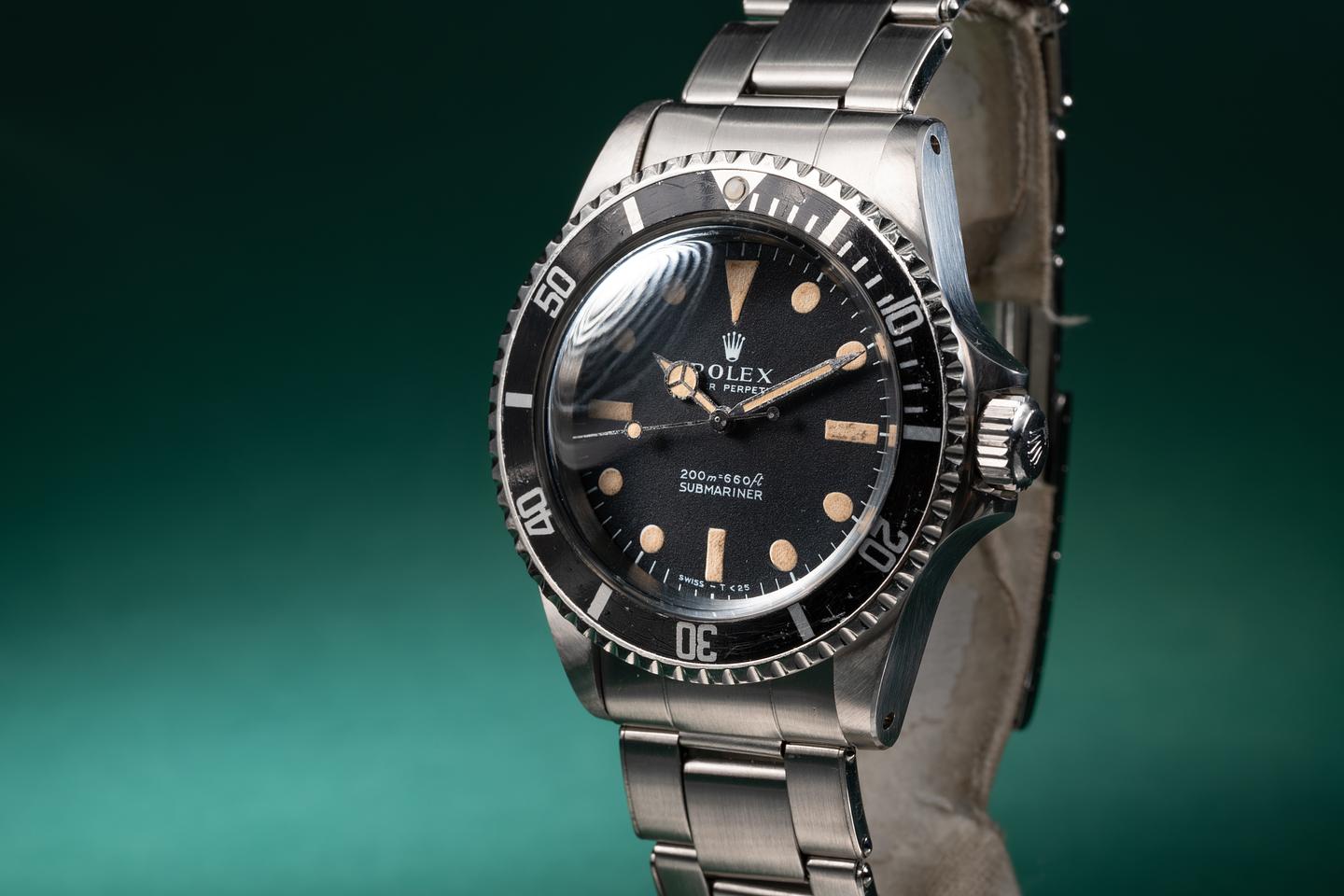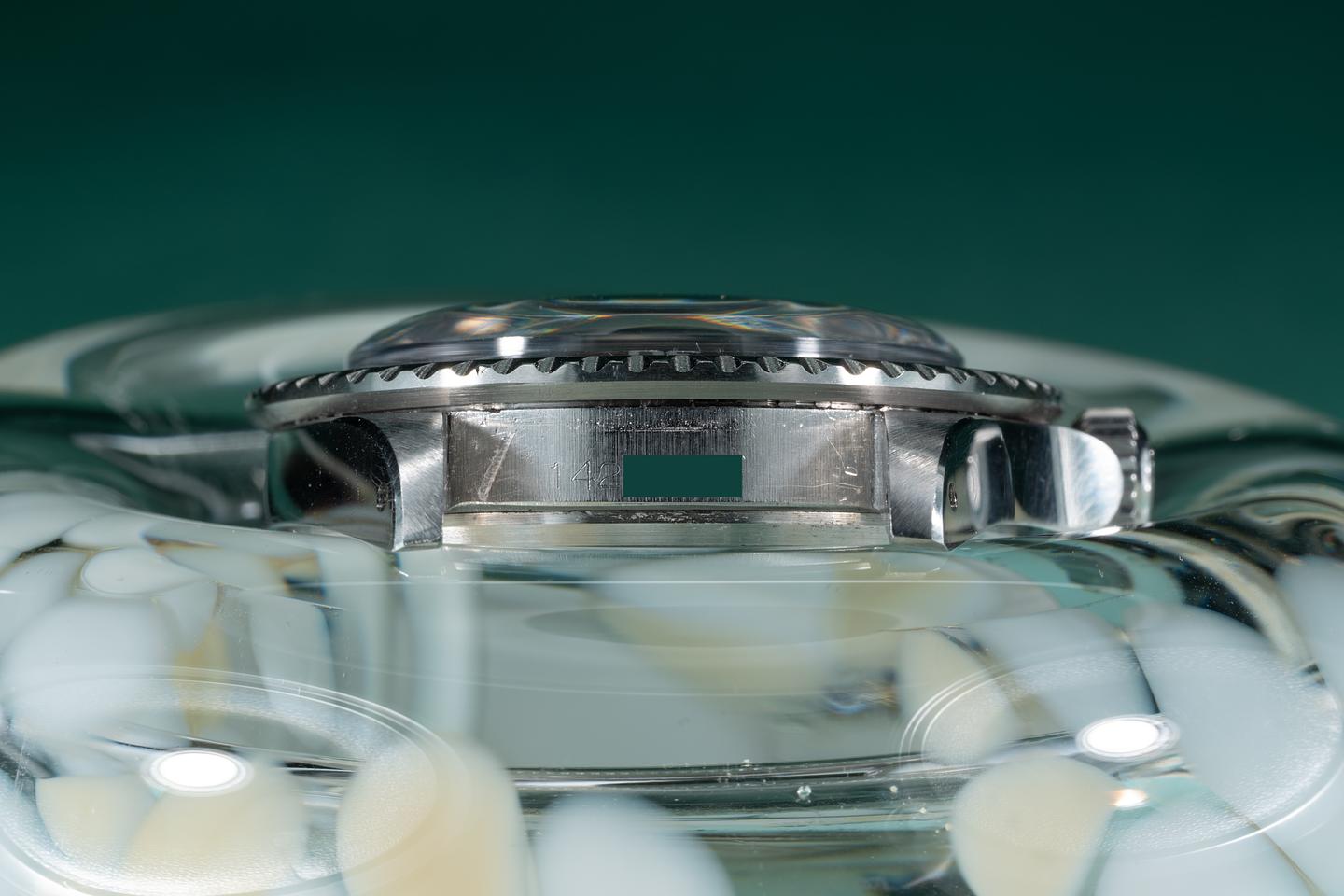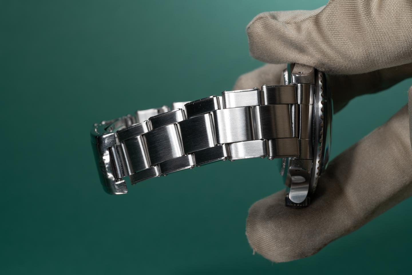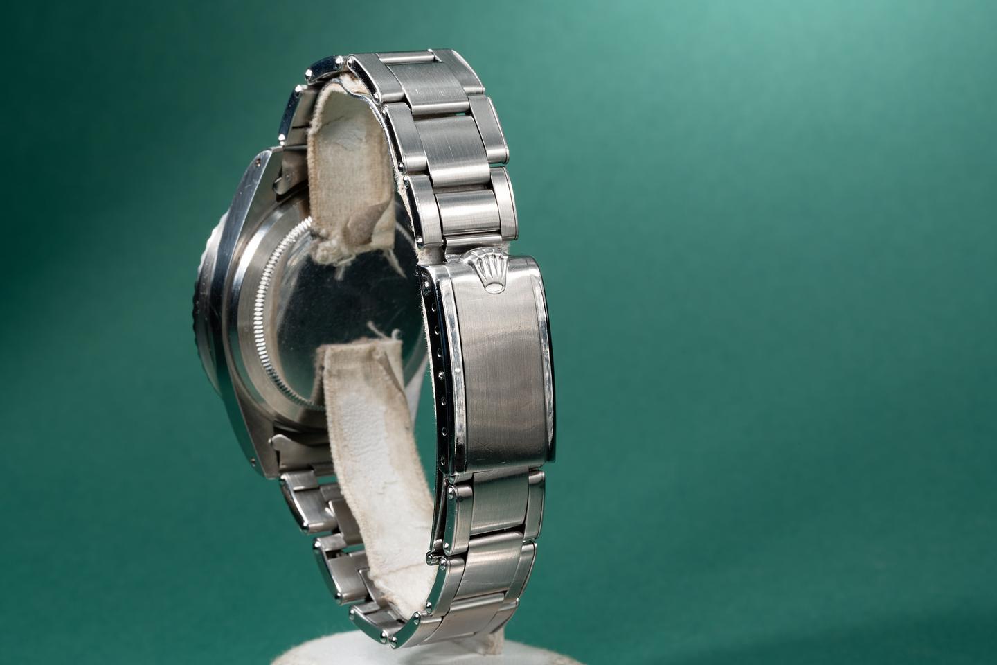Dial: The satin black meters first dial is excellent showing some light wear for its age. The lume has aged to a vibrant sandy hue with some darker spots present on the 12, 3, and 6 o'clock lume plots. The hands have been relumed and match the dial perfectly. Bracelet: The 11 link folded link oyster bracelet is excellent and shows average stretch for its age.
