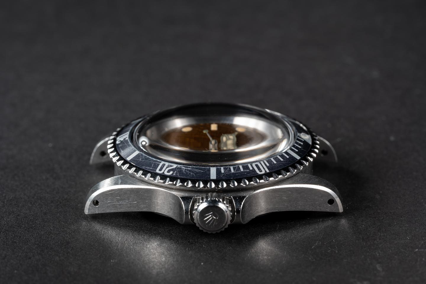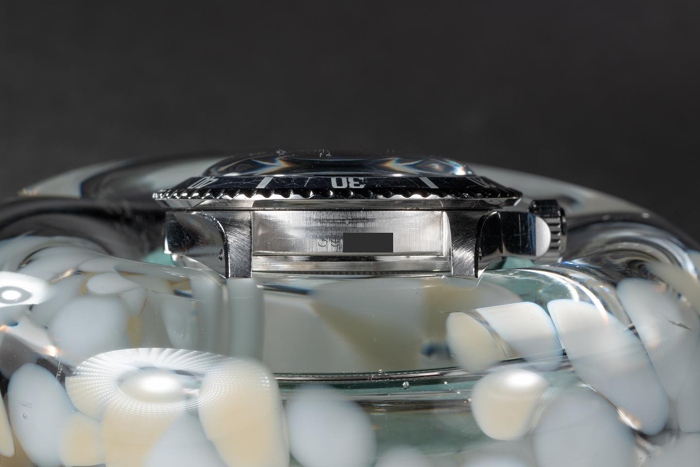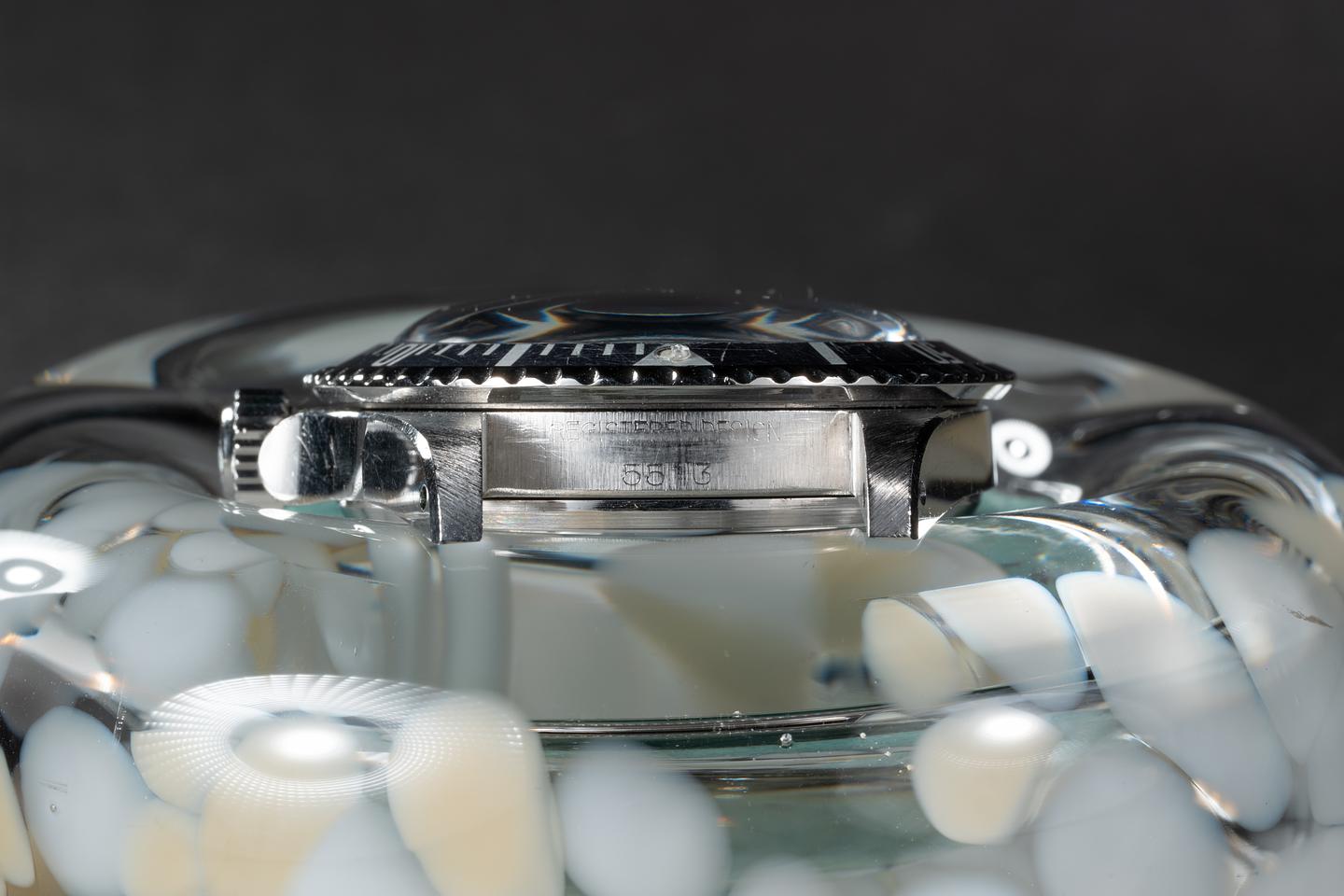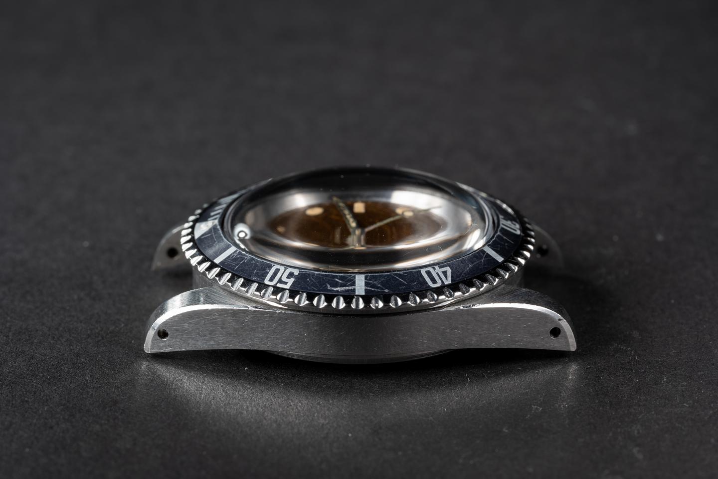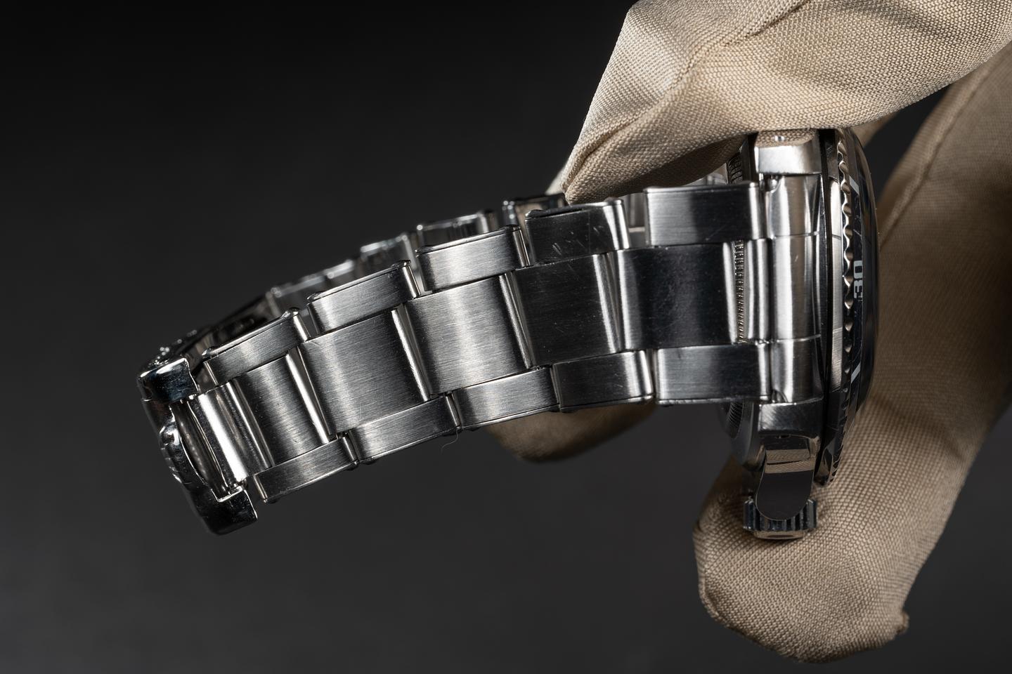 Case: The recently polished case is excellent showing sharp prominent bevels and only very light wear from use. The bezel insert is also in excellent condition and has faded to a dark blue/grey hue.