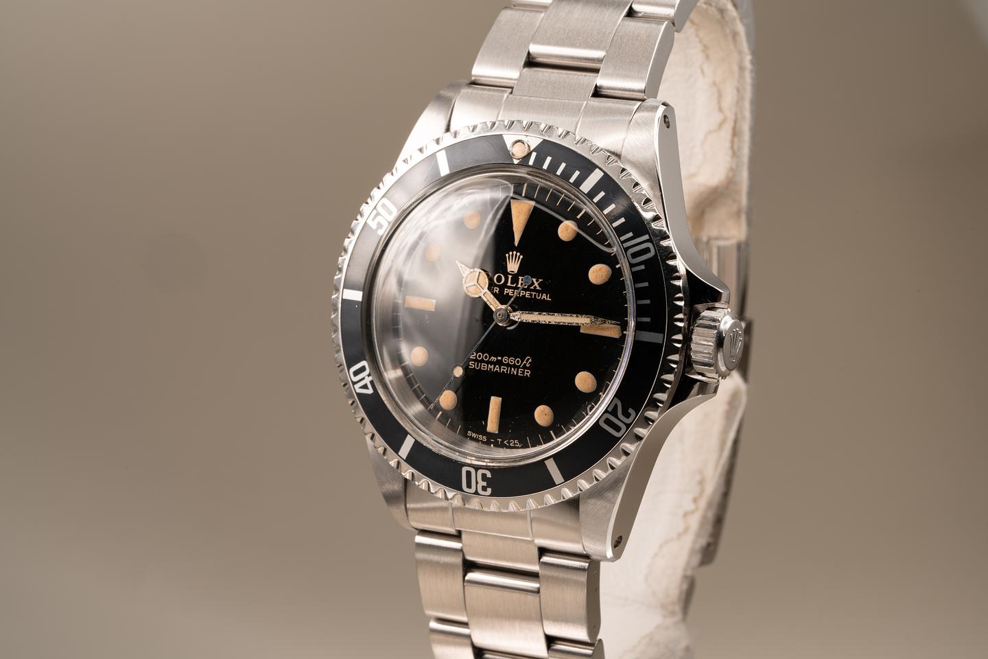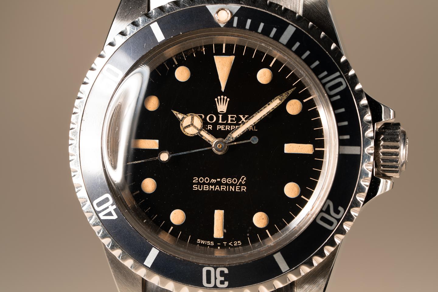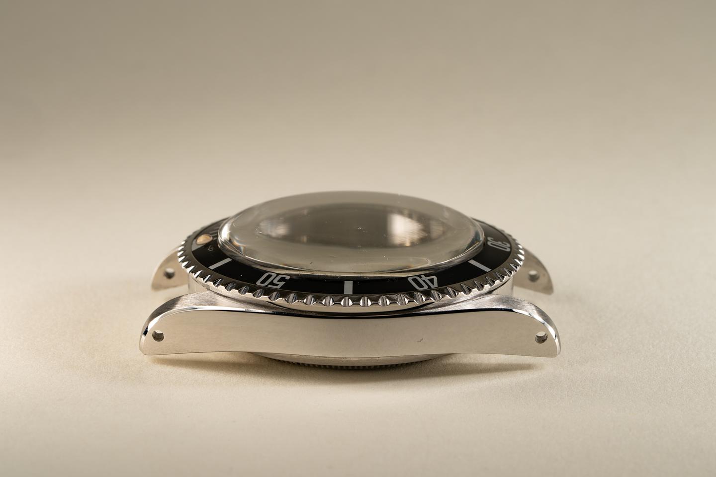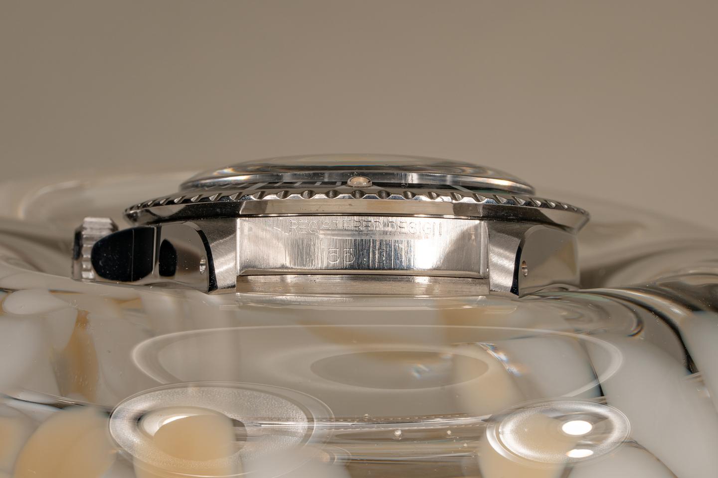 Case: Excellent case that has just returned from polishing. The original fat font bezel has aged to a navy hue and has some light marks from use. The bezel pearl is newer than the watch. The watch comes on an original super-dome crystal that we were able to save.