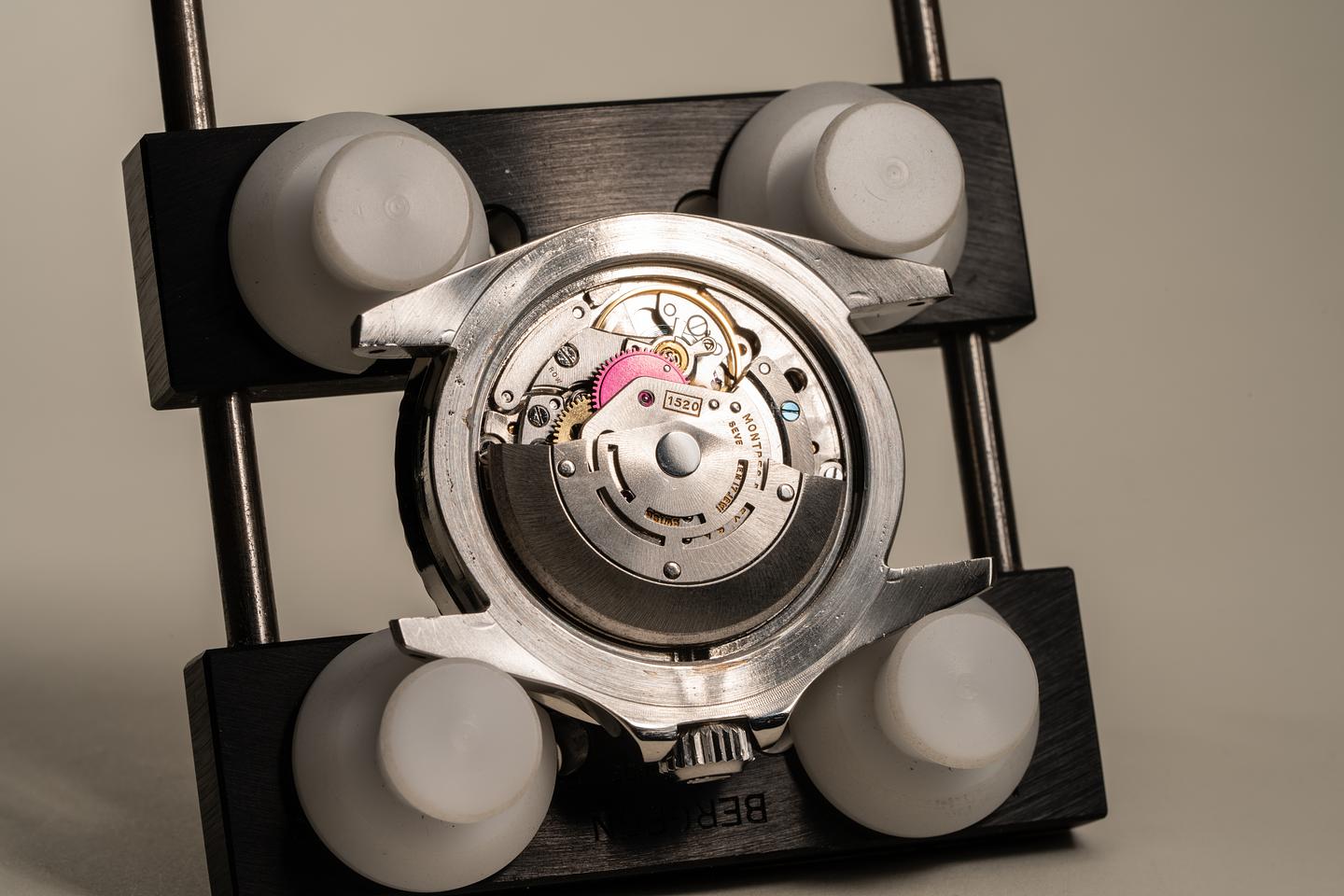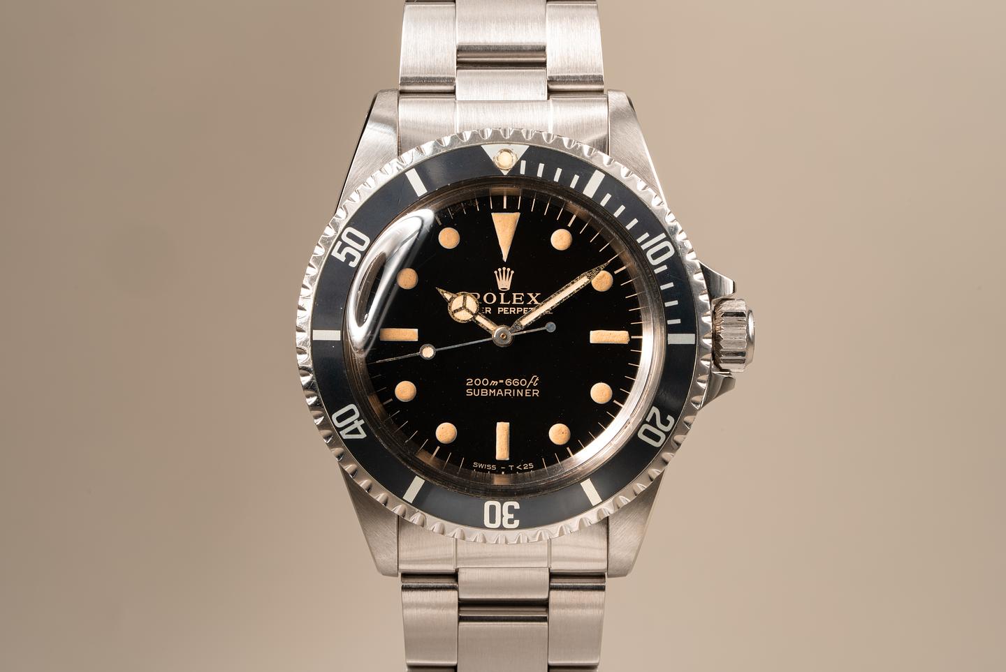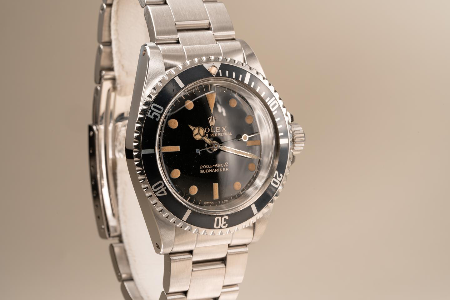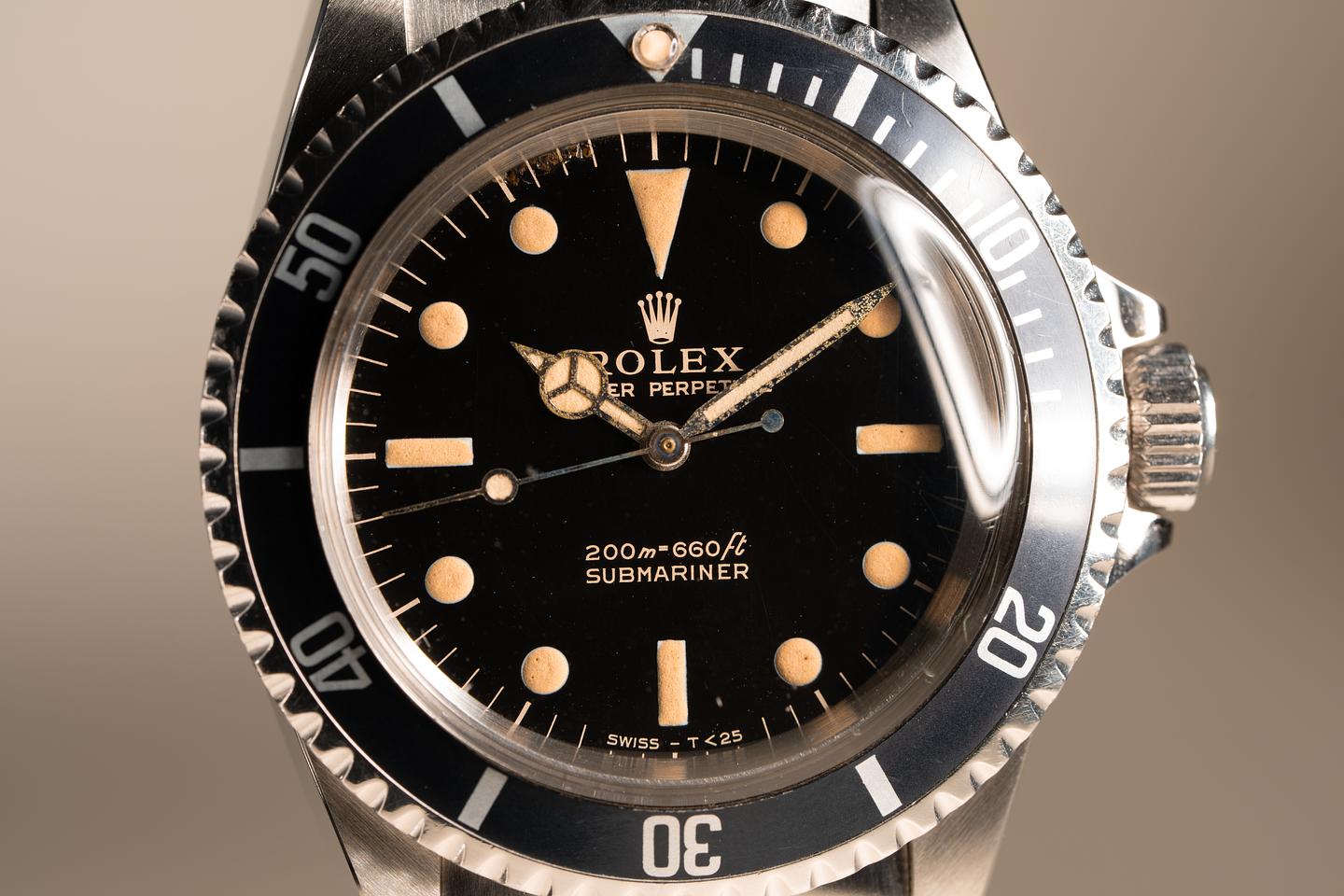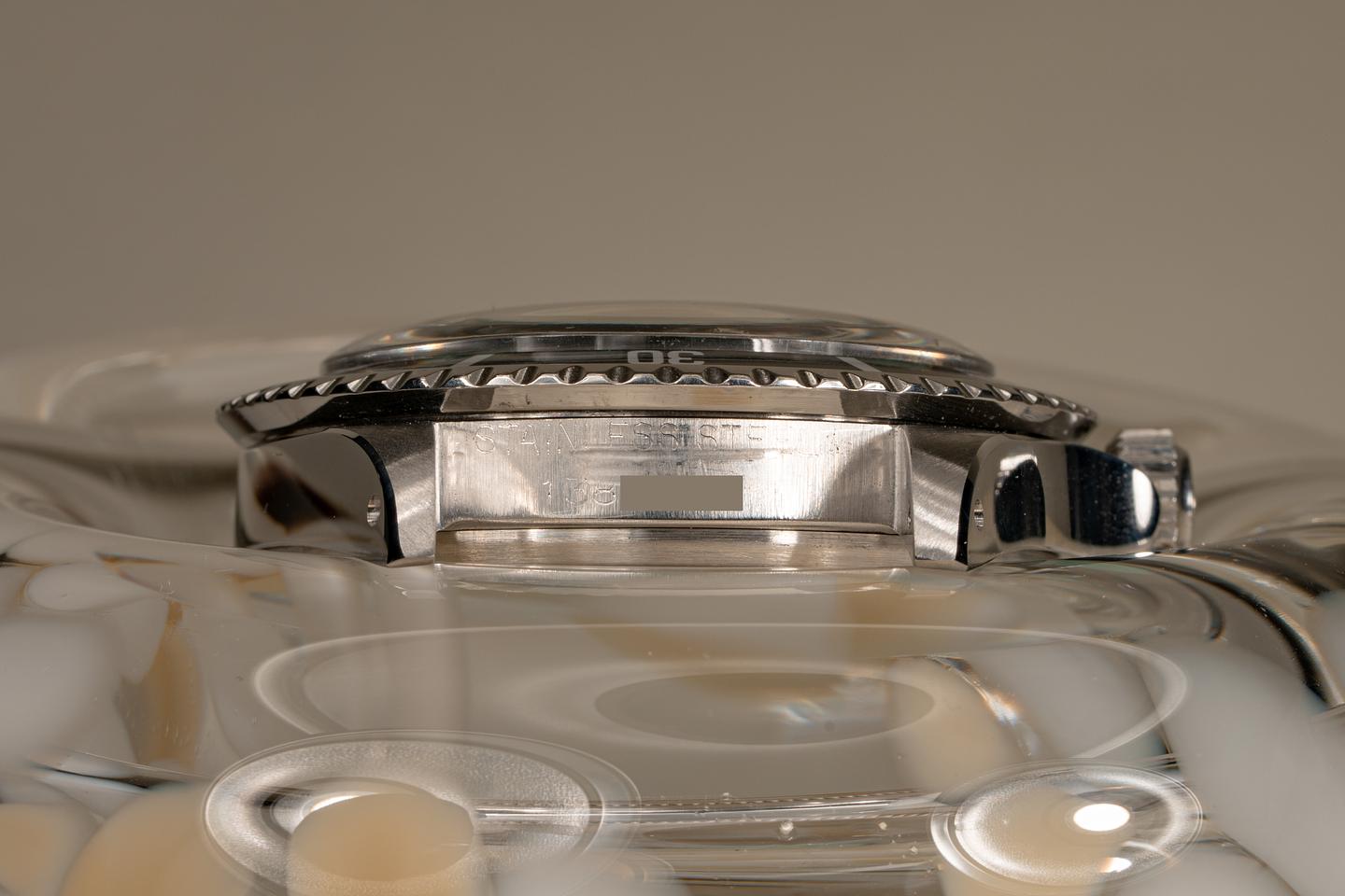 Case: Excellent case that has just returned from polishing. The original fat font bezel has aged to a navy hue and has some light marks from use. The bezel pearl is newer than the watch. The watch comes on an original super-dome crystal that we were able to save.