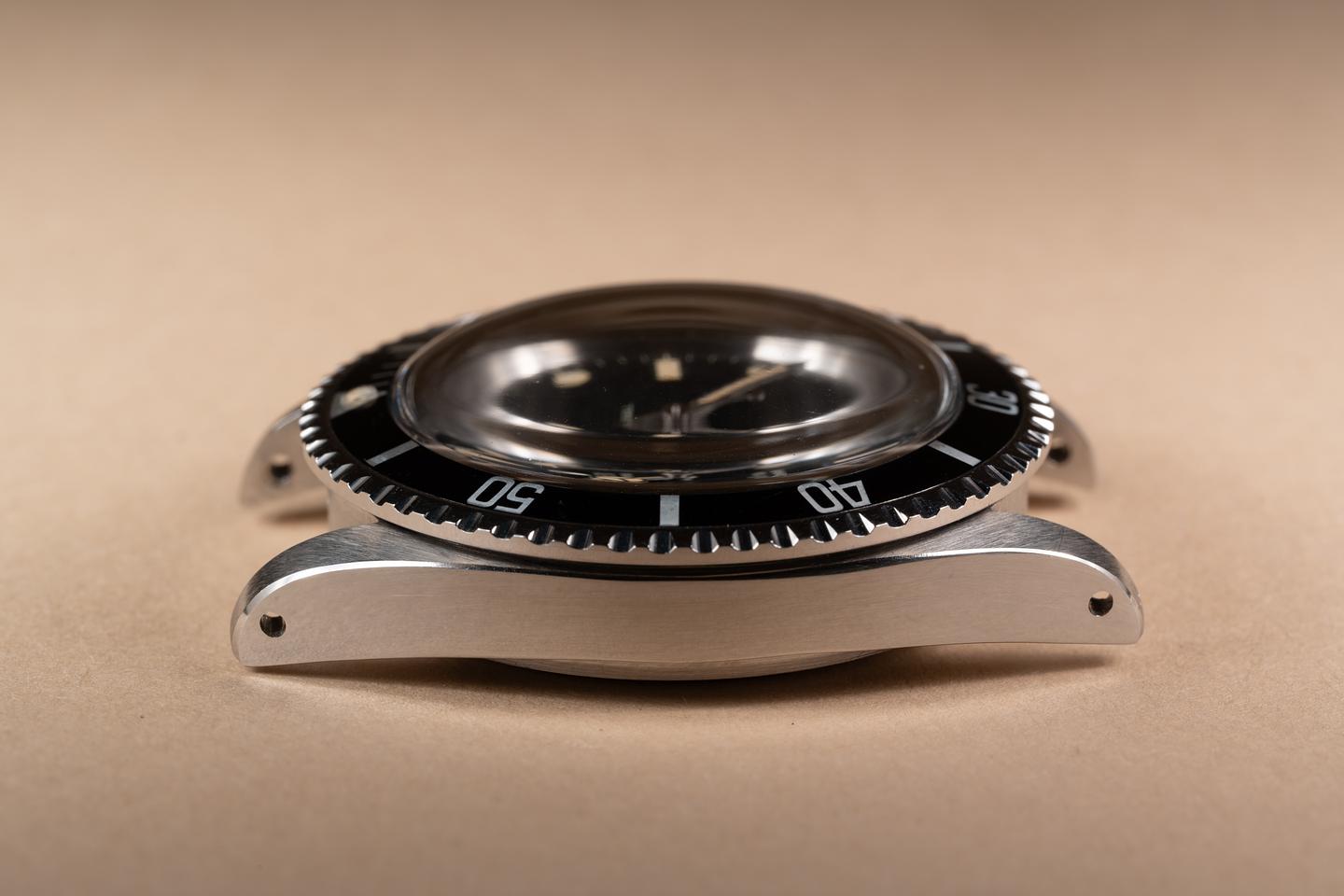 Dial: The newer matte black serif dial is excellent showing only very light wear for its age. The lume on the dial has flaked off over time. The underplots have aged to a darker hue. The hands have also been relumed.