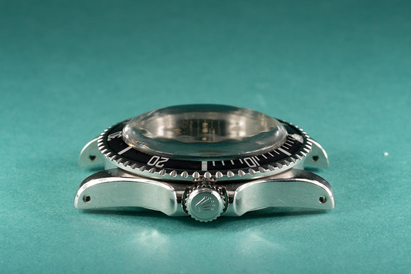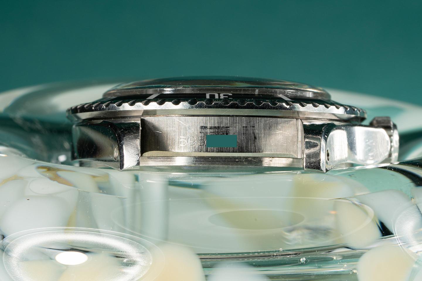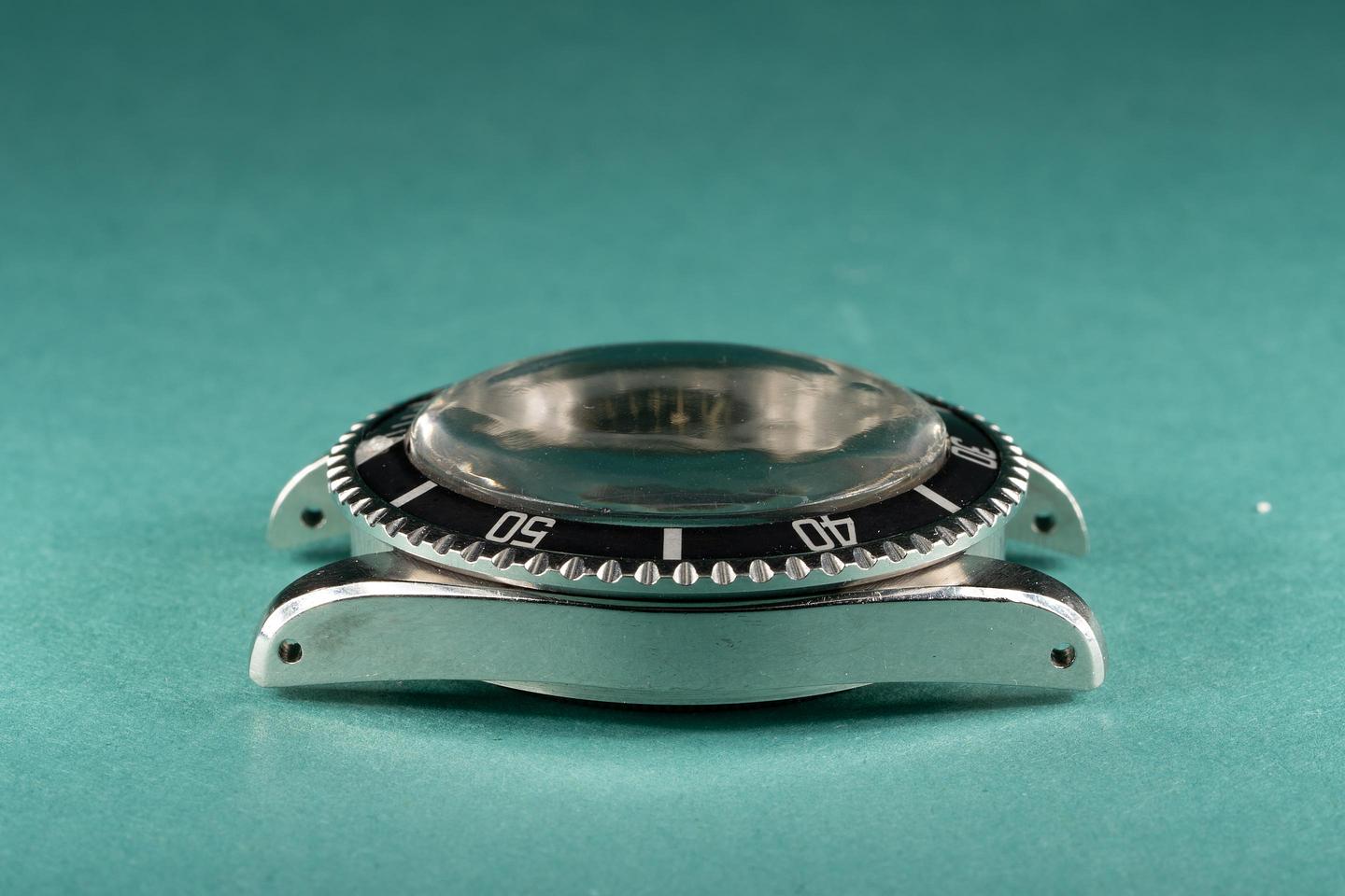 Case: The thick case features thick prominent bevels and has a bright sleeve polished appearance. The black bezel has faded to a dark matte grey tone and shows light wear.