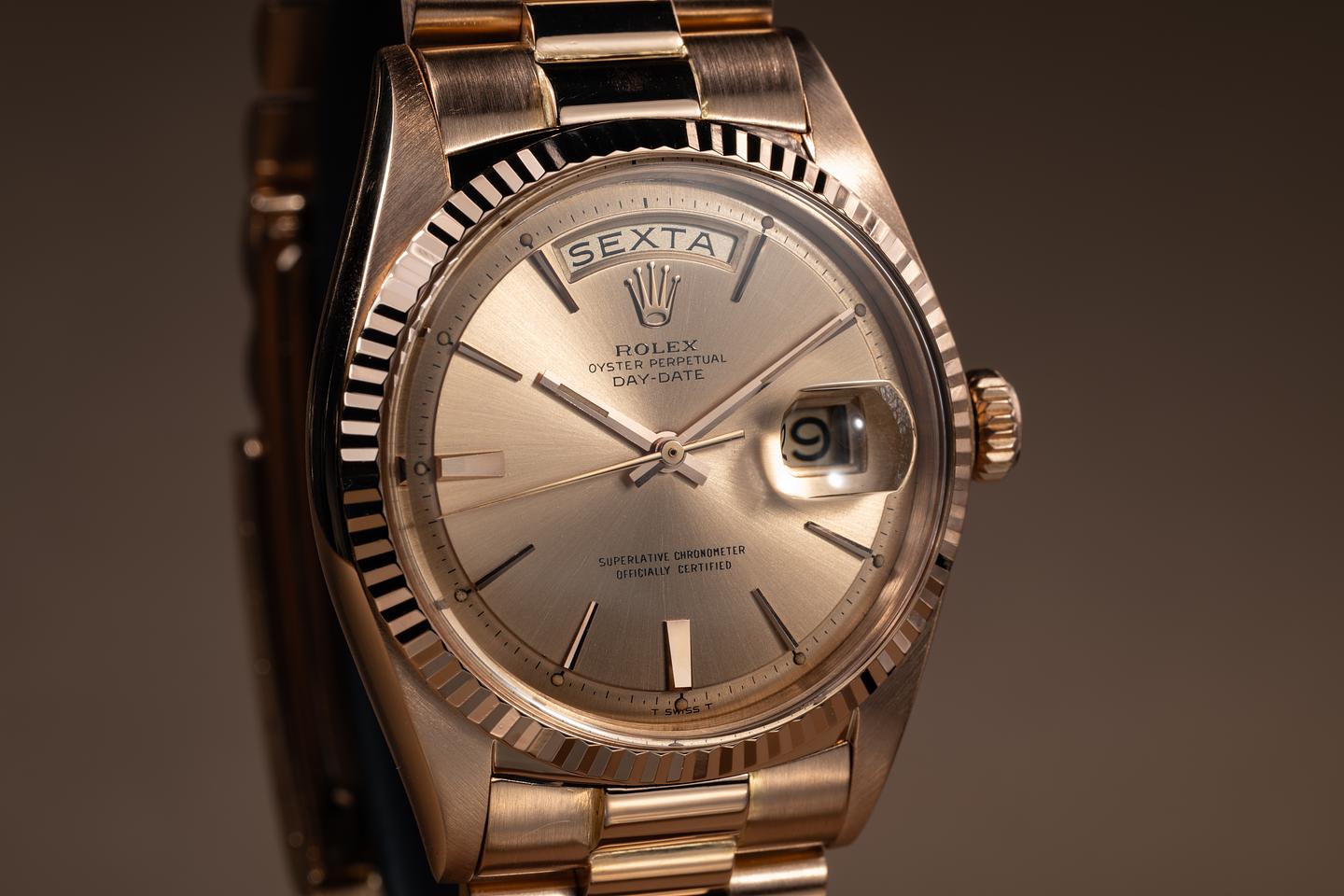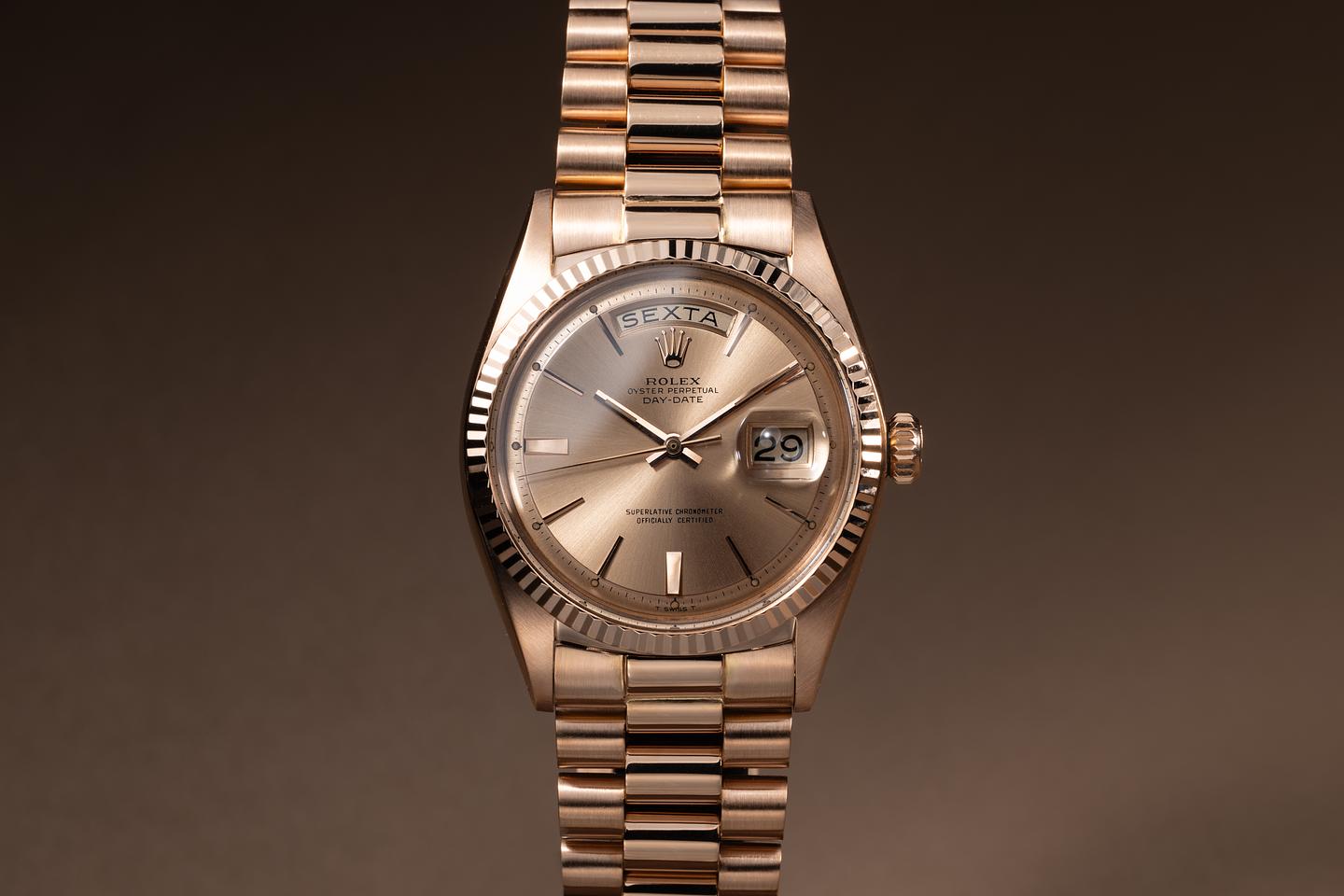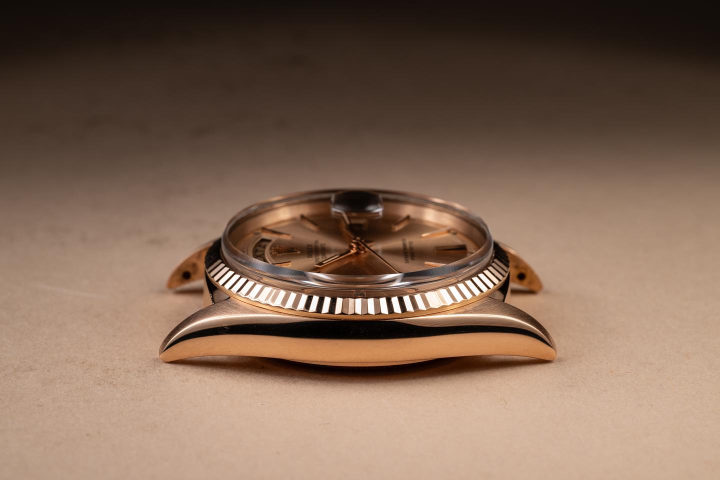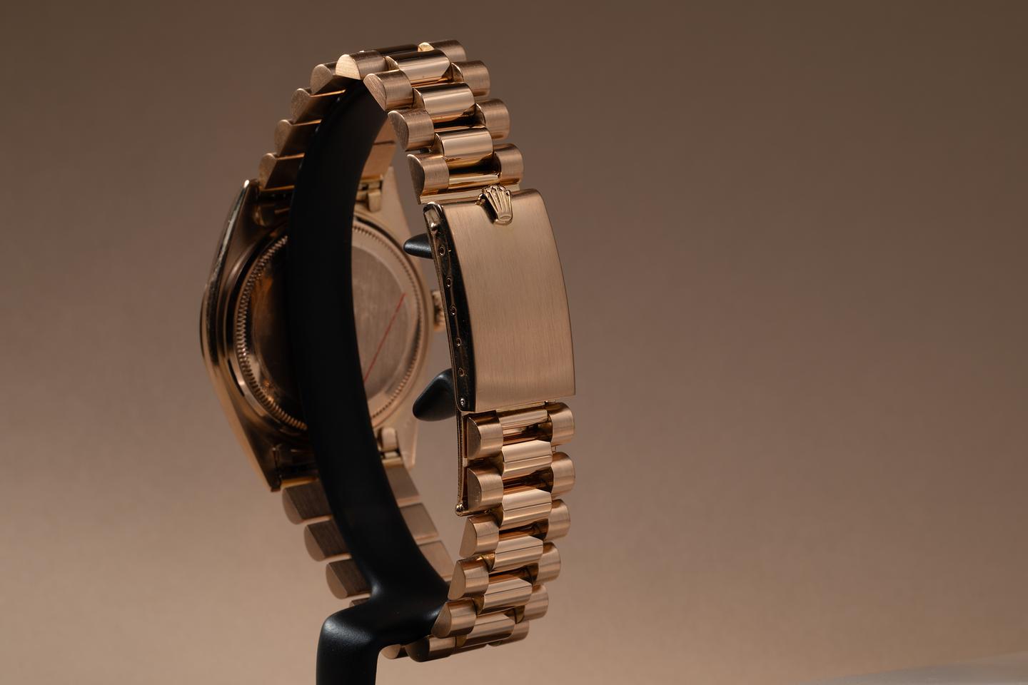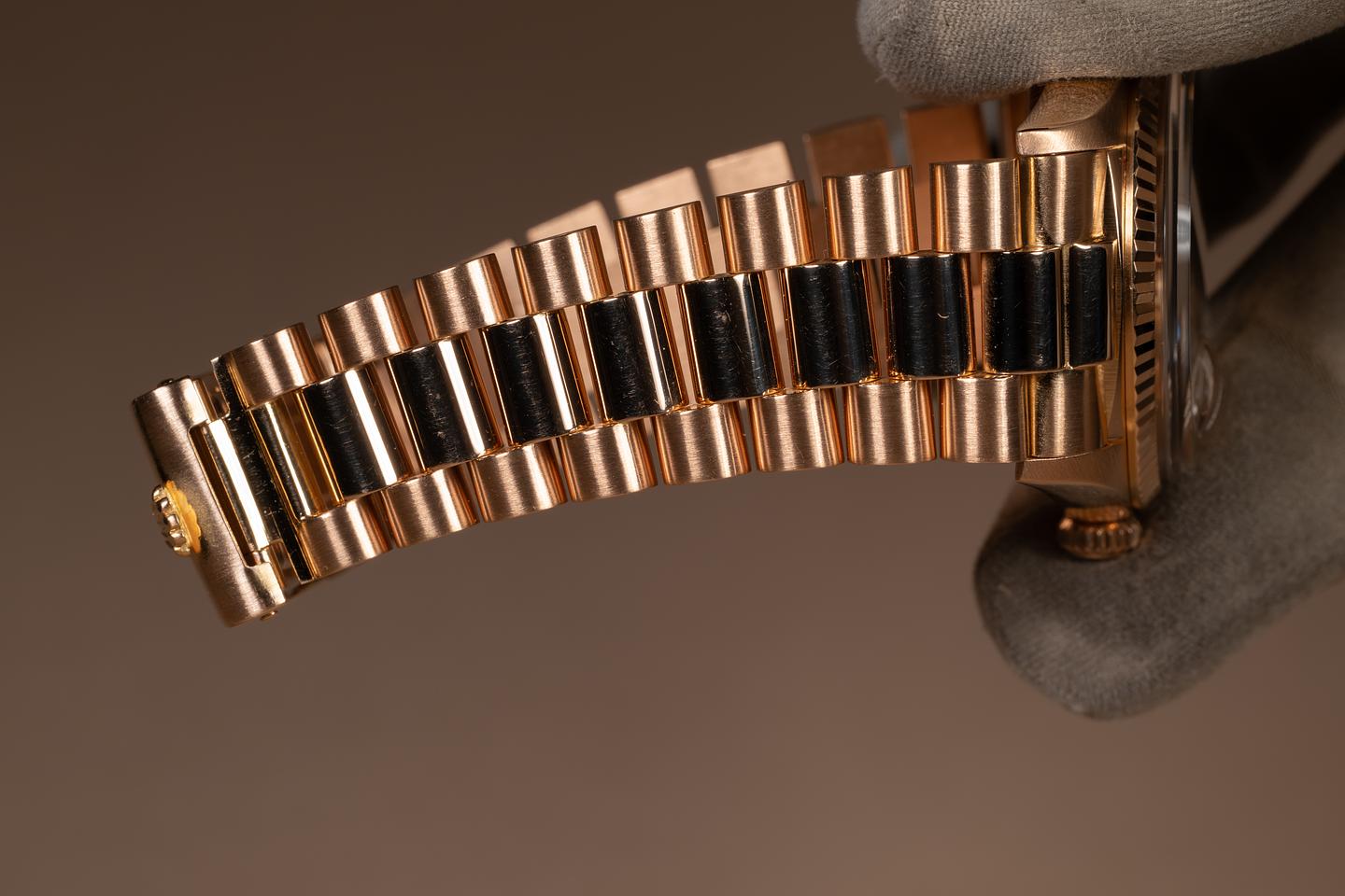 Bracelet: The 19-link 18K rose gold president bracelet is excellent, showing only light wear for its age.