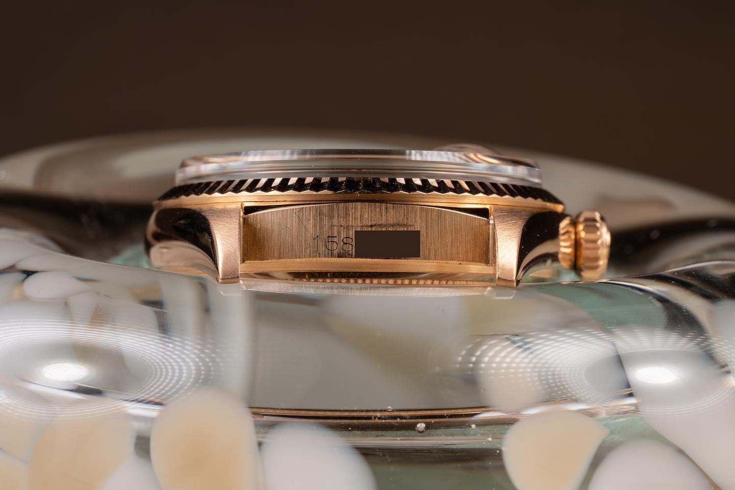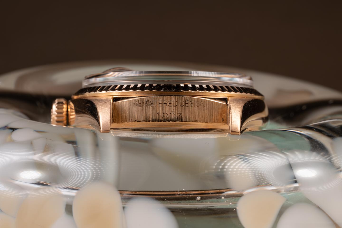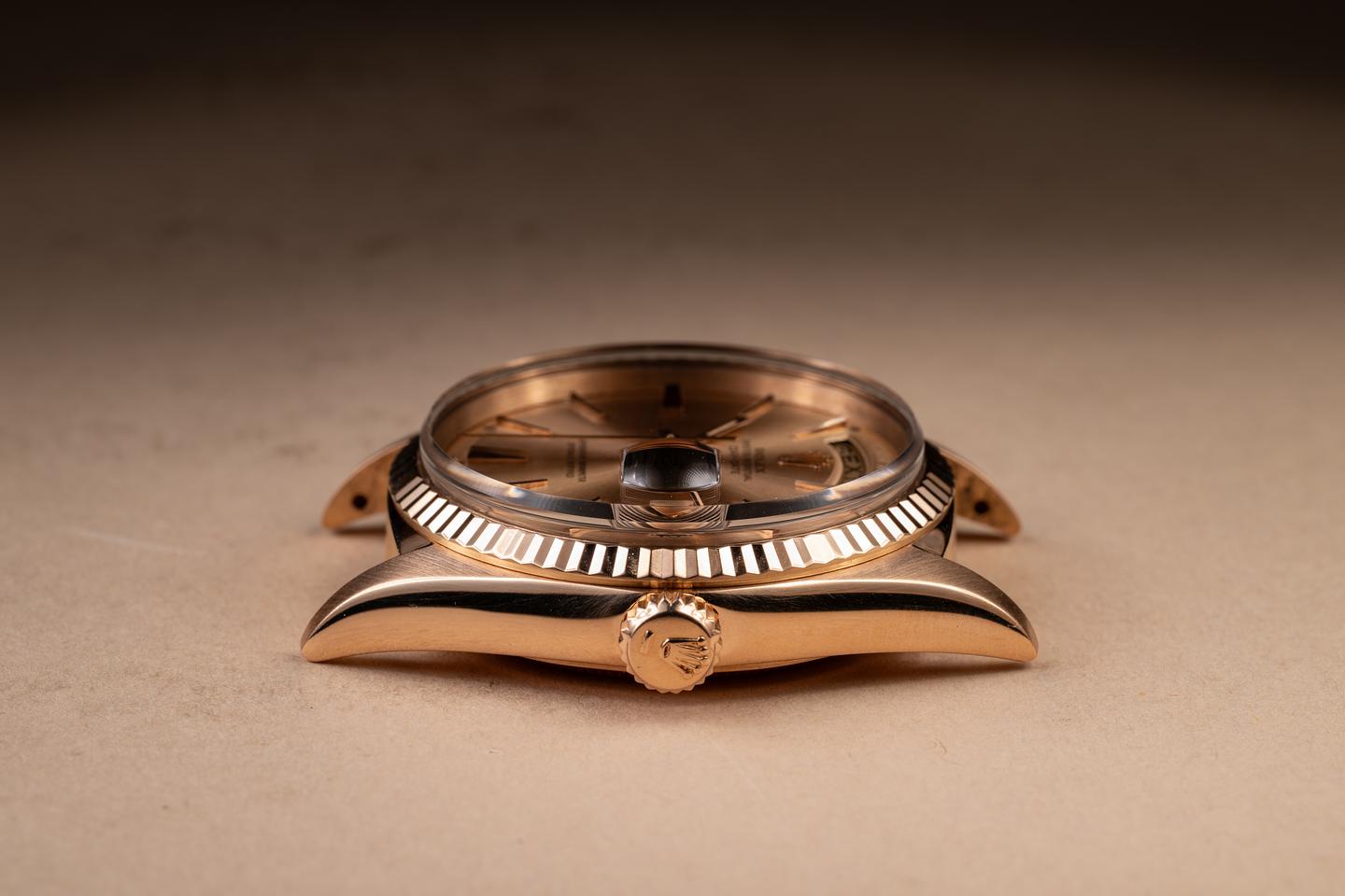 Case: The previously polished 18K rose gold case is excellent, showing only very light wear from use. The sharp 18K rose gold fluted bezel is also in excellent condition, showing only very light wear from use.