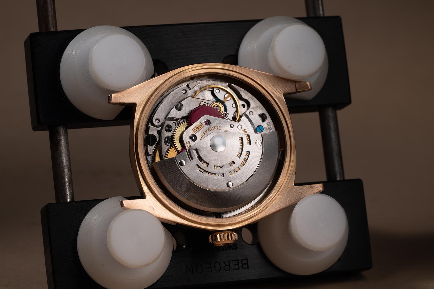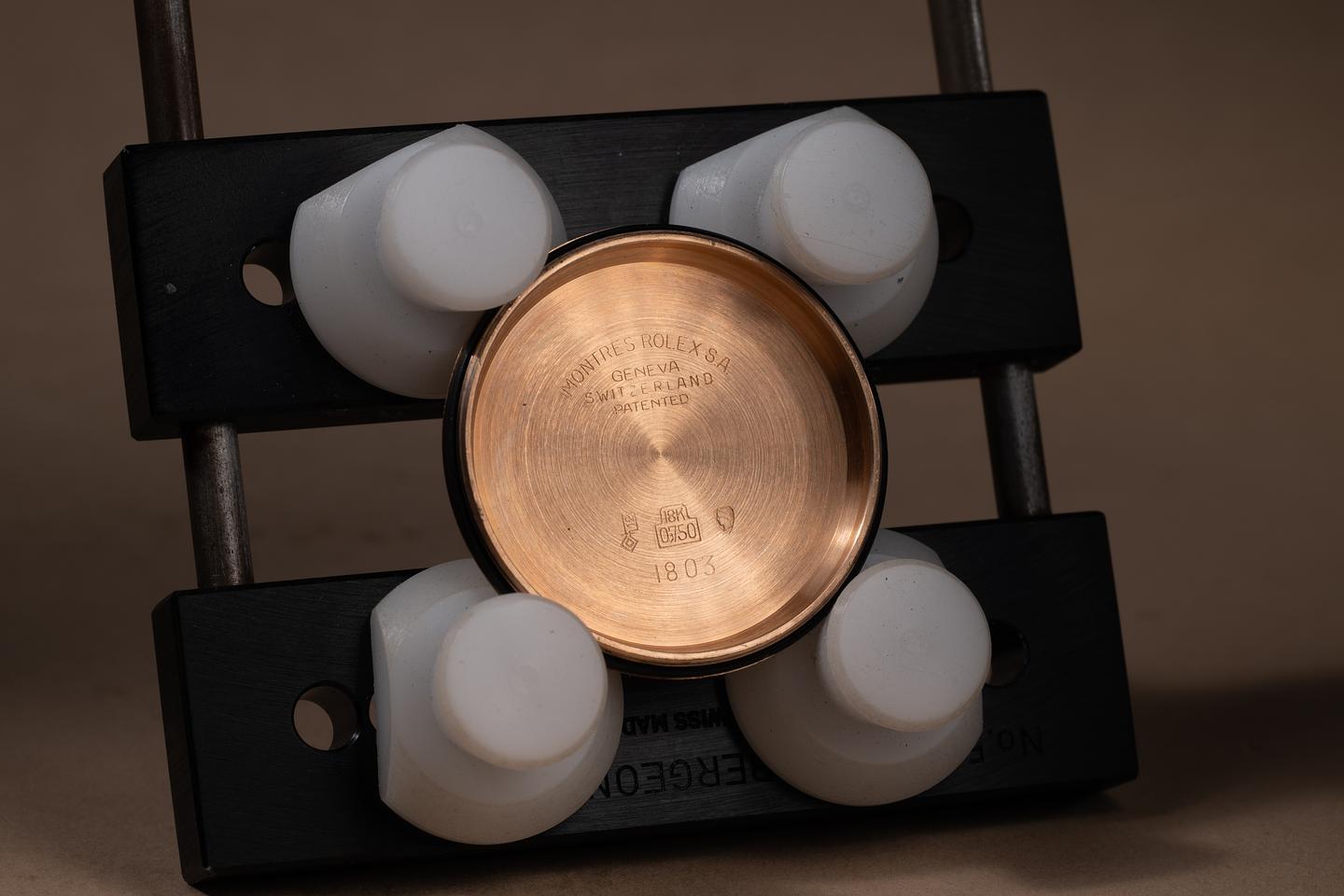 Dial: The rose gold doorstop dial is excellent, showing only very light wear for its age. The lume has aged to a warm, creamy hue, and the hands match perfectly. The 8 o'clock lume plot is missing a portion of its luminous mass.