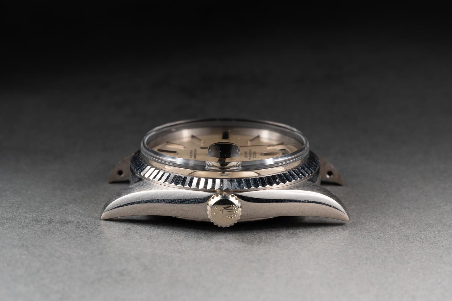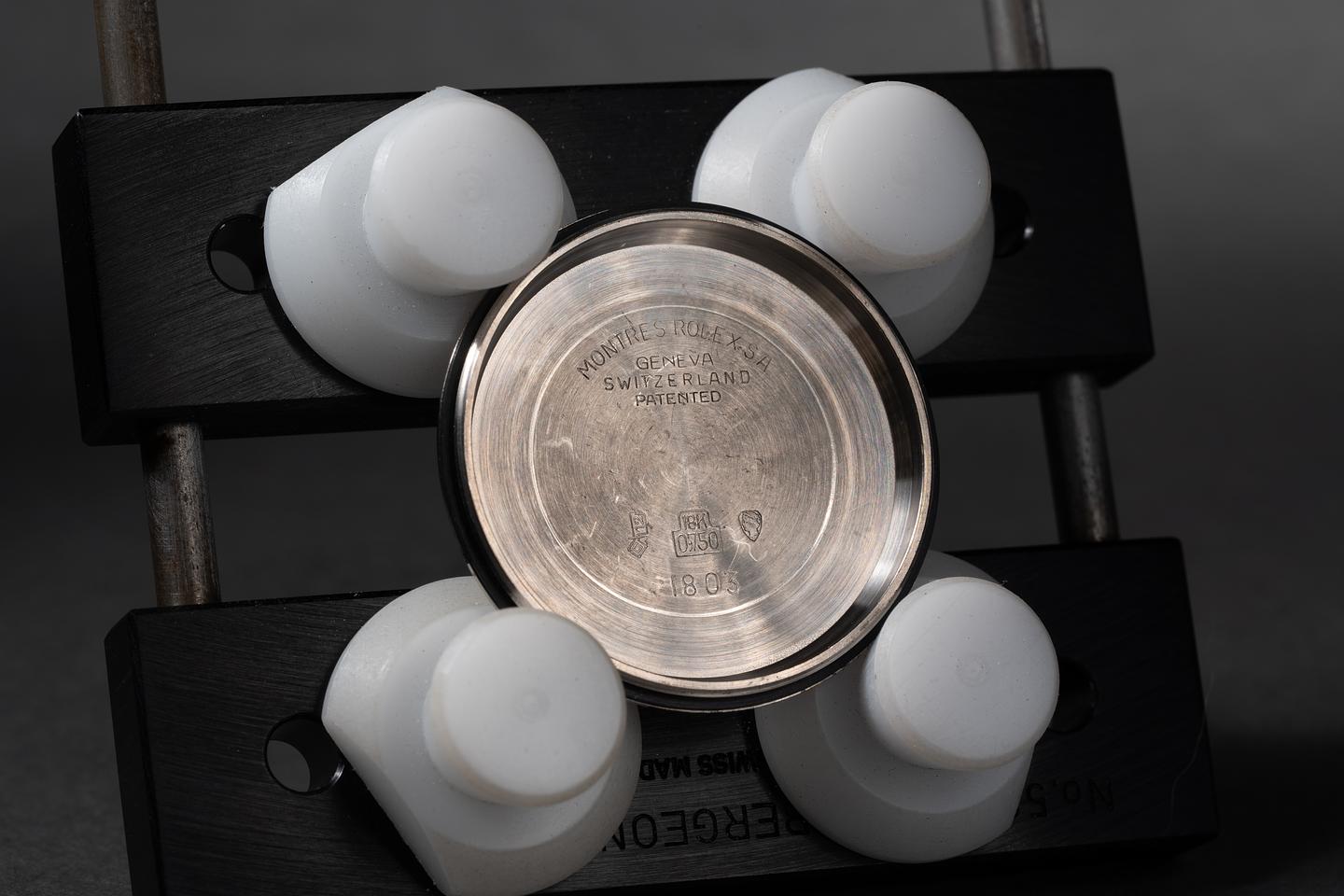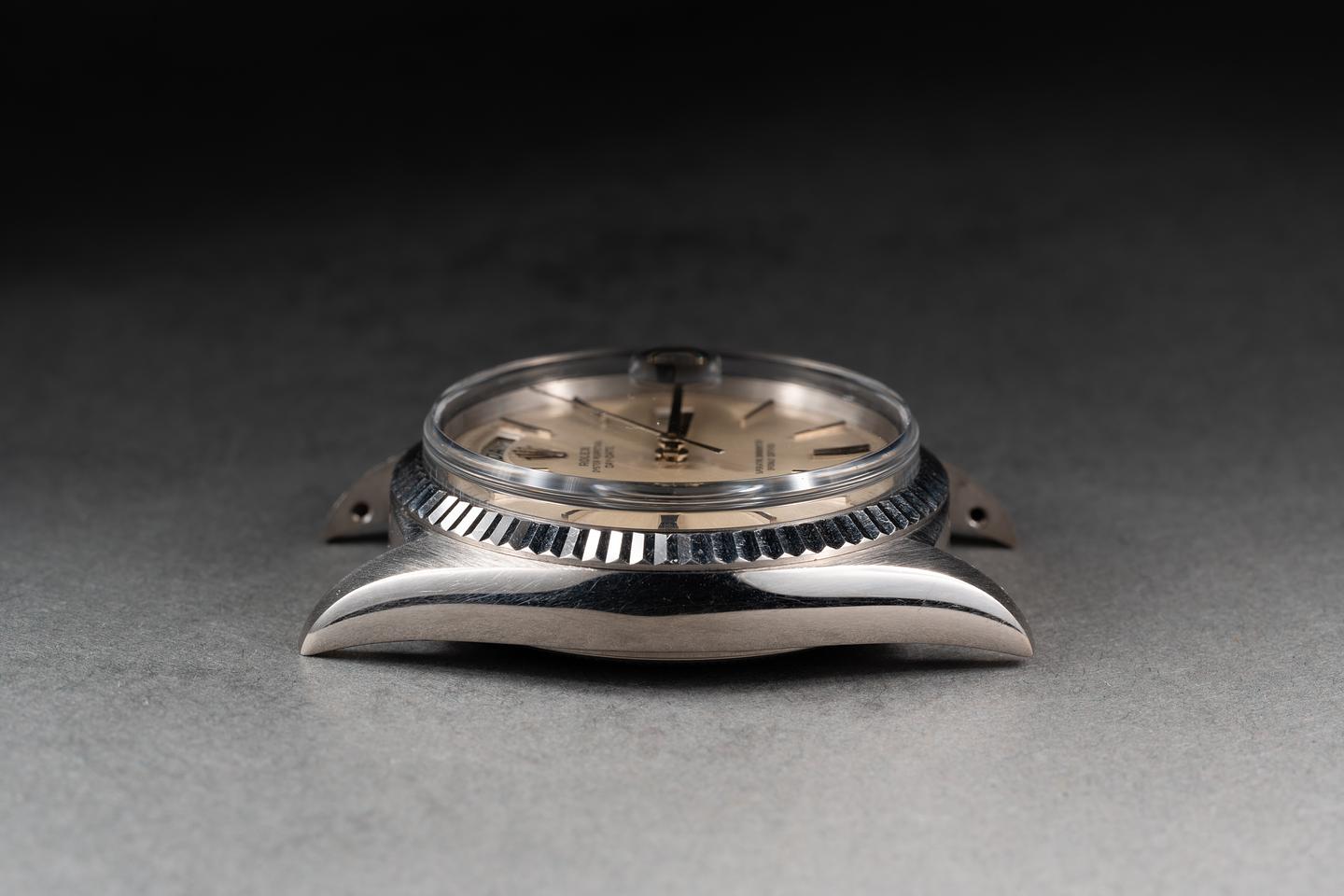Case: The sharp 18k white gold case is excellent showing only very light wear. The sharp 18k white gold fluted bezel is also in excellent condition showing only very light wear.