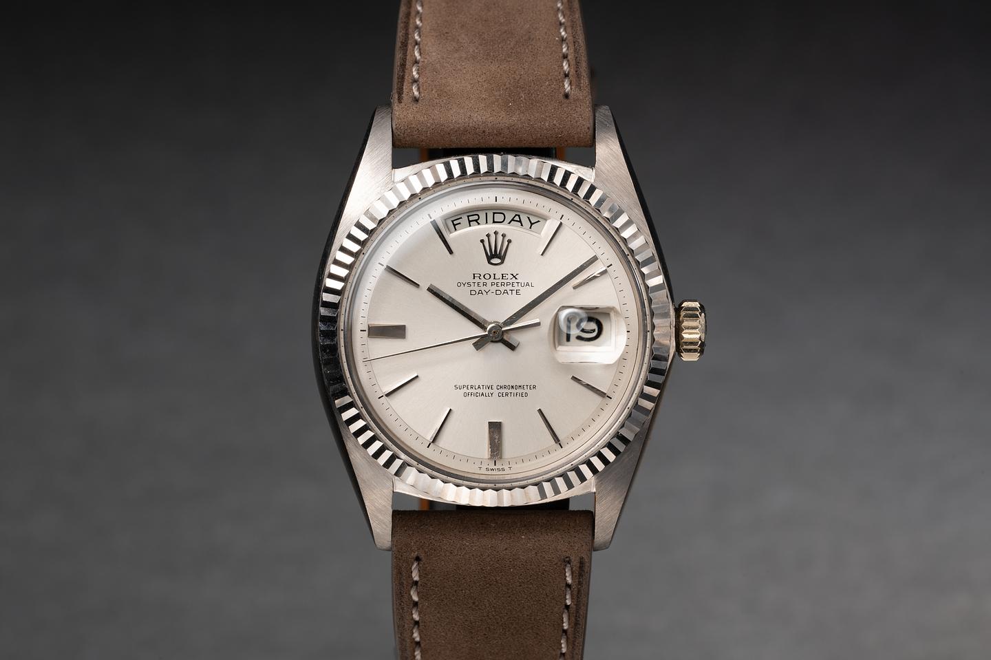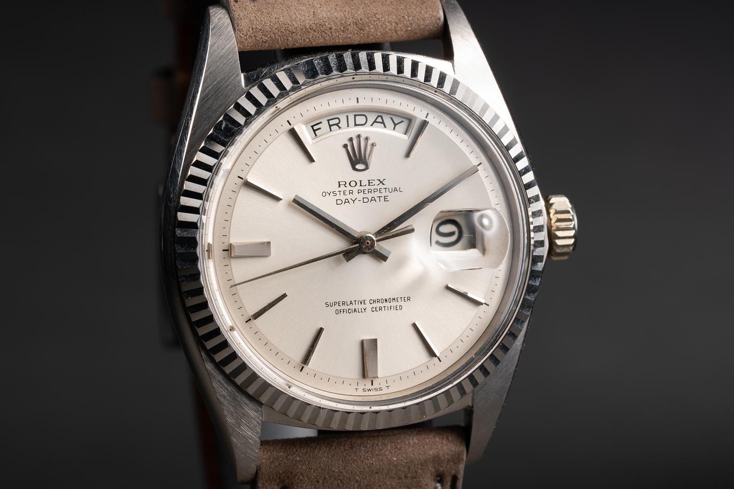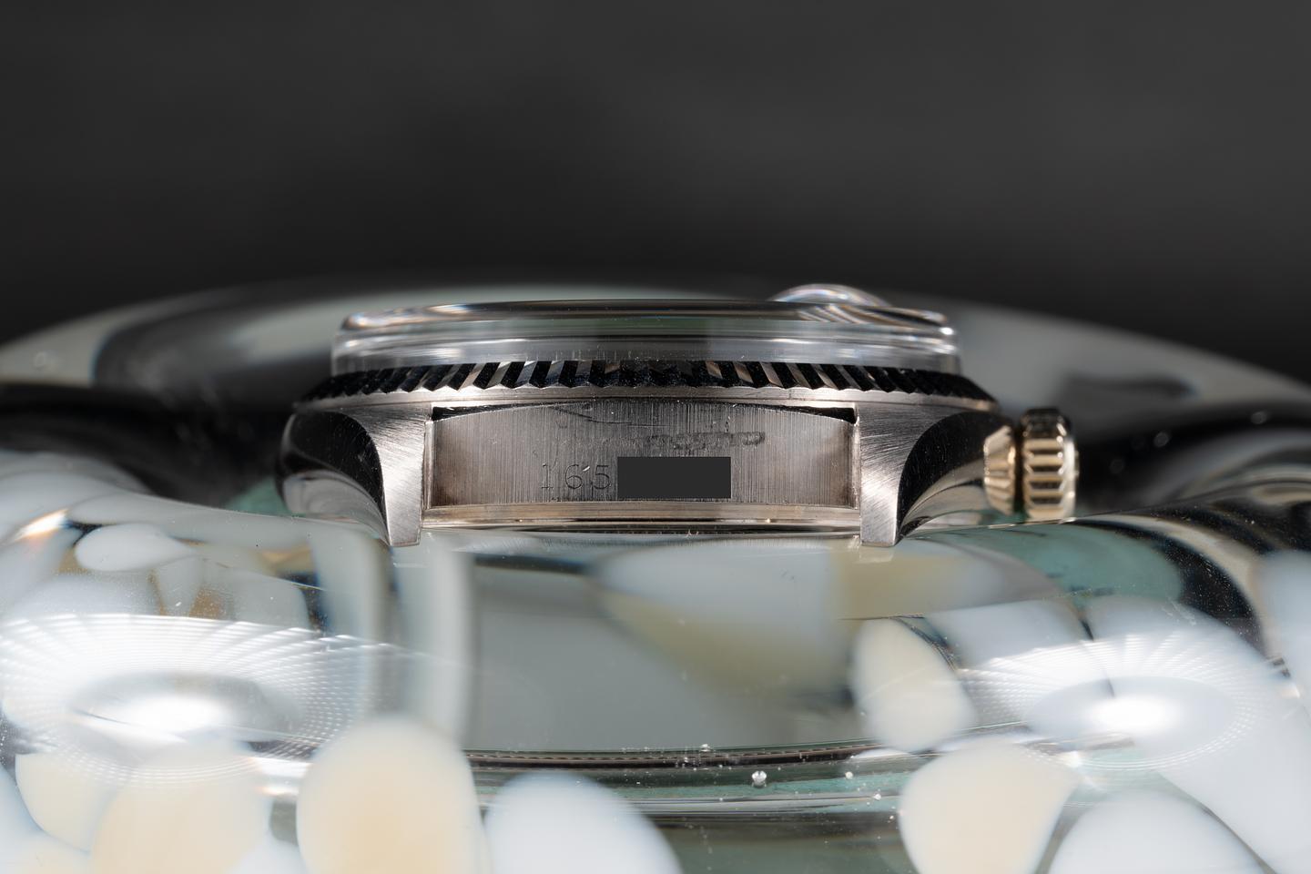 Case: The sharp 18k white gold case is excellent showing only very light wear. The sharp 18k white gold fluted bezel is also in excellent condition showing only very light wear.