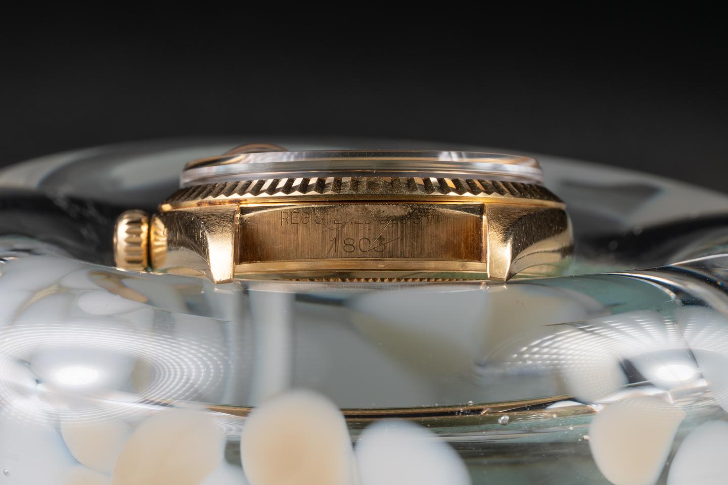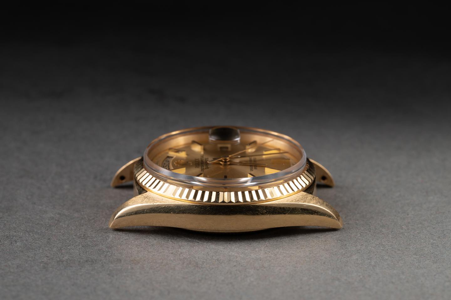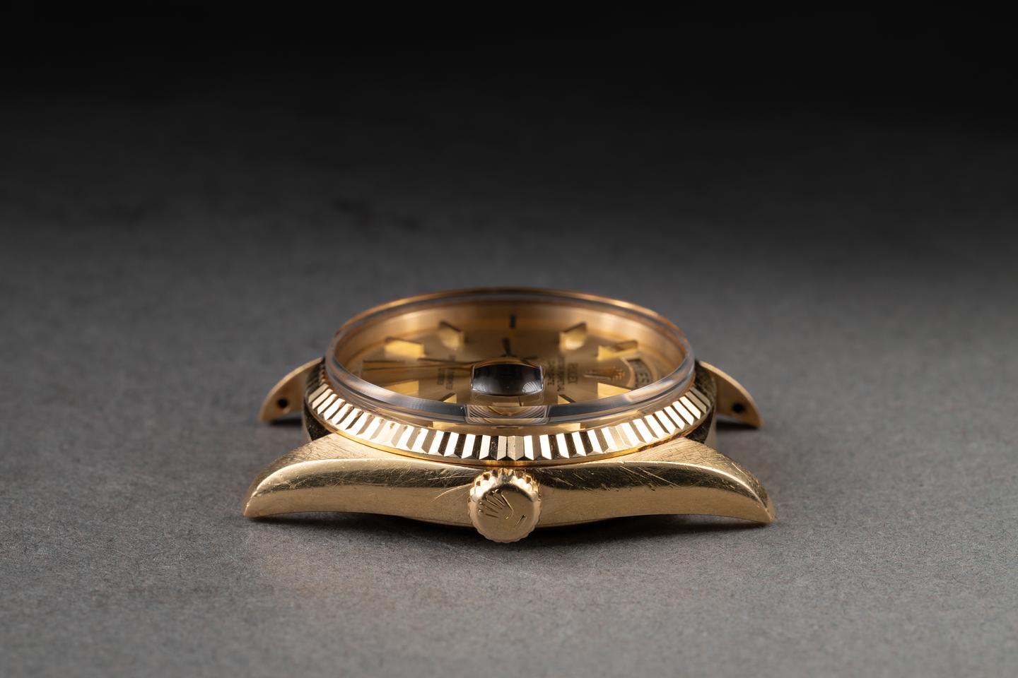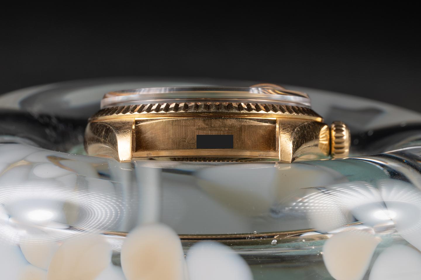 Case: The thick, sharp, and even 18K yellow gold case is excellent, showing some light wear from use. The sharp 18K yellow gold fluted bezel is also in excellent condition, showing some light wear from use.