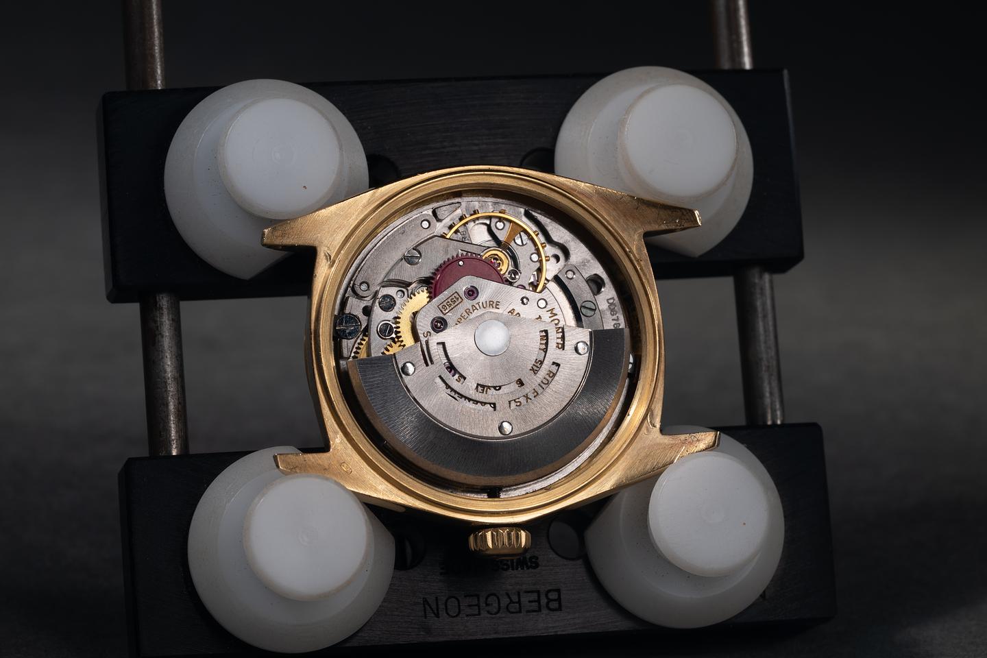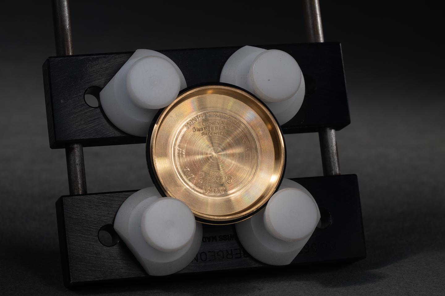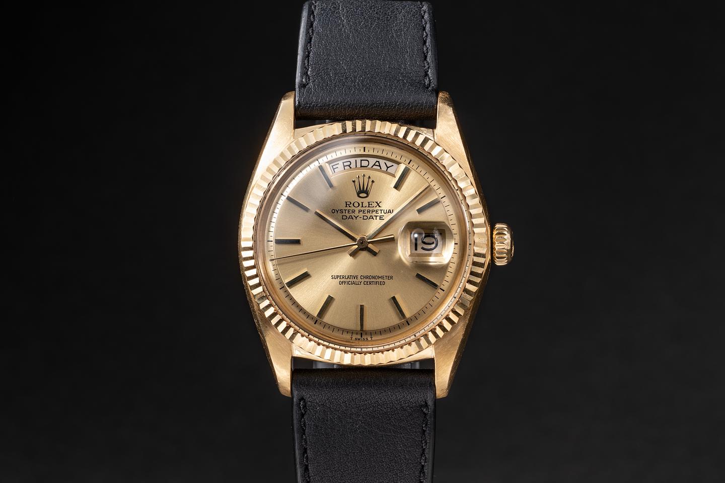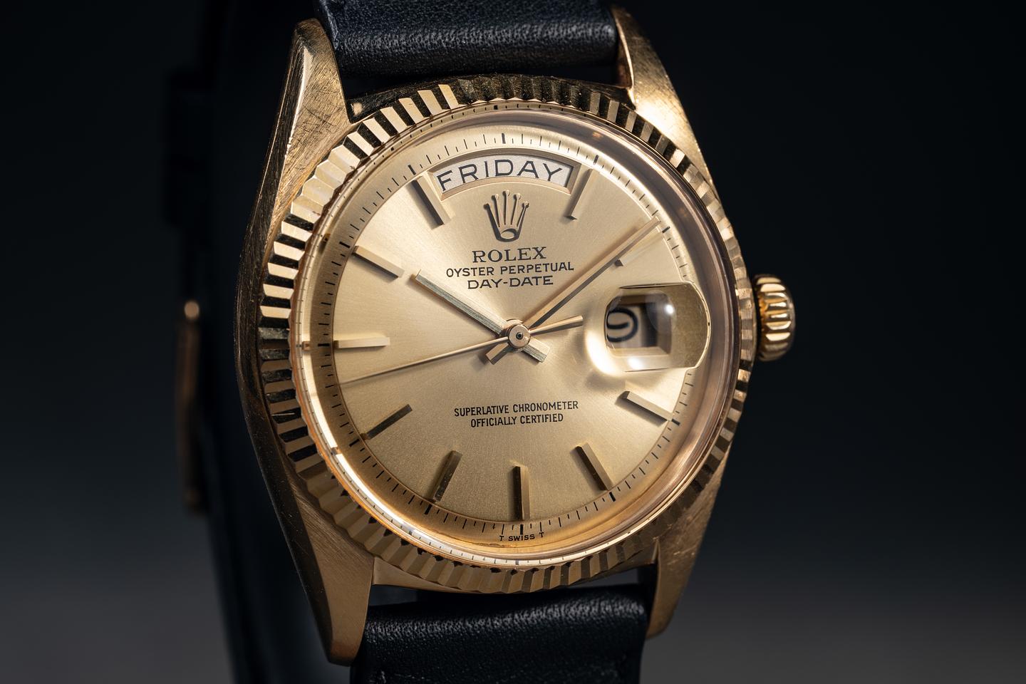 Case: The thick, sharp, and even 18K yellow gold case is excellent, showing some light wear from use. The sharp 18K yellow gold fluted bezel is also in excellent condition, showing some light wear from use.