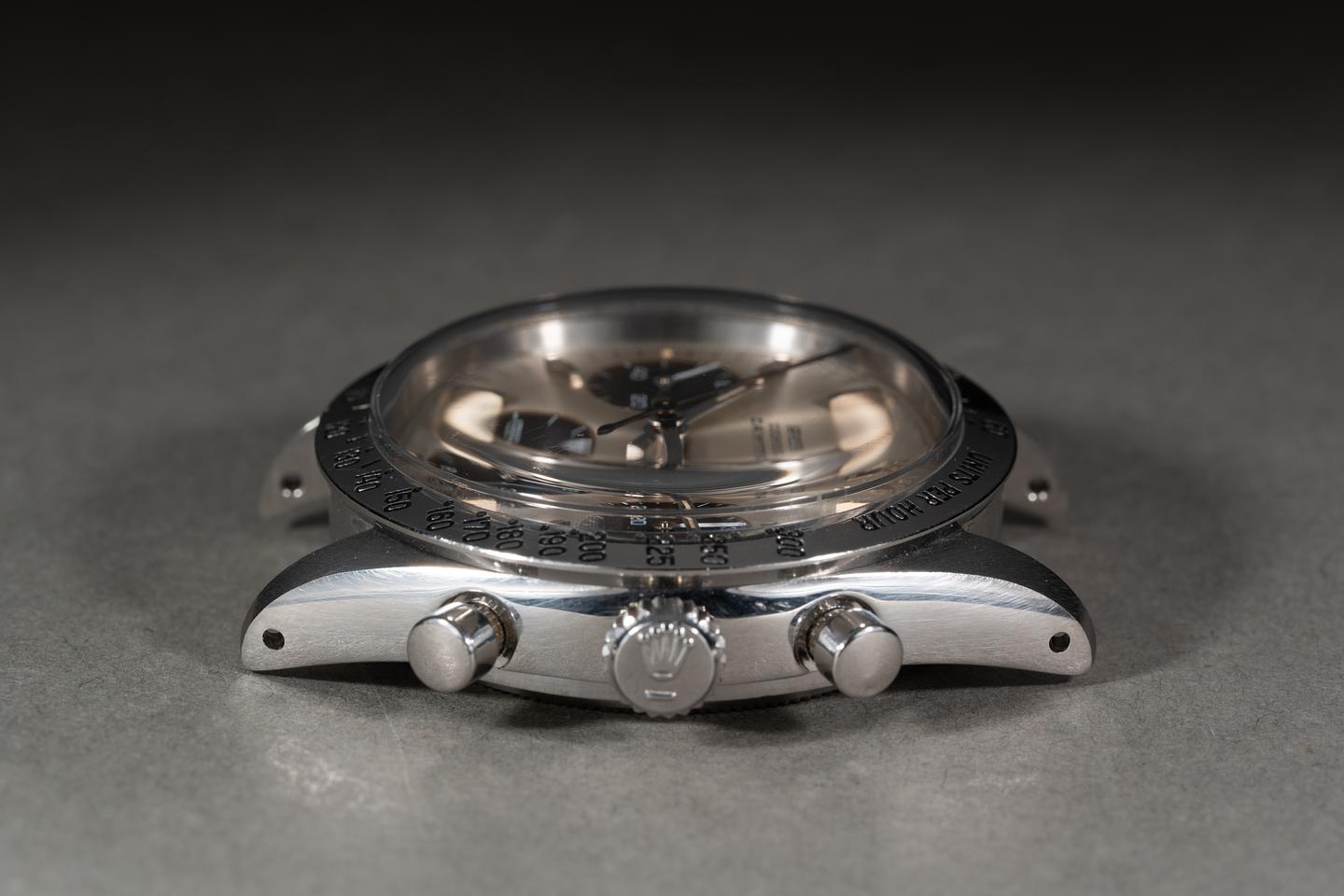 Dial: The silver dial is excellent showing little if any wear for its age. The black subdials are also in excellent condition and are beginning to turn tropical. All lume plots are present and intact. The lume has aged to a warm creamy hue and the hands match perfectly. All lume glows brightly when exposed to UV and falls off rapidly at the same rate.