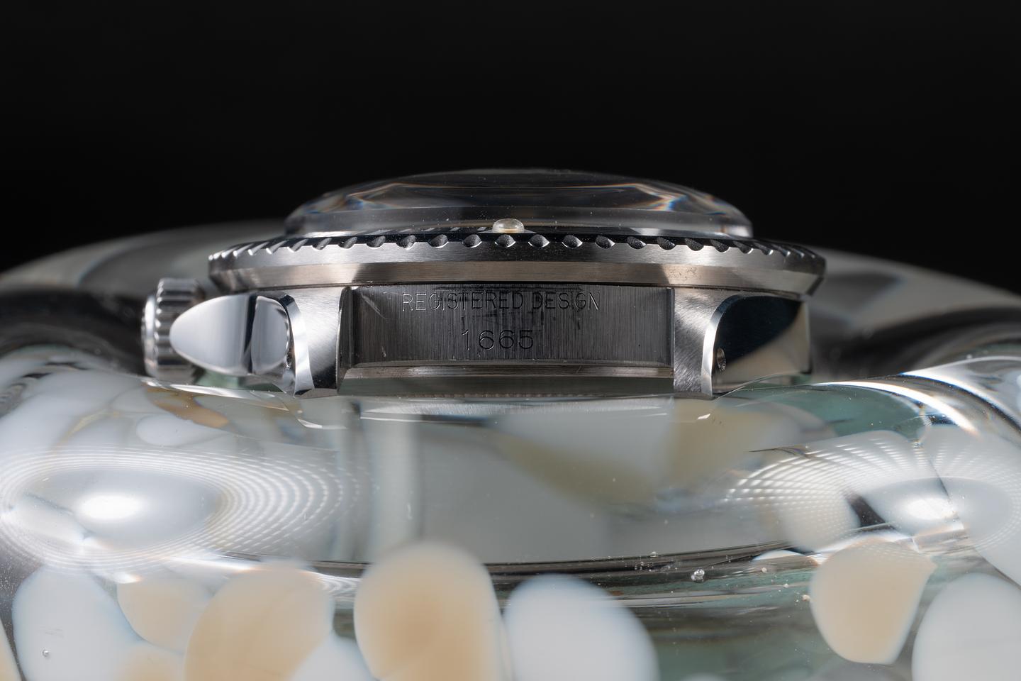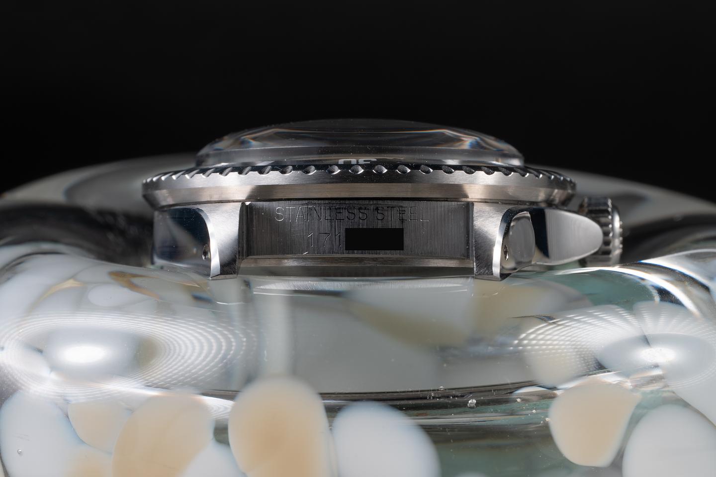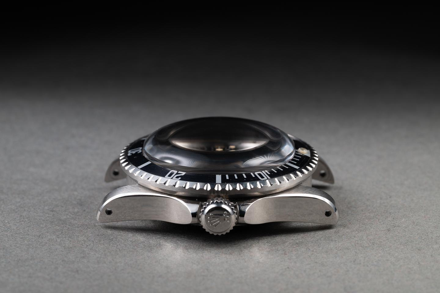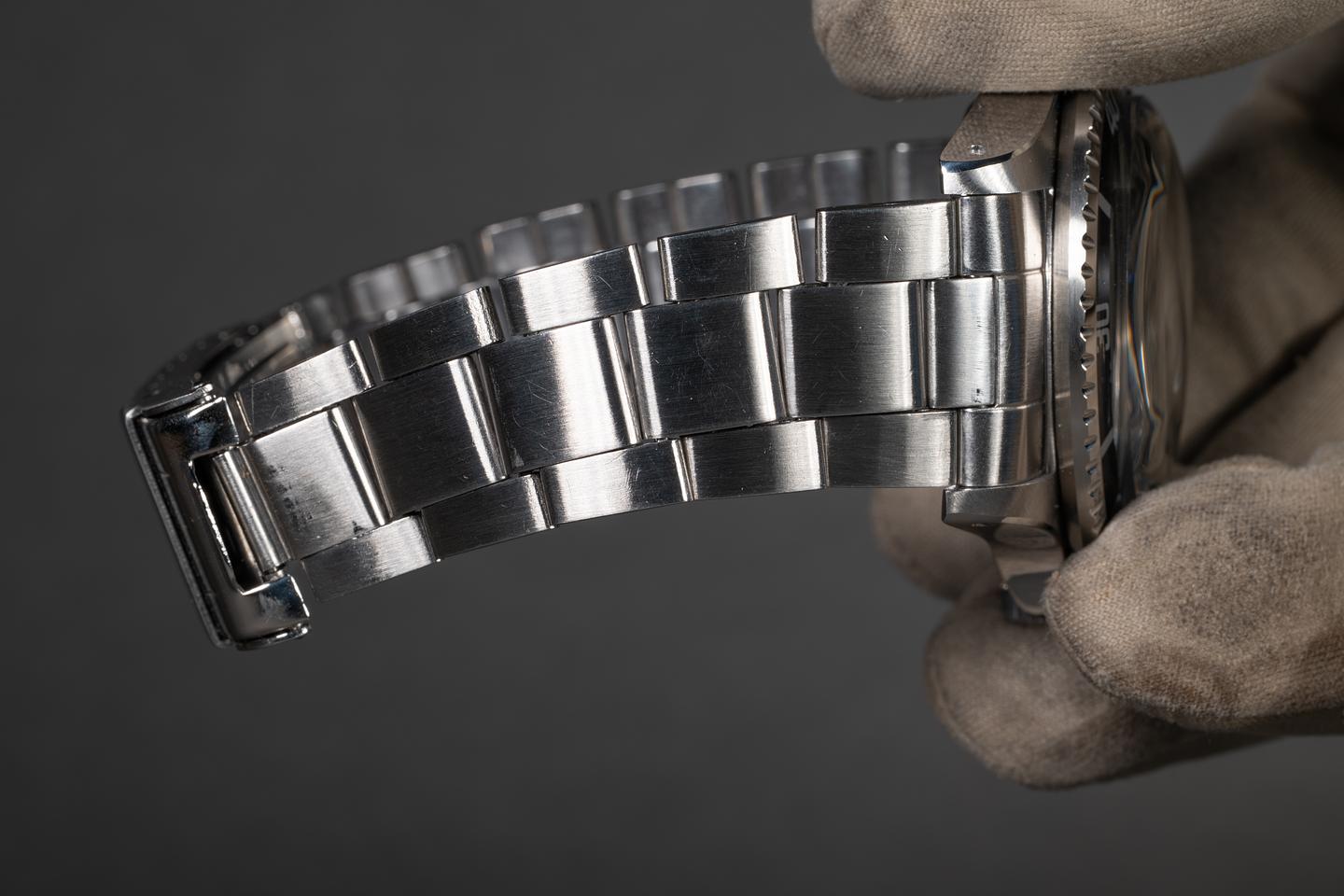Case: The recently polished case is excellent, showing wide, sharp, prominent bevels and only light wear from use. The bezel insert is also in excellent condition and has aged to a dark navy blue hue, showing only light wear from use.