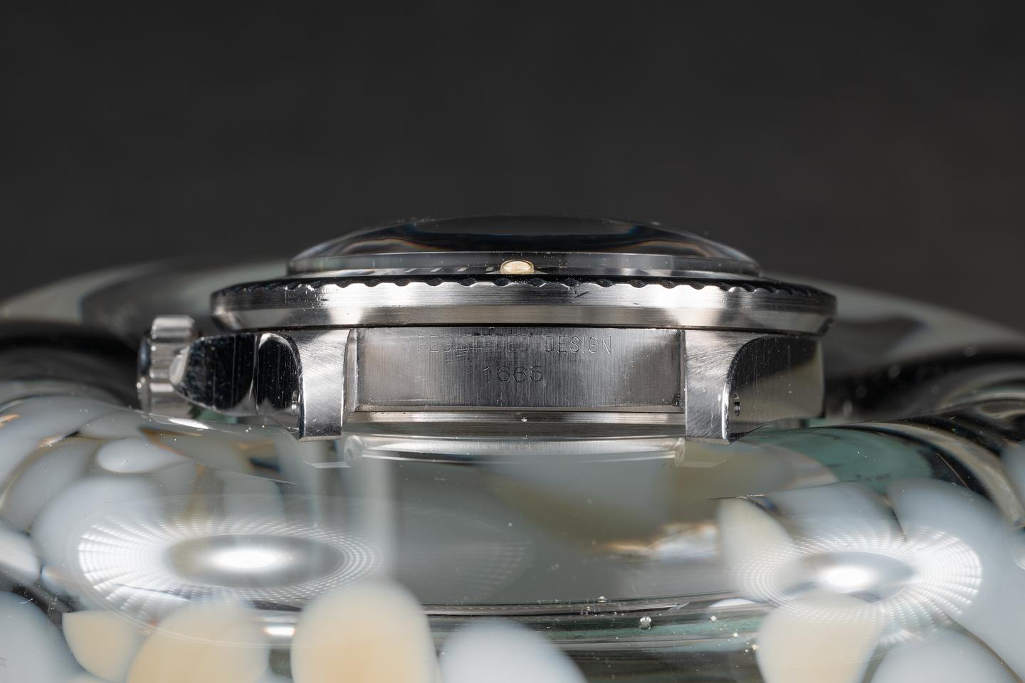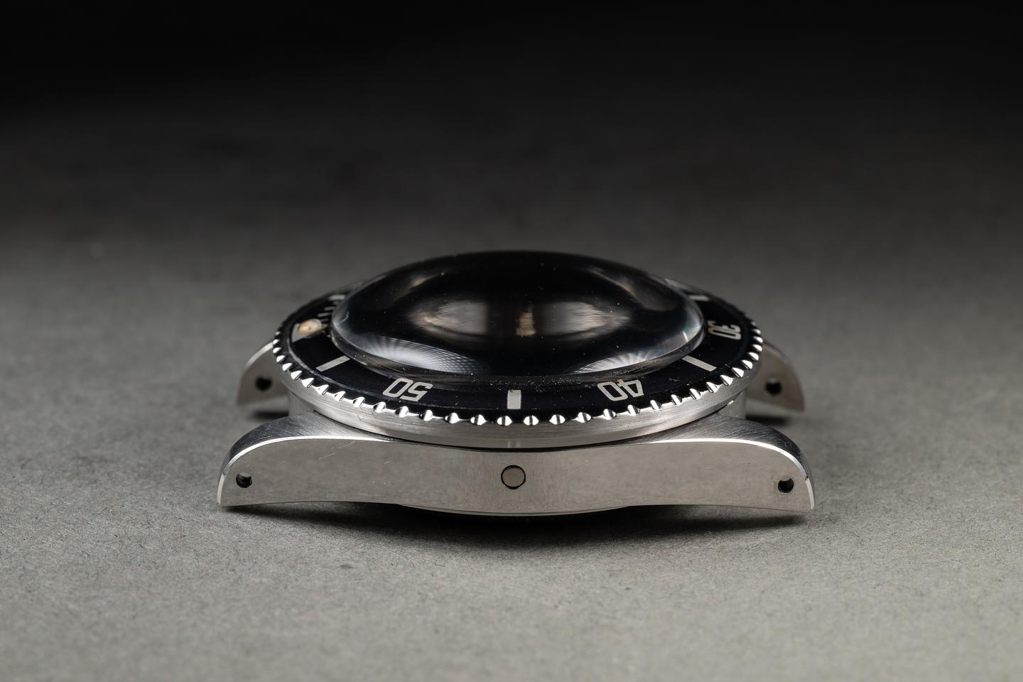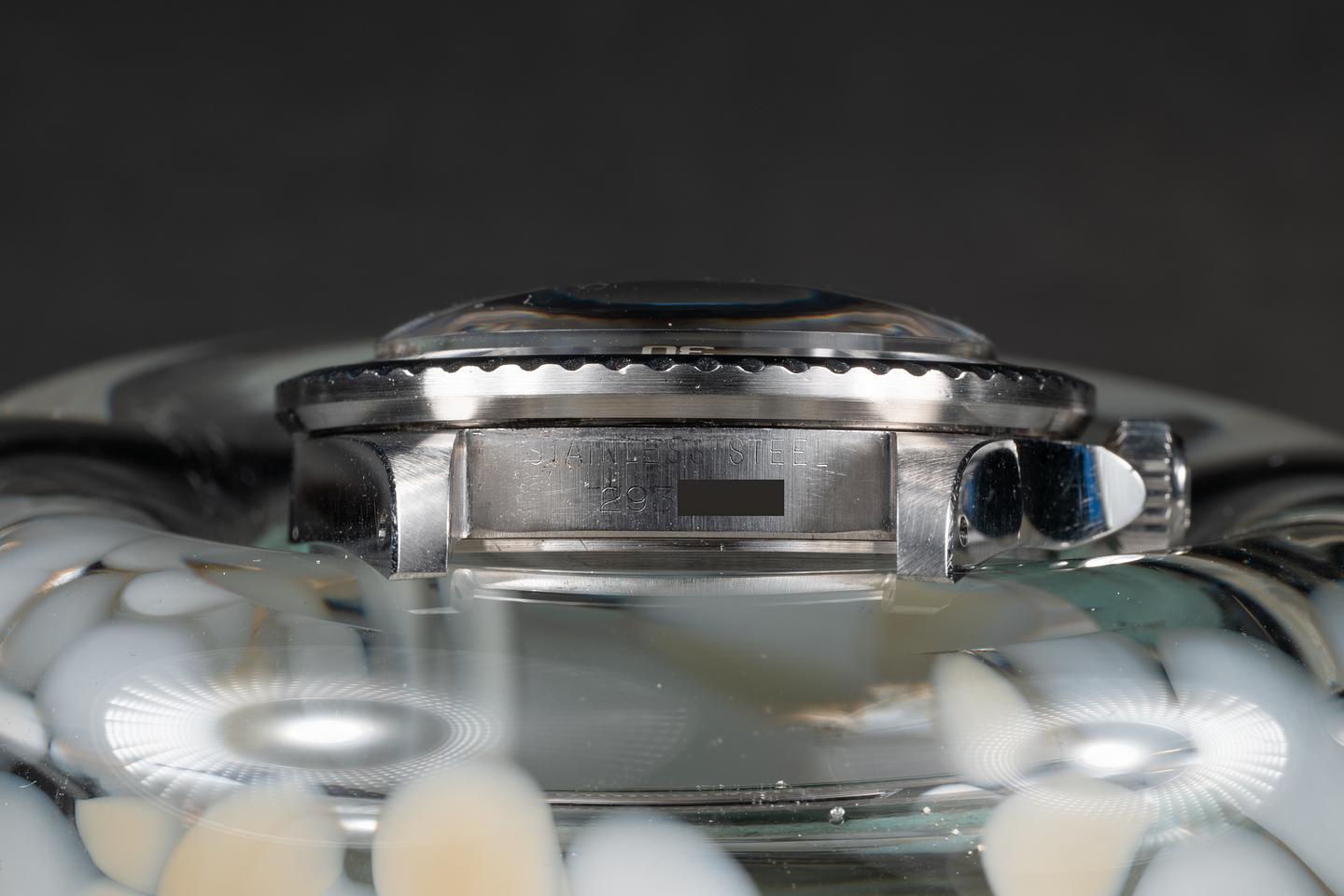 Case: The thick and even case has recently been polished, showing sharp prominent bevels and only very light wear. The bezel insert is also in excellent condition and has faded to a navy blue hue, showing only light wear from use. The pearl has aged to a warm creamy hue.