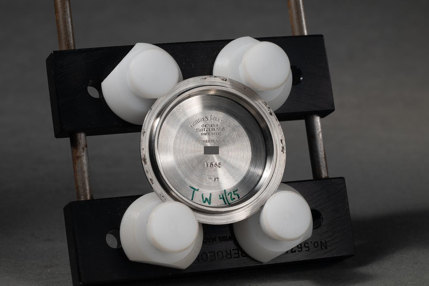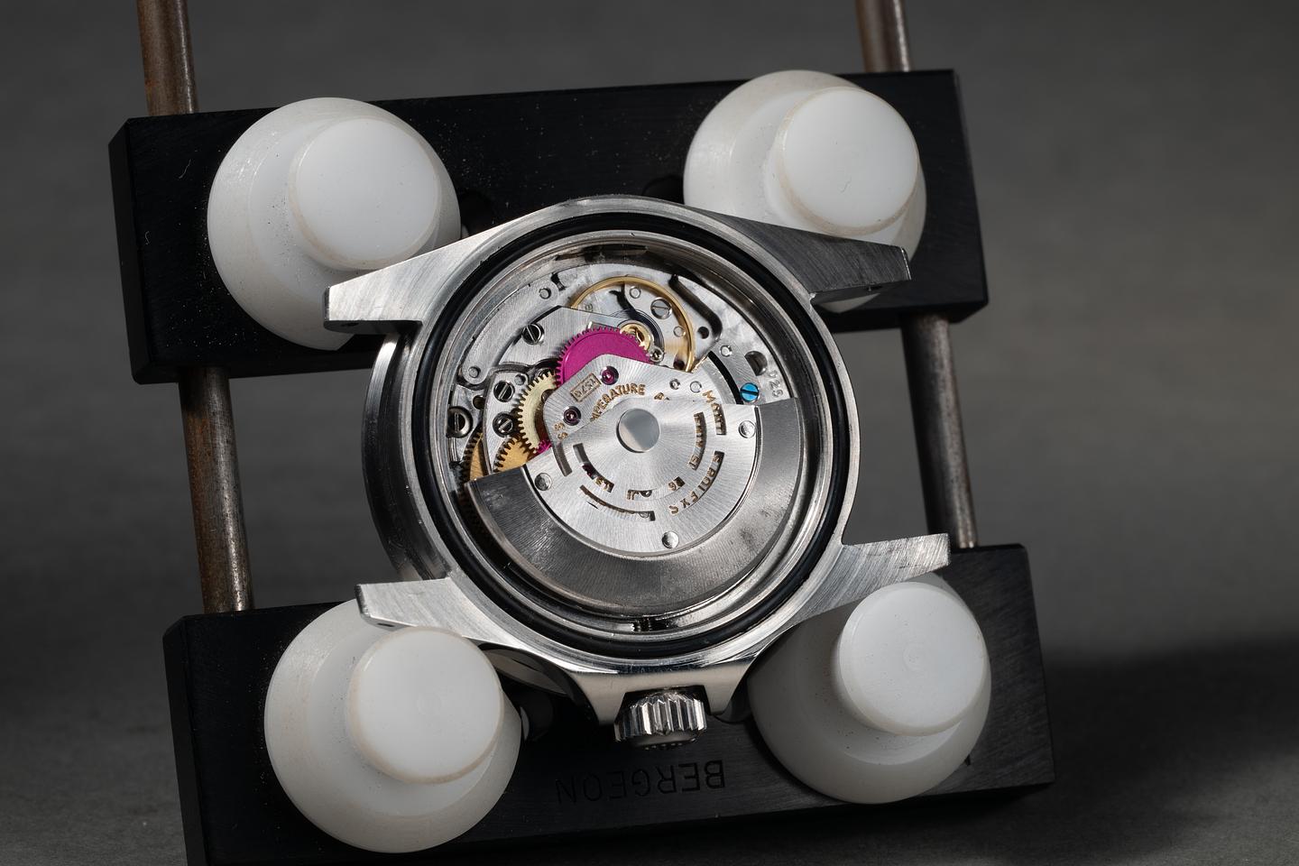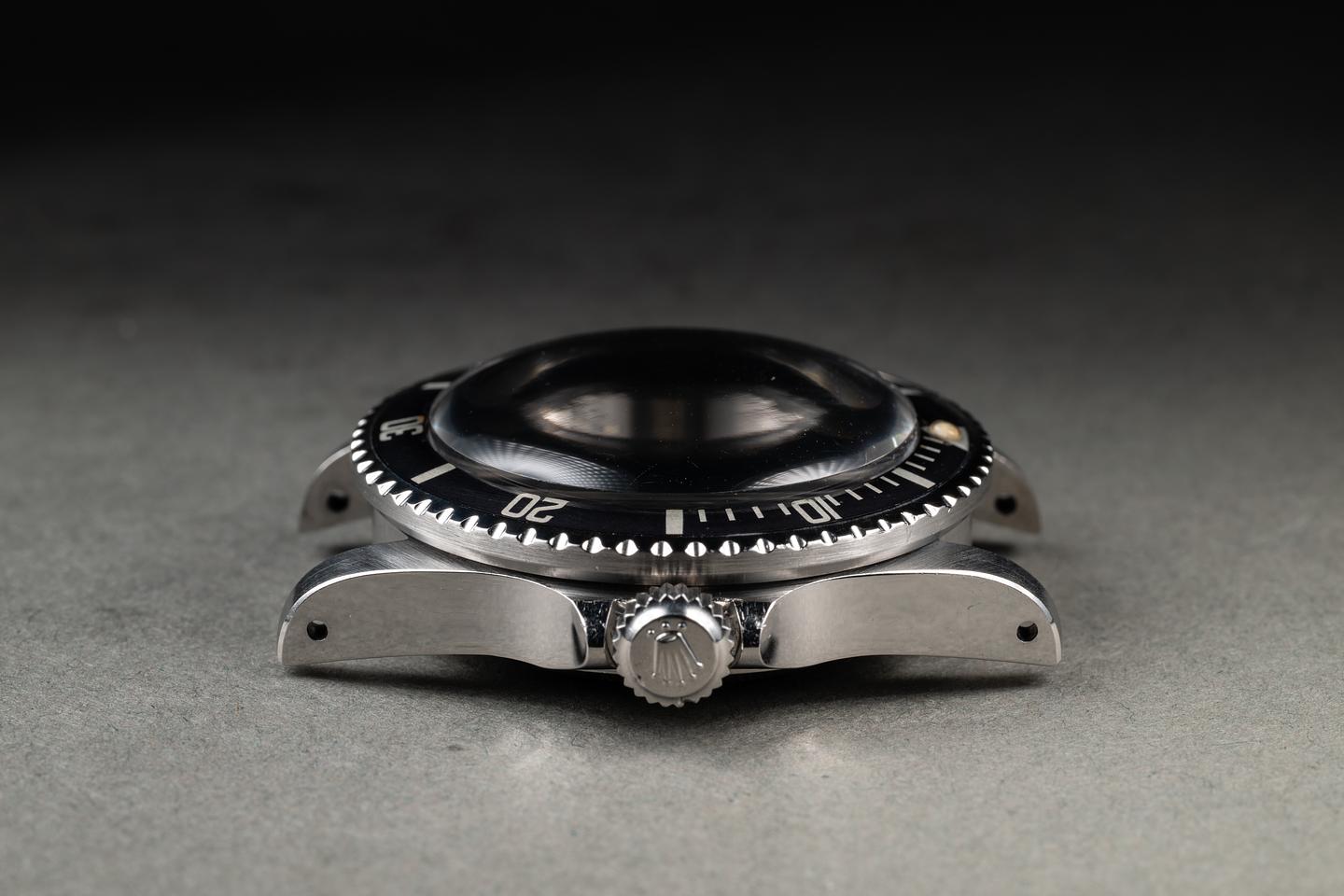 Case: The thick and even case has recently been polished, showing sharp prominent bevels and only very light wear. The bezel insert is also in excellent condition and has faded to a navy blue hue, showing only light wear from use. The pearl has aged to a warm creamy hue.