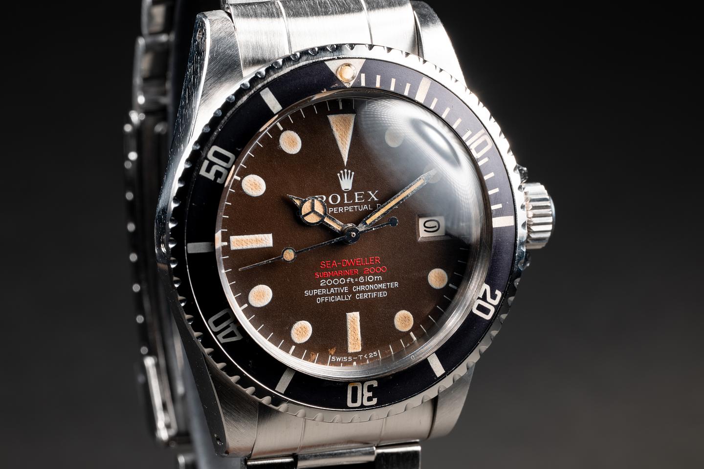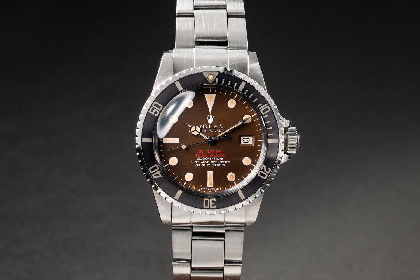 Dial: The MK 2 Double Red dial has aged to a chocolate brown tropical patina, showing only very light wear for its age. The lume is aging with a graduated "toasted marshmallow" patina, with the lume gradually turning warmer towards the center of the plot. The hands match with the warmer portion of the lume on the dial.
