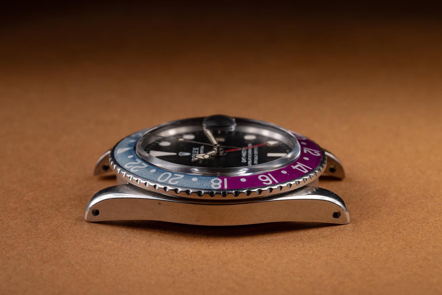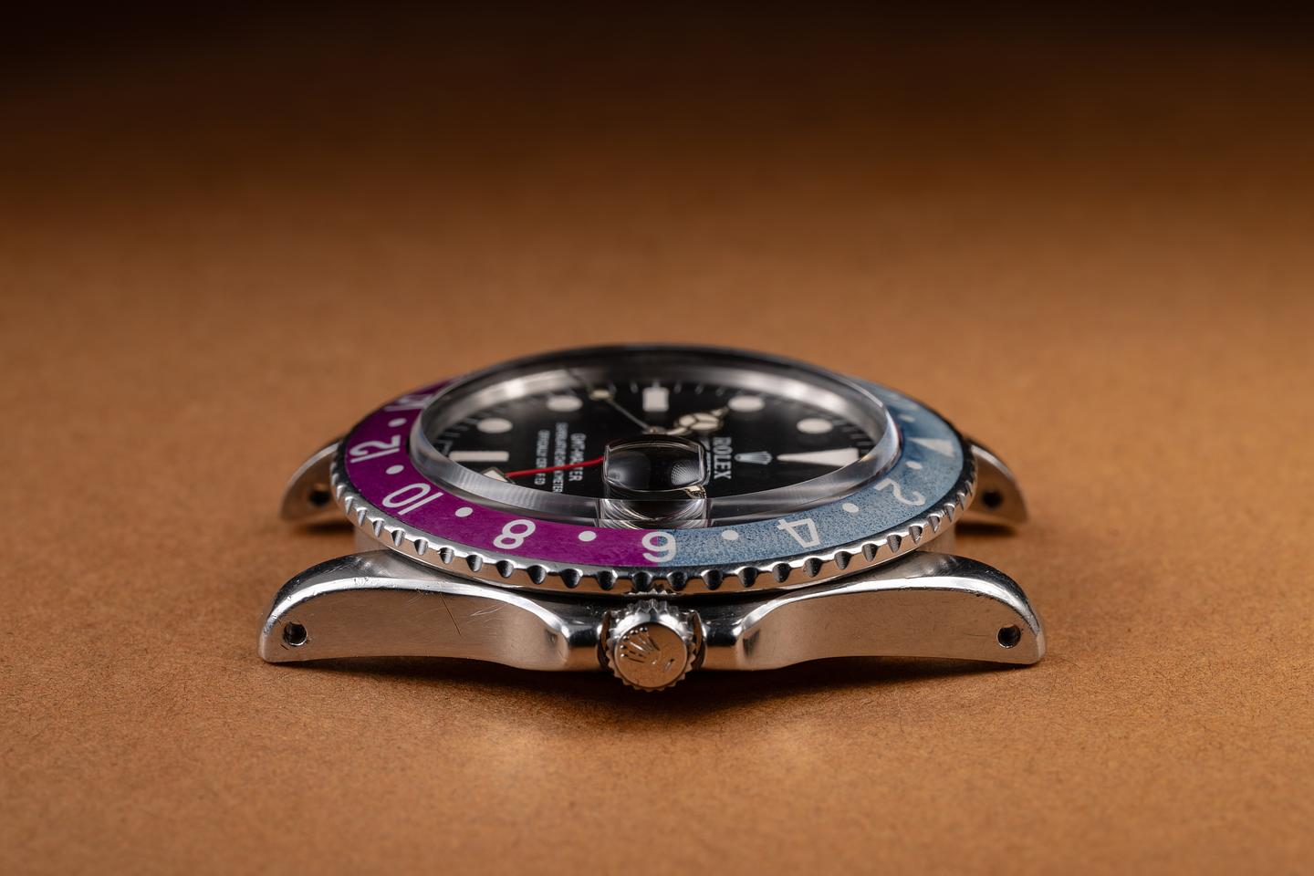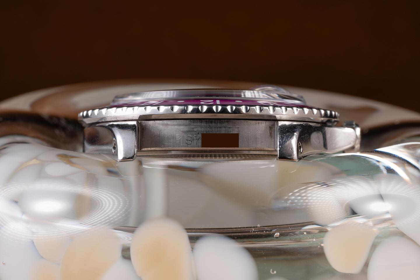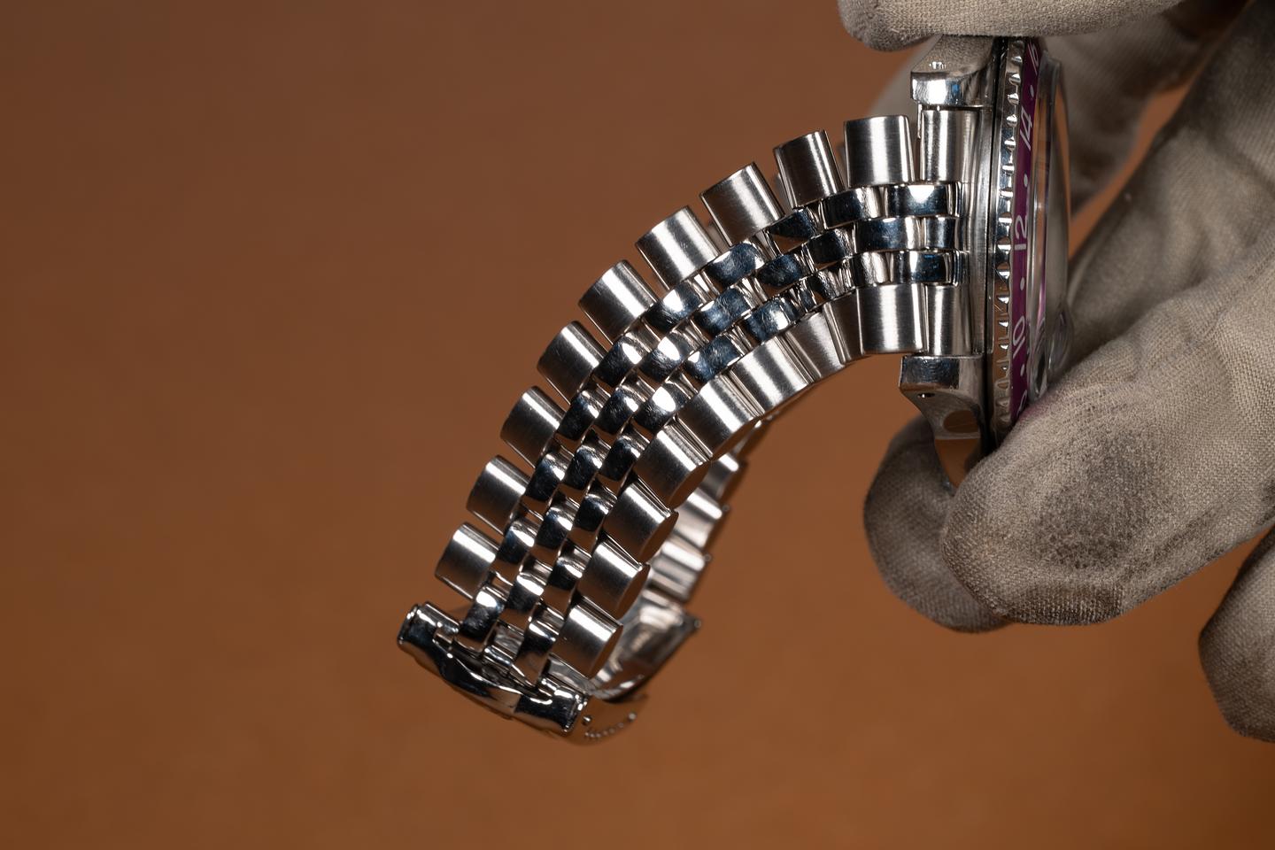 Case: The thick and even case is excellent, showing a sleeve polished finish, and light to average wear from use. The bezel insert is also in excellent condition showing only light wear from use. The blue portion of the insert has faded to a light silver-blue, while the red portion has faded to a vibrant fuchsia hue.