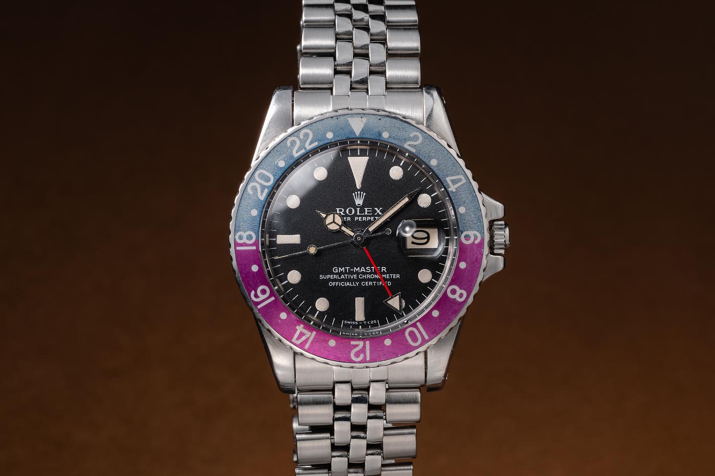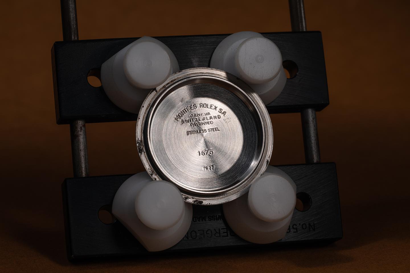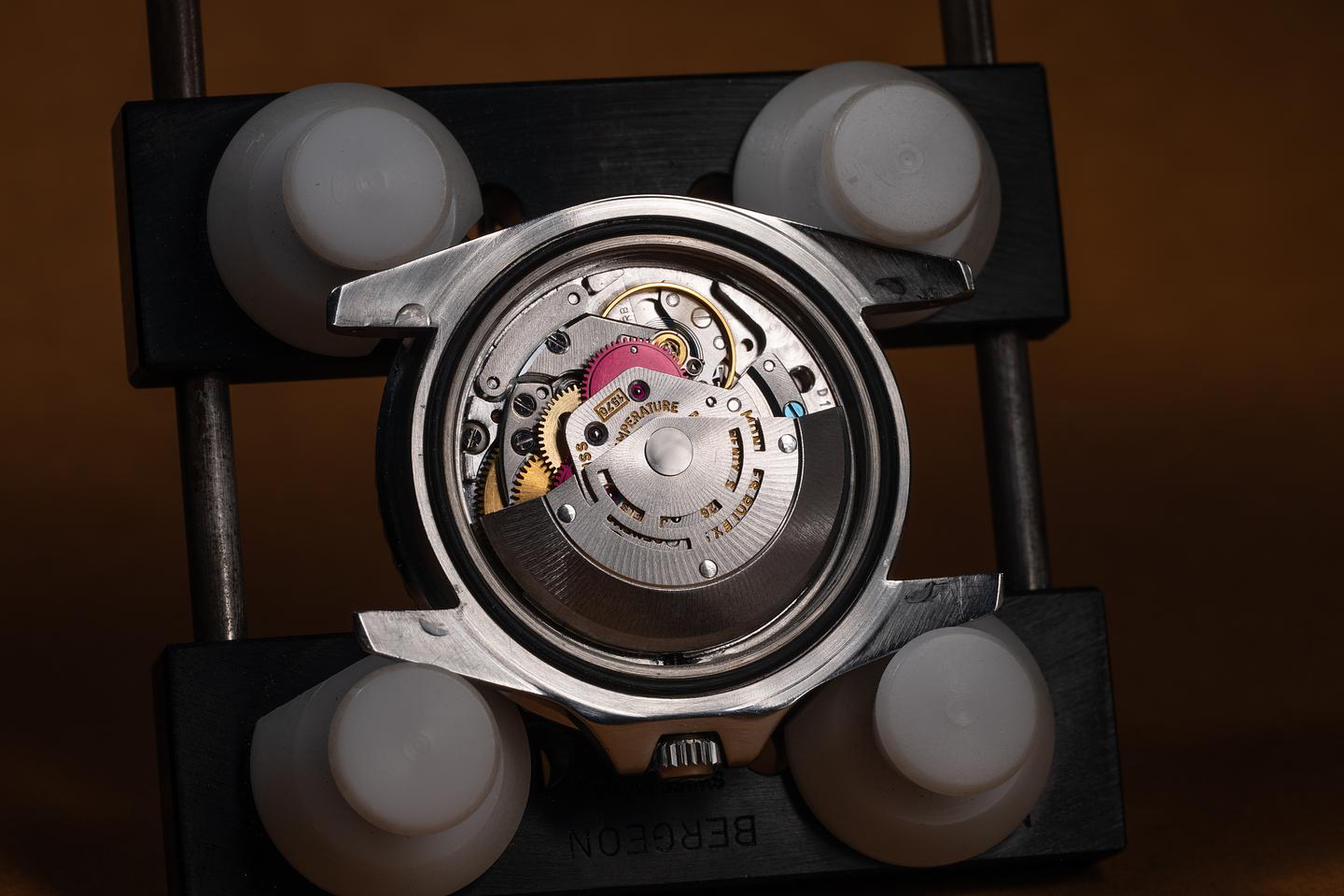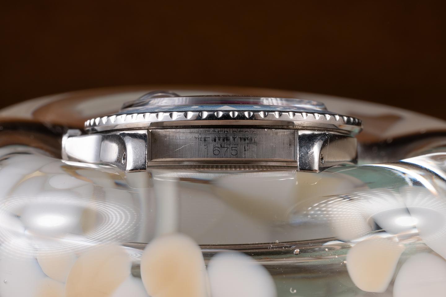 Case: The thick and even case is excellent, showing a sleeve polished finish, and light to average wear from use. The bezel insert is also in excellent condition showing only light wear from use. The blue portion of the insert has faded to a light silver-blue, while the red portion has faded to a vibrant fuchsia hue.