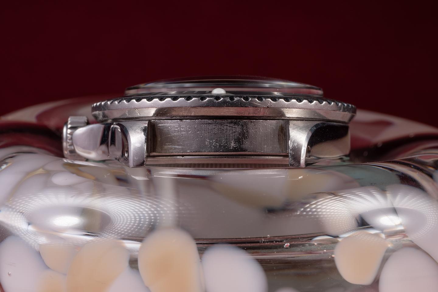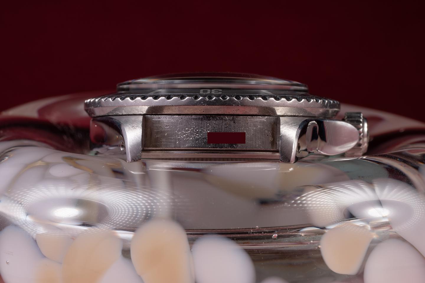 Case: The previously polished case is excellent, showing sharp, prominent bevels and some light wear from use. The bezel insert has aged to a light silvery grey, showing only light wear from use.