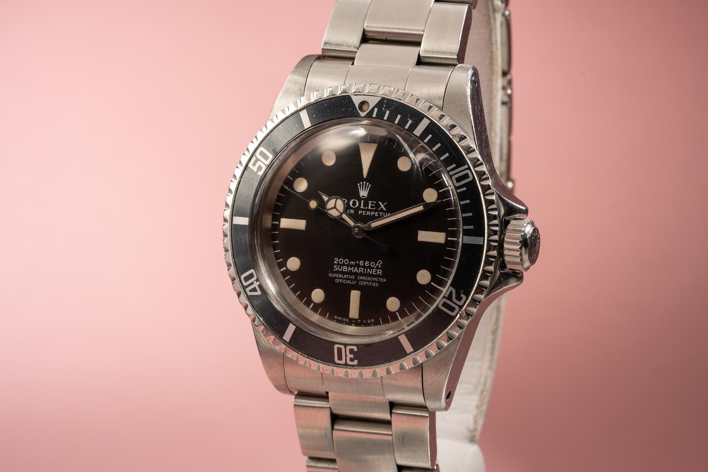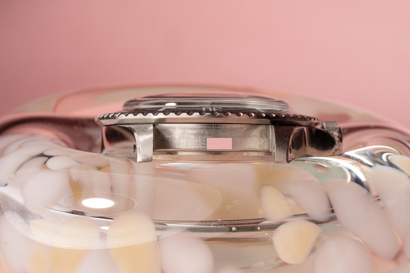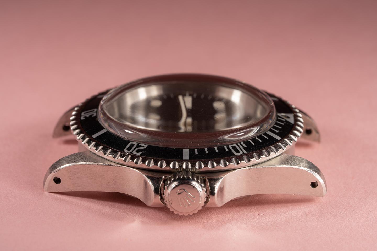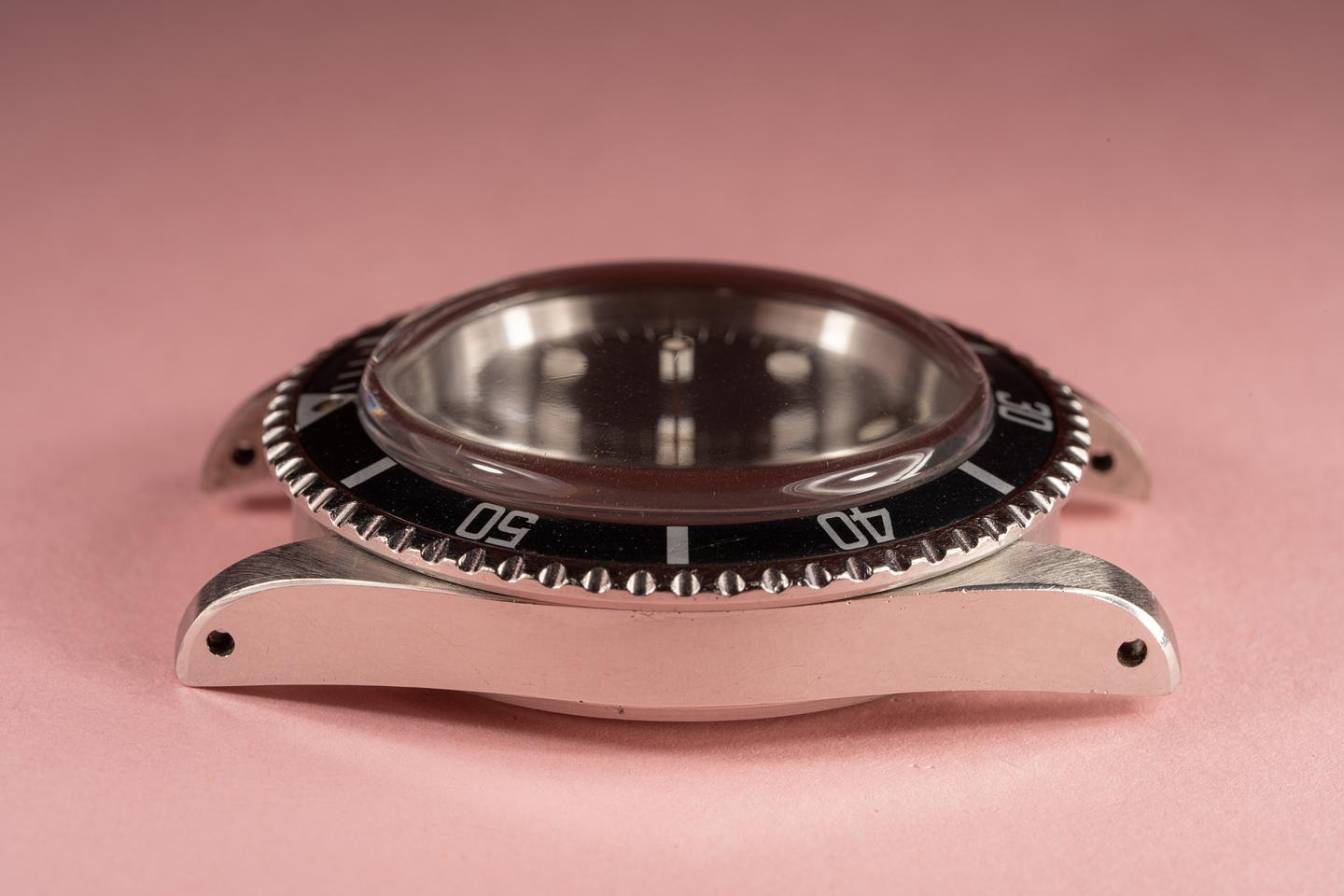 Case: The previously polished case is excellent and features sharp prominent bevels. The black bezel insert has faded to a matte charcoal grey and shows only light wear for its age.