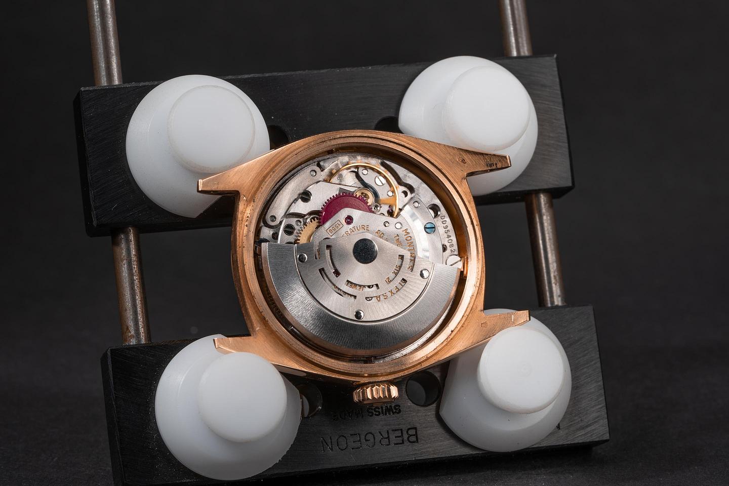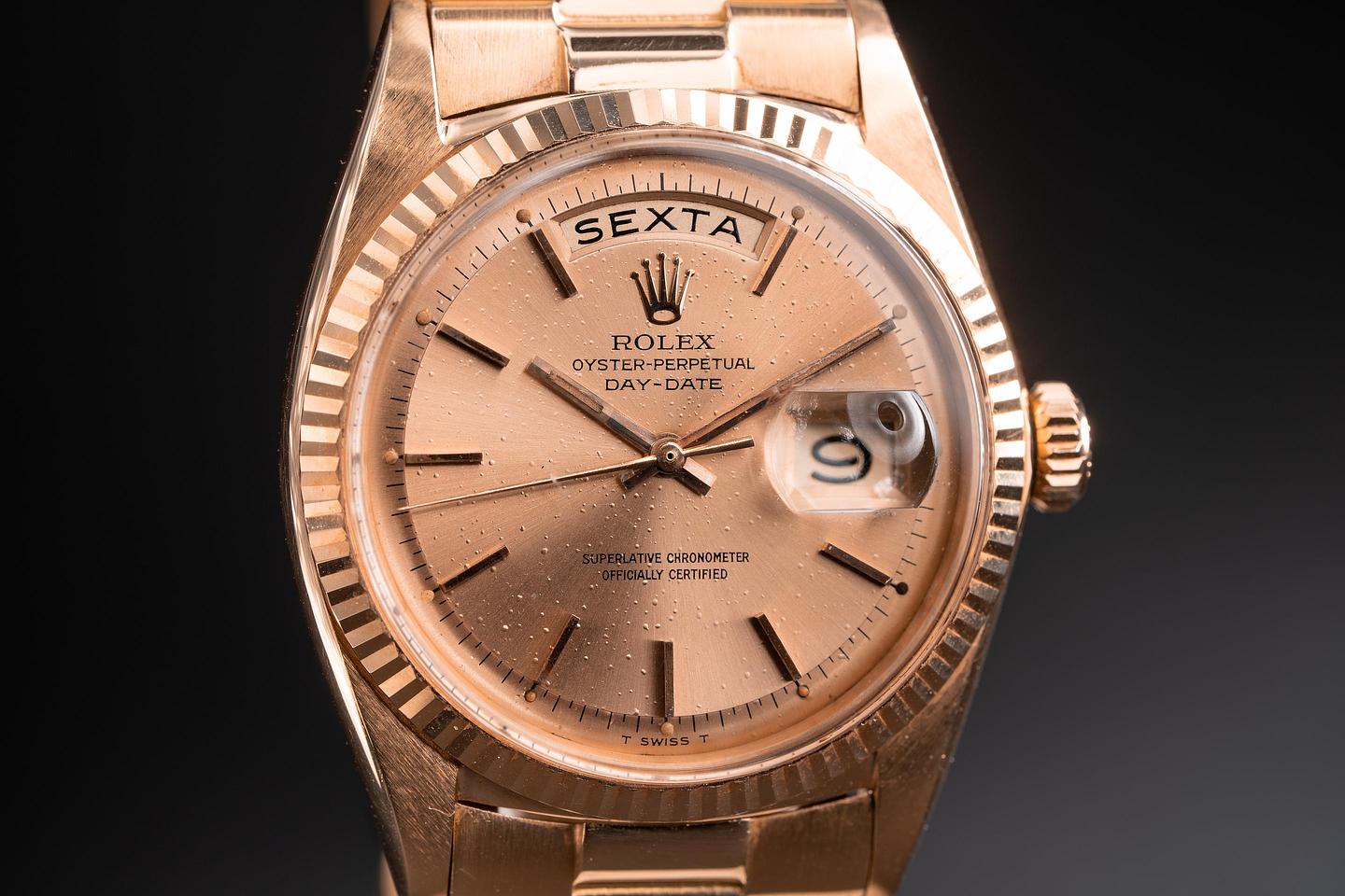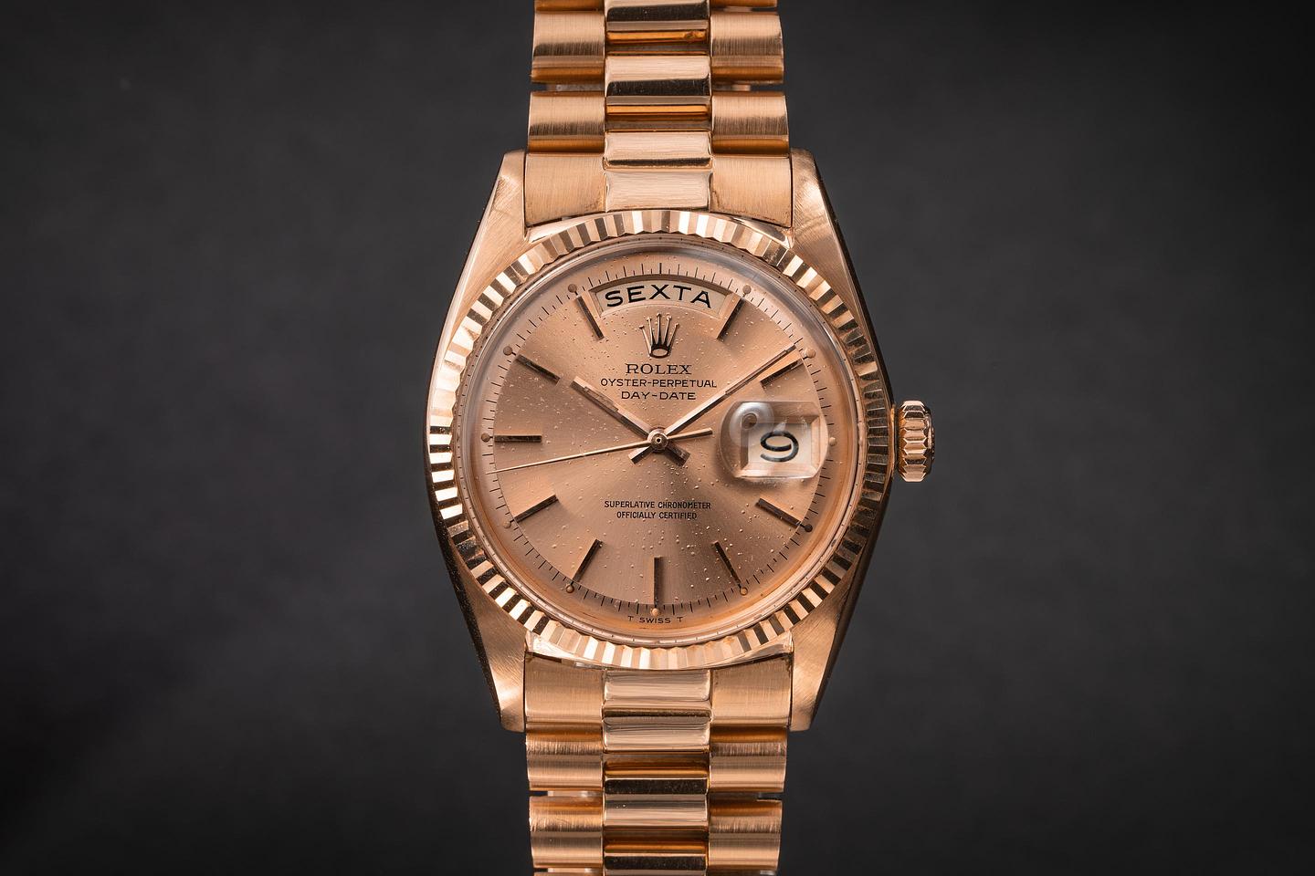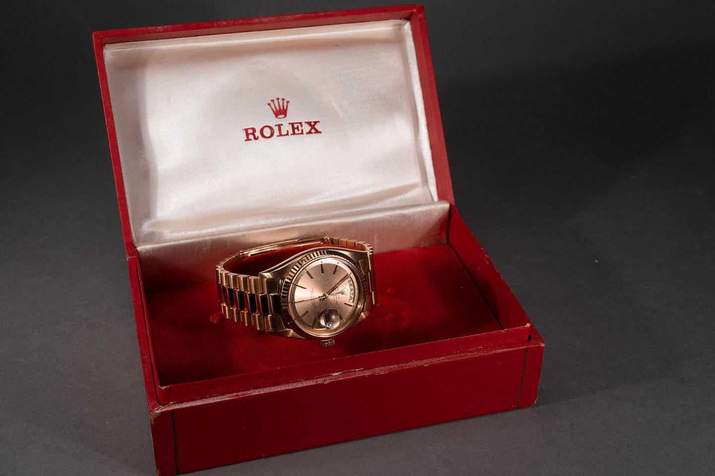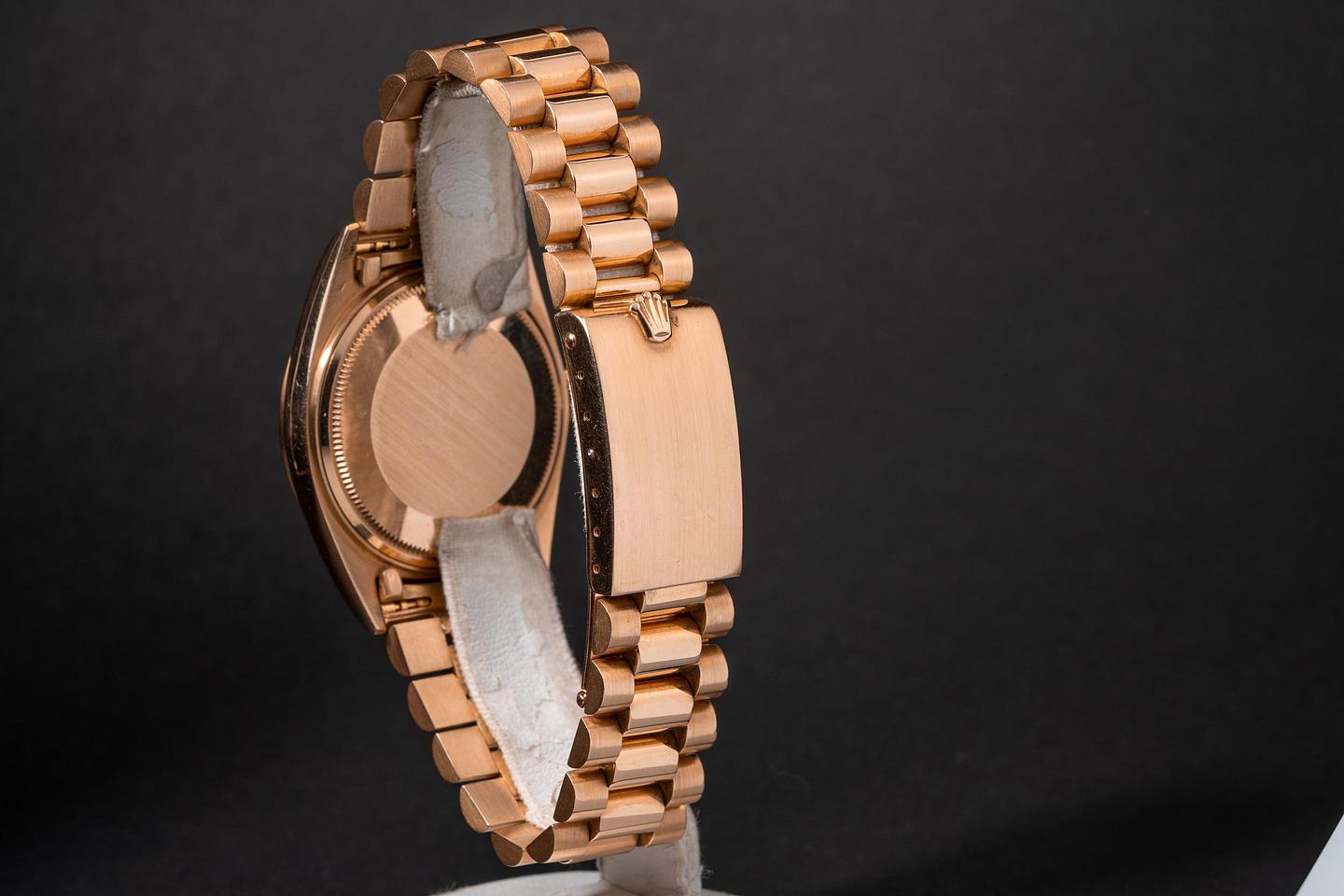 Bracelet: The 21 link 18k rose gold president bracelet is excellent showing only light stretch for its age. The clasp is stamped with a 1970 date code.