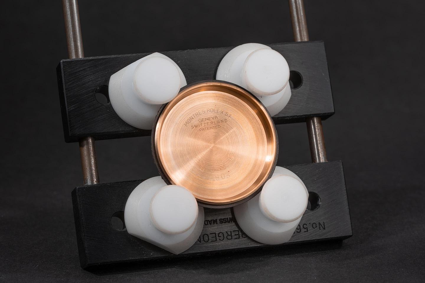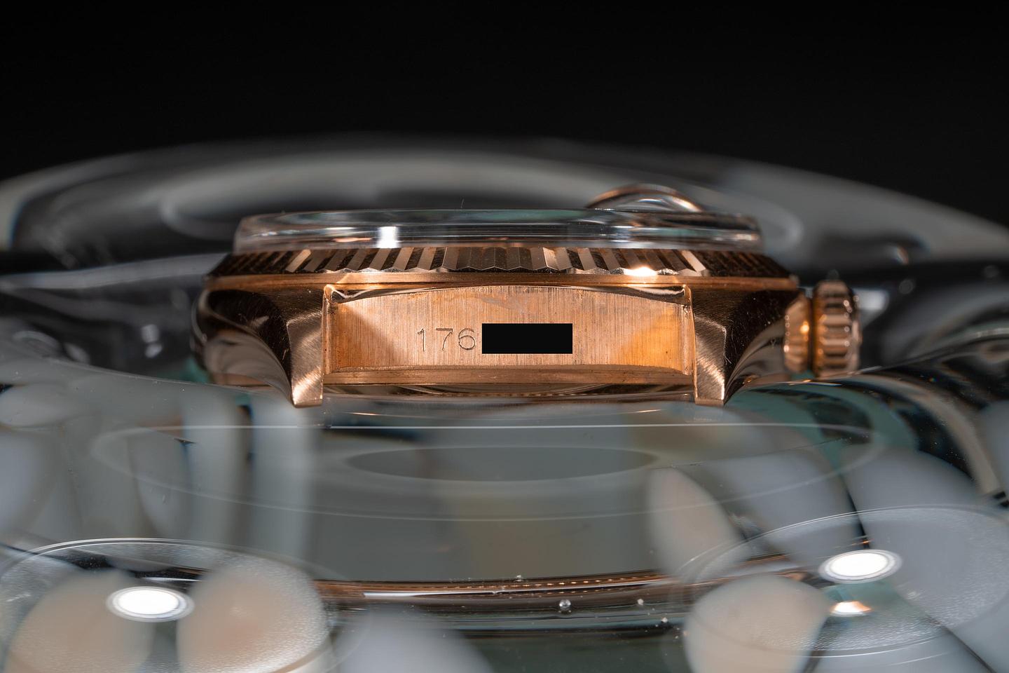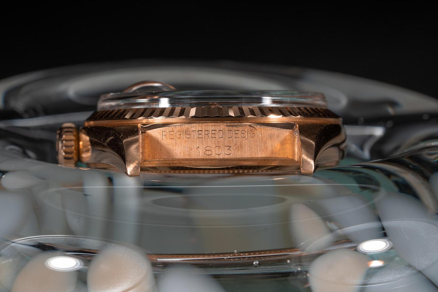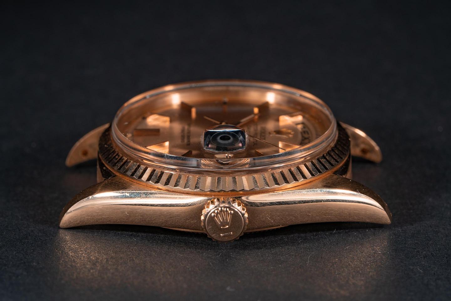 Case: The 18k rose gold case is excellent showing only light wear for its age. The sharp 18k rose gold fluted bezel is also in excellent condition showing only light wear from use.