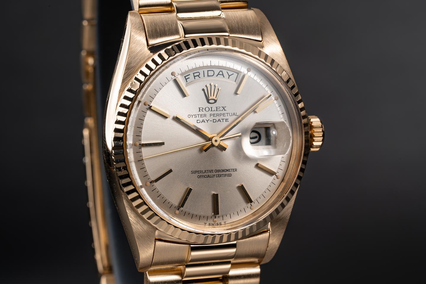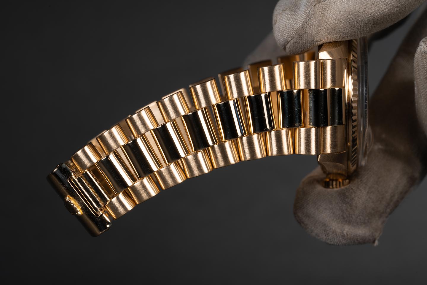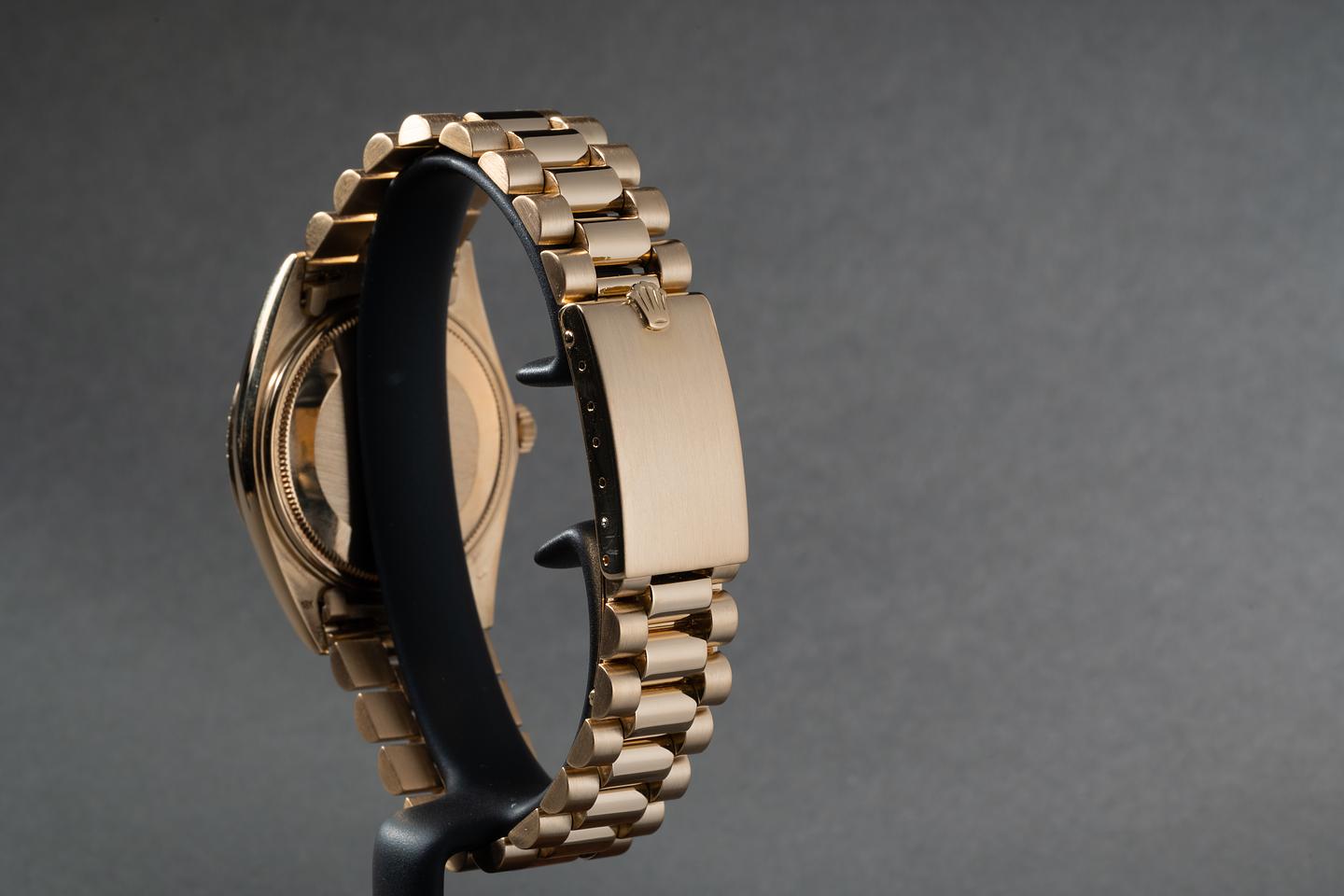 Bracelet: The 20 link 18K yellow gold president bracelet is excellent showing only light stretch for its age. The clasp is stamped with a matching 1968 date code.