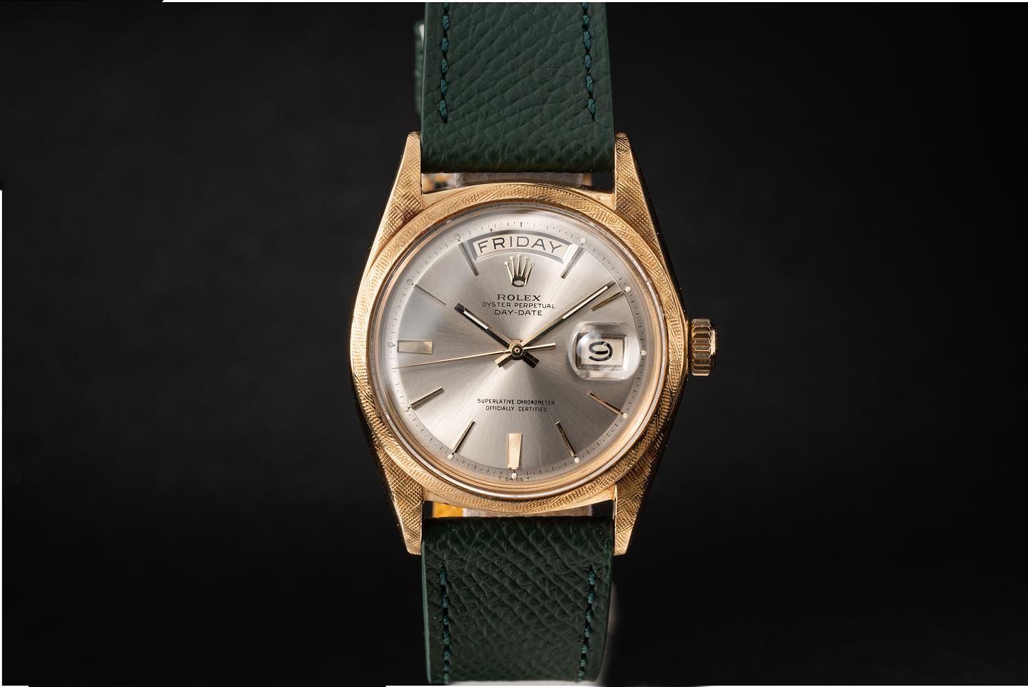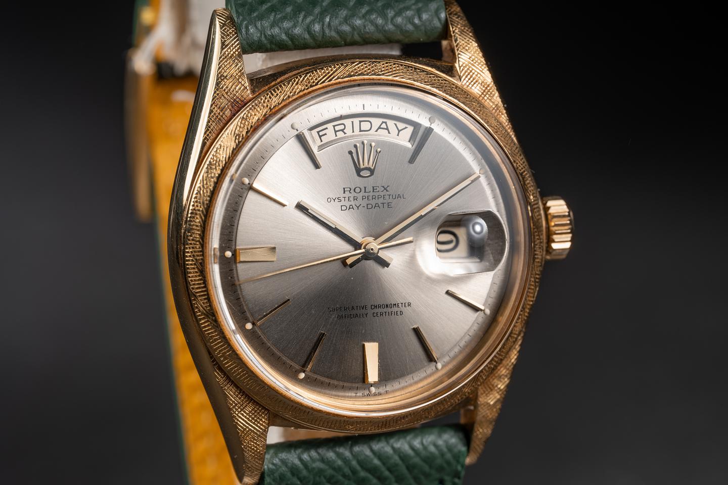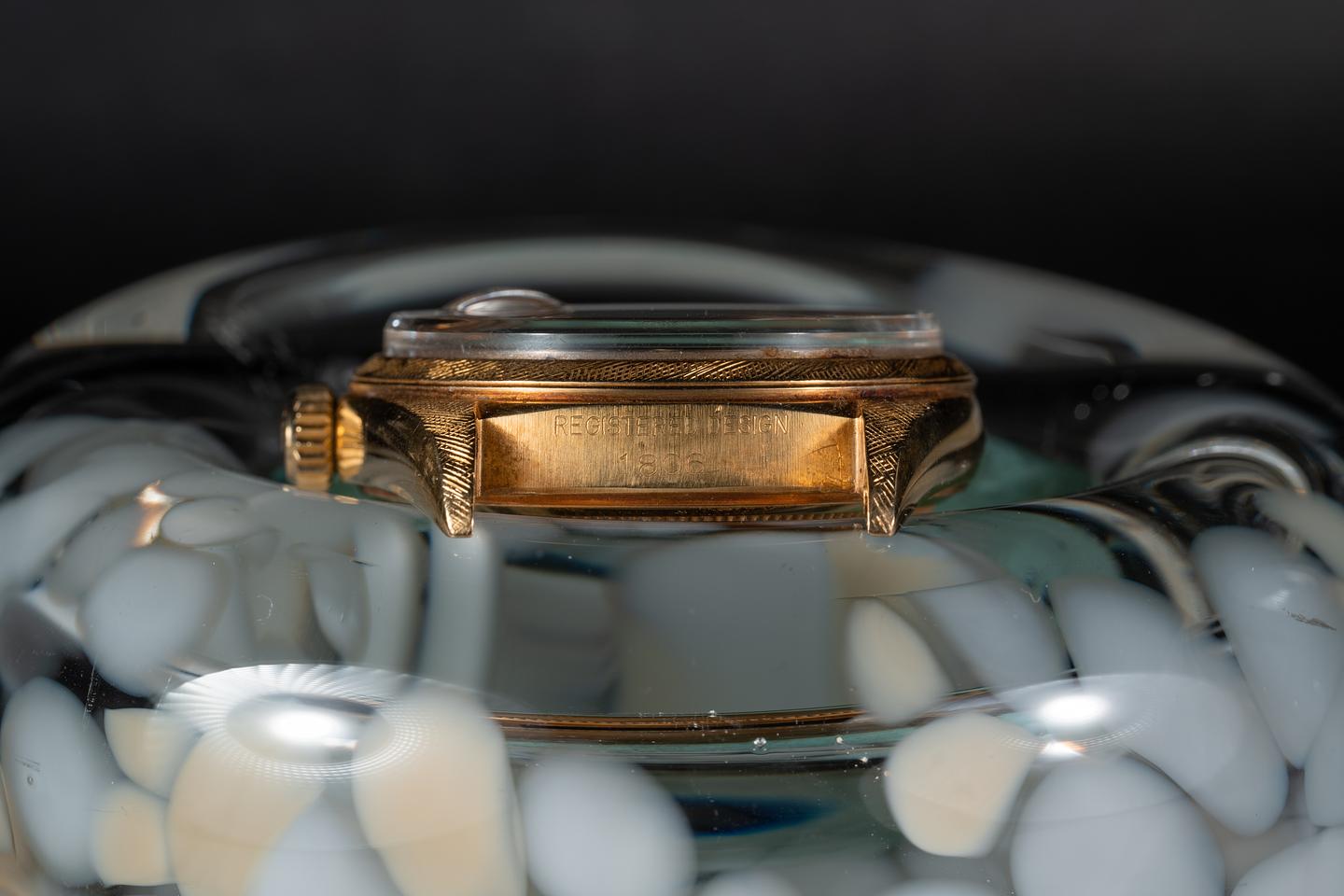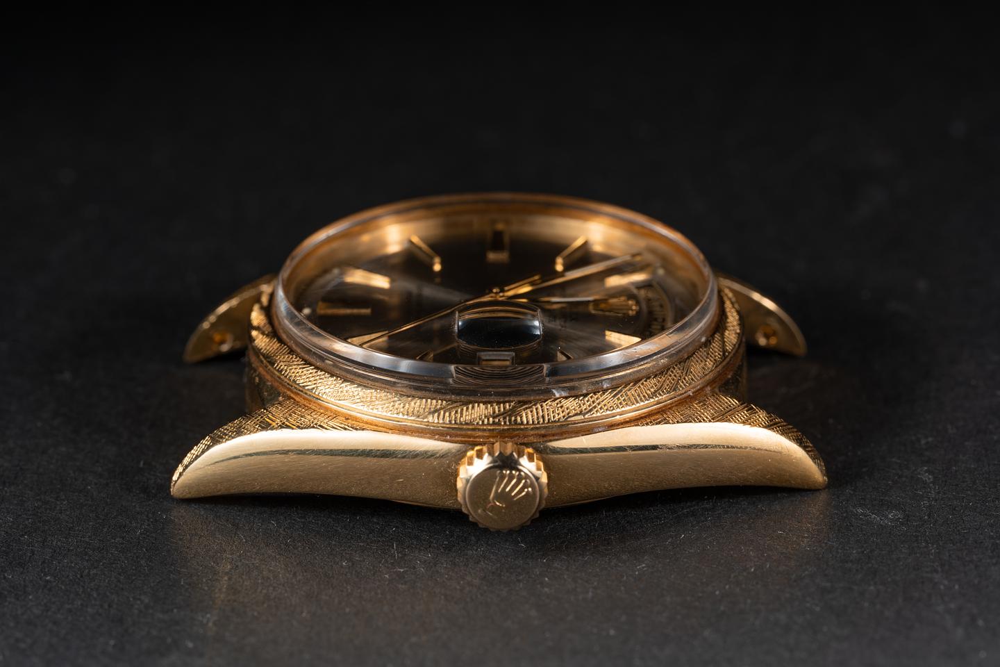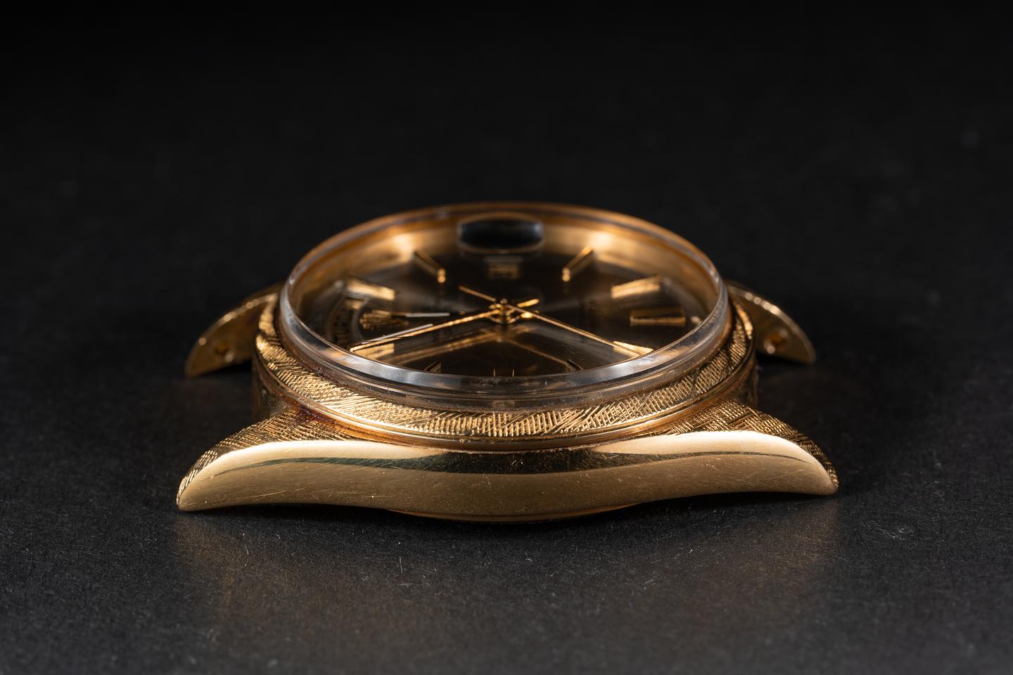 Case: The 18k yellow gold case is excellent with a sharp and well-defined factory florentine finish. The bezel is also in excellent condition with a sharp and well-defined factory florentine finish. The case and bezel appear unpolished and have a warm rosy patina from age.