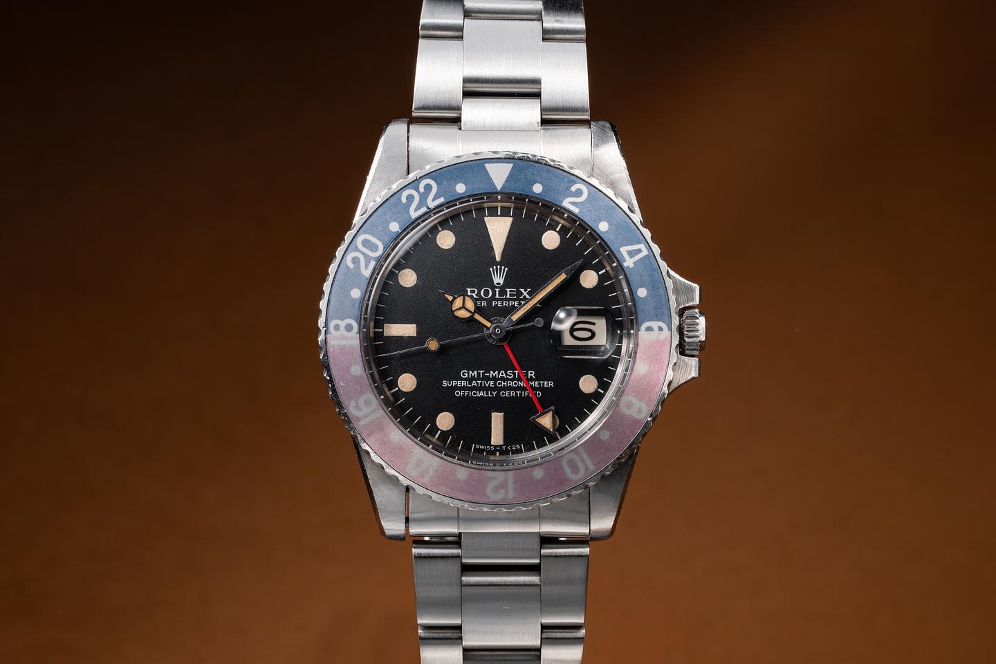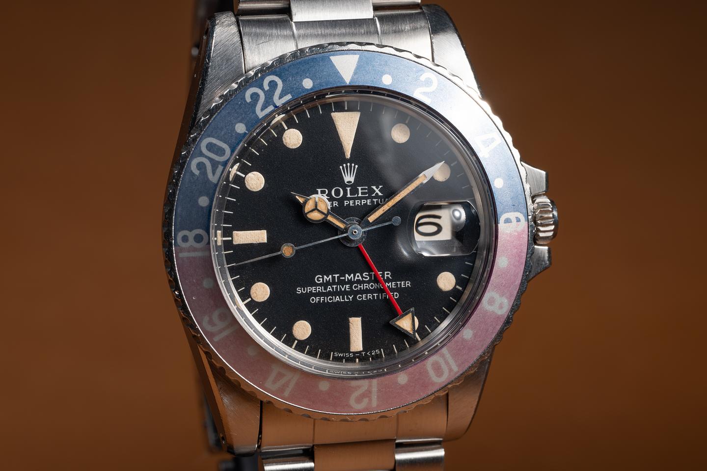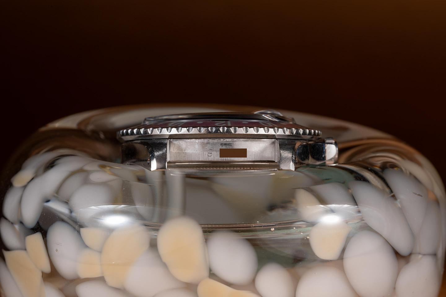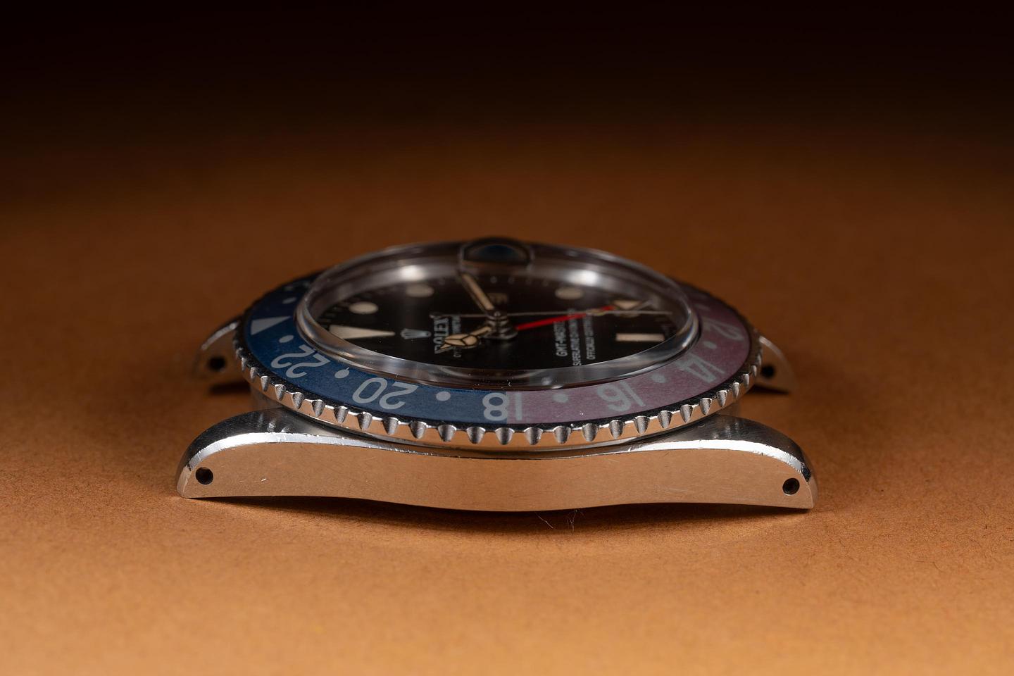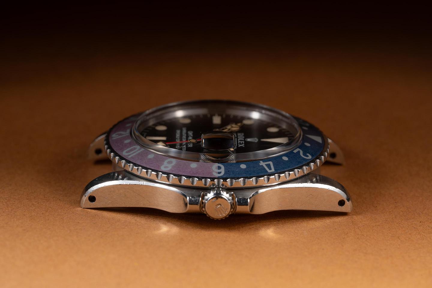 Case: The early rounded crown guard case is excellent showing wide, sharp, prominent bevels and only light wear from use. The Fuchsia bezel is also in excellent condition showing significant fading and color shifting to both portions of the insert.