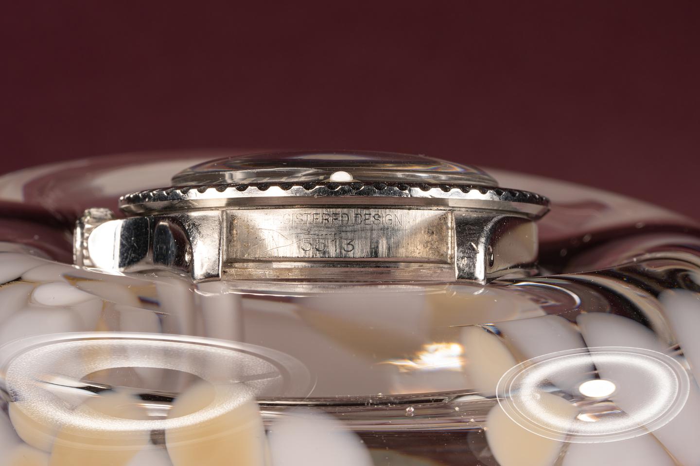 Dial: Excellent matte black dial with subtle speckling patina present. The lume plots have aged to a warm sandy hue and the hands have aged to a medium sage hue. All lume glows brightly when exposed to UV and falls off rapidly at the same rate.