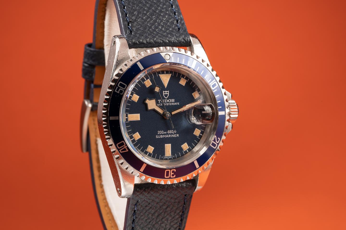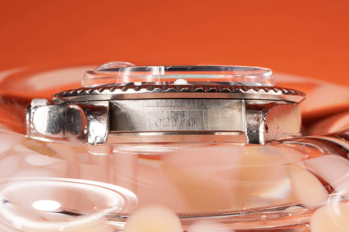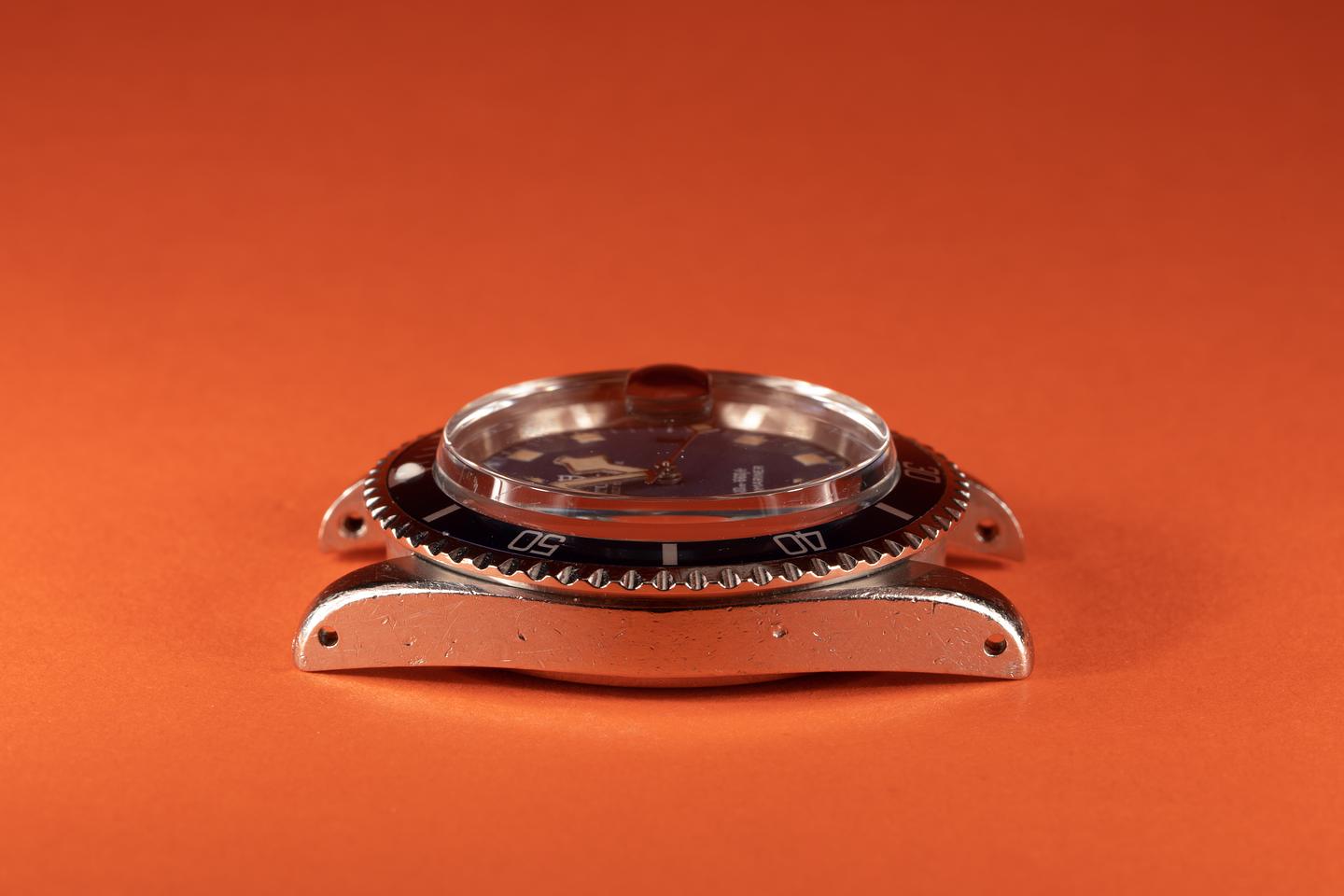 Case: Thick case with the factory bevels still intact. The case has a bright sleeve polished appearance and shows some wear for its age. The glossy blue bezel insert is excellent and shows light wear.