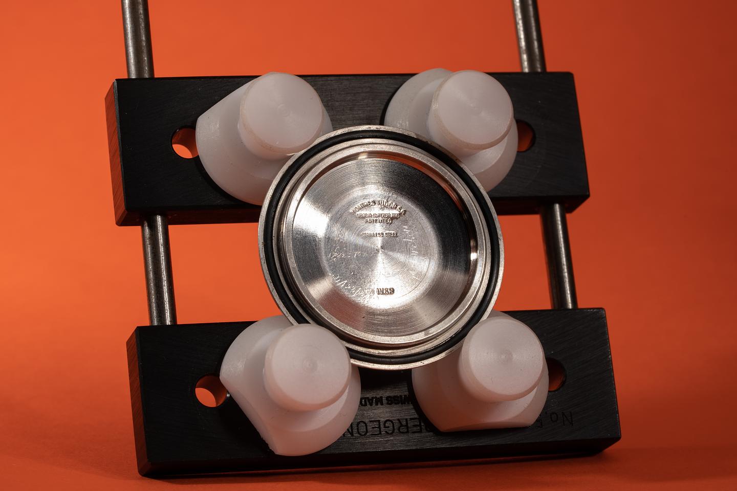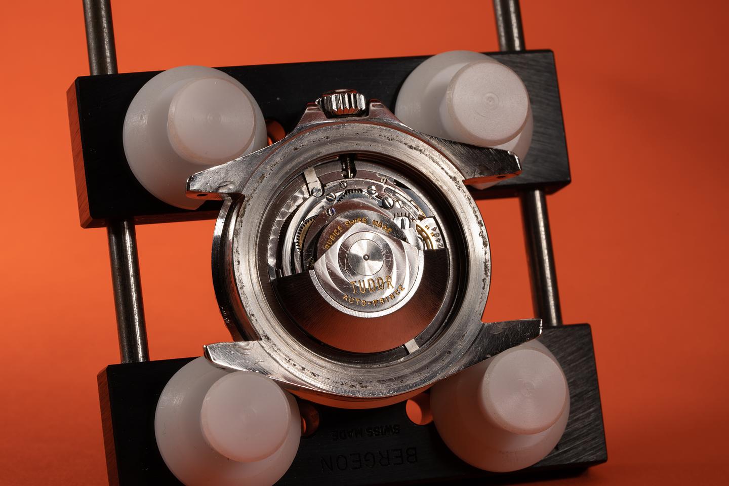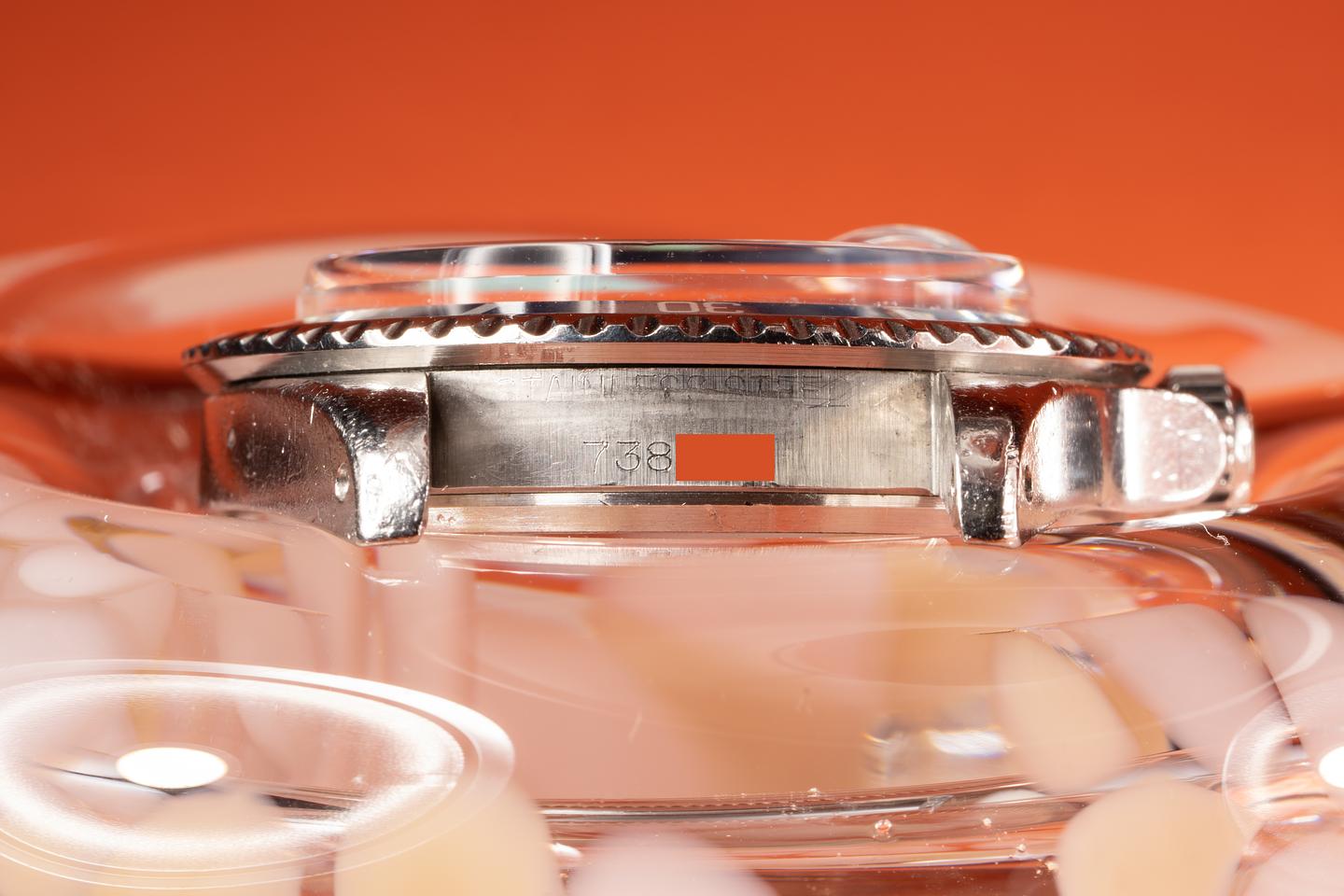 Dial: The excellent blue with green speckles dial shows light wear overall. There is a small chip at the edge of the dial just above the 8 o'clock marker. The hands have aged to a creamy blond hue and the hands are matching.