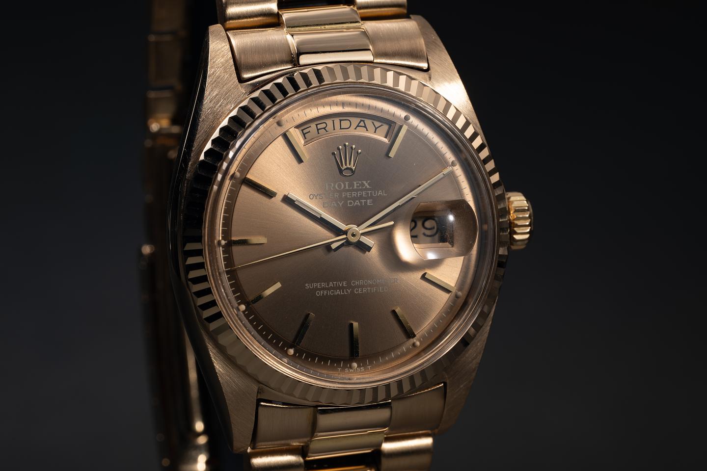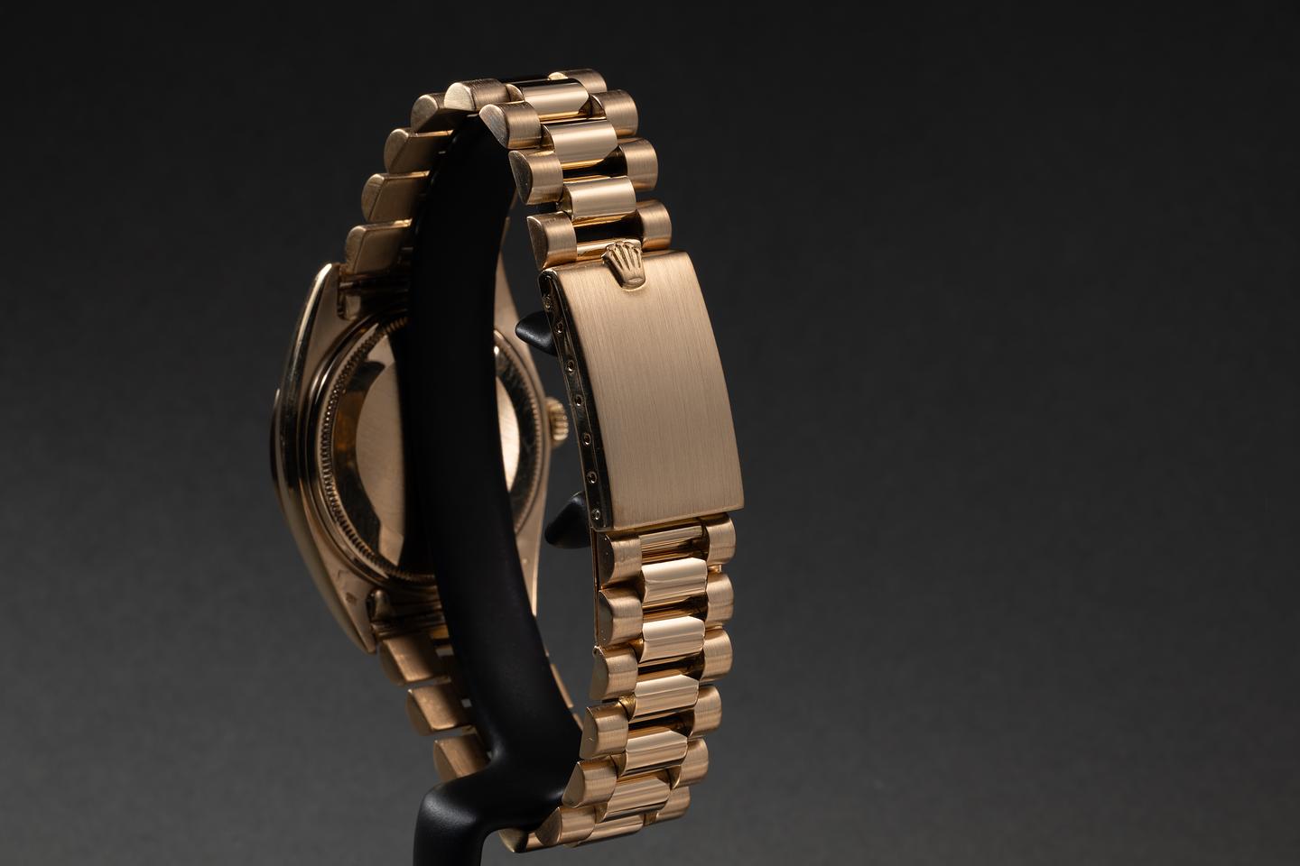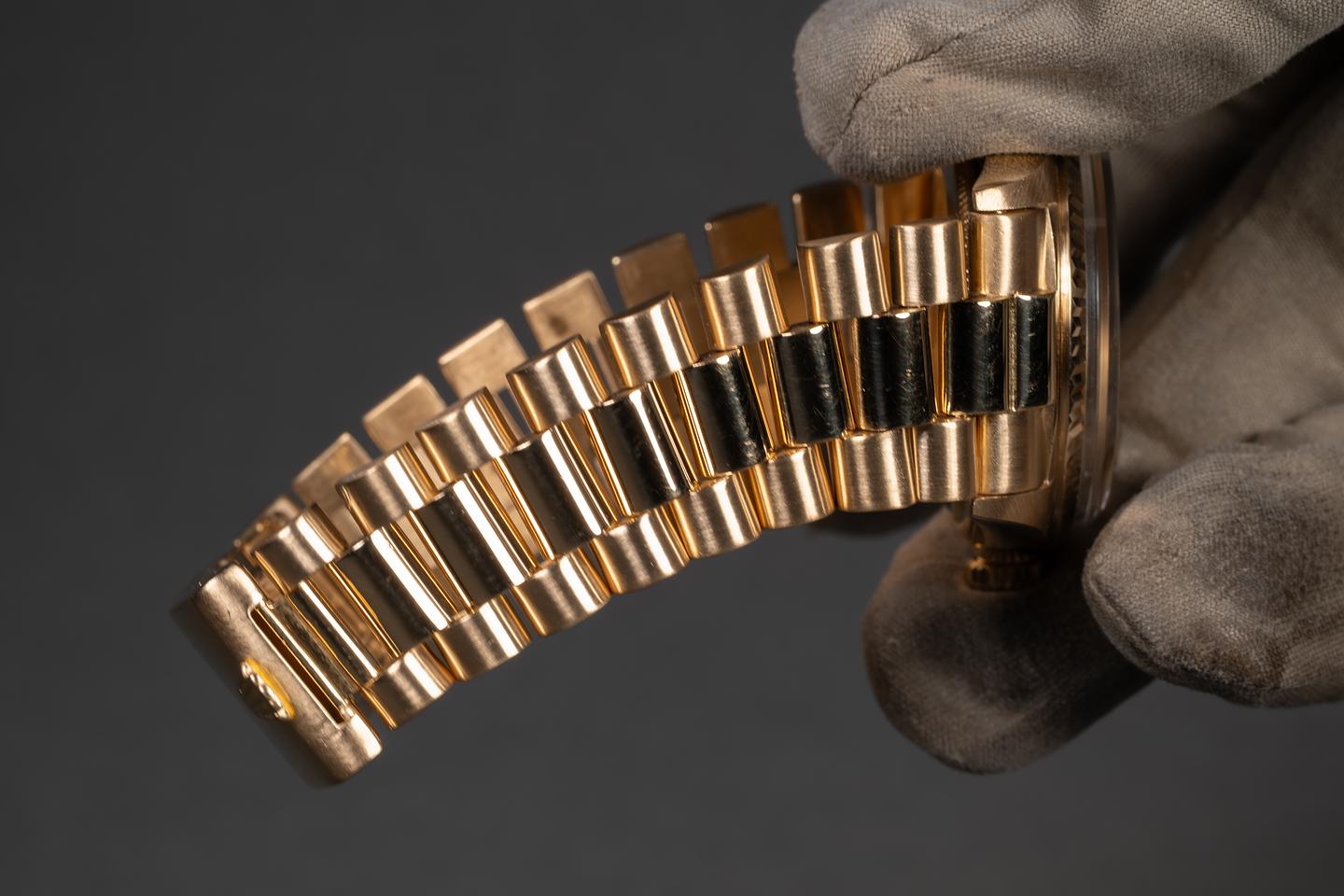 Bracelet: The 19-link 18K yellow gold folding clasp president bracelet is excellent, showing some light stretch for its age.