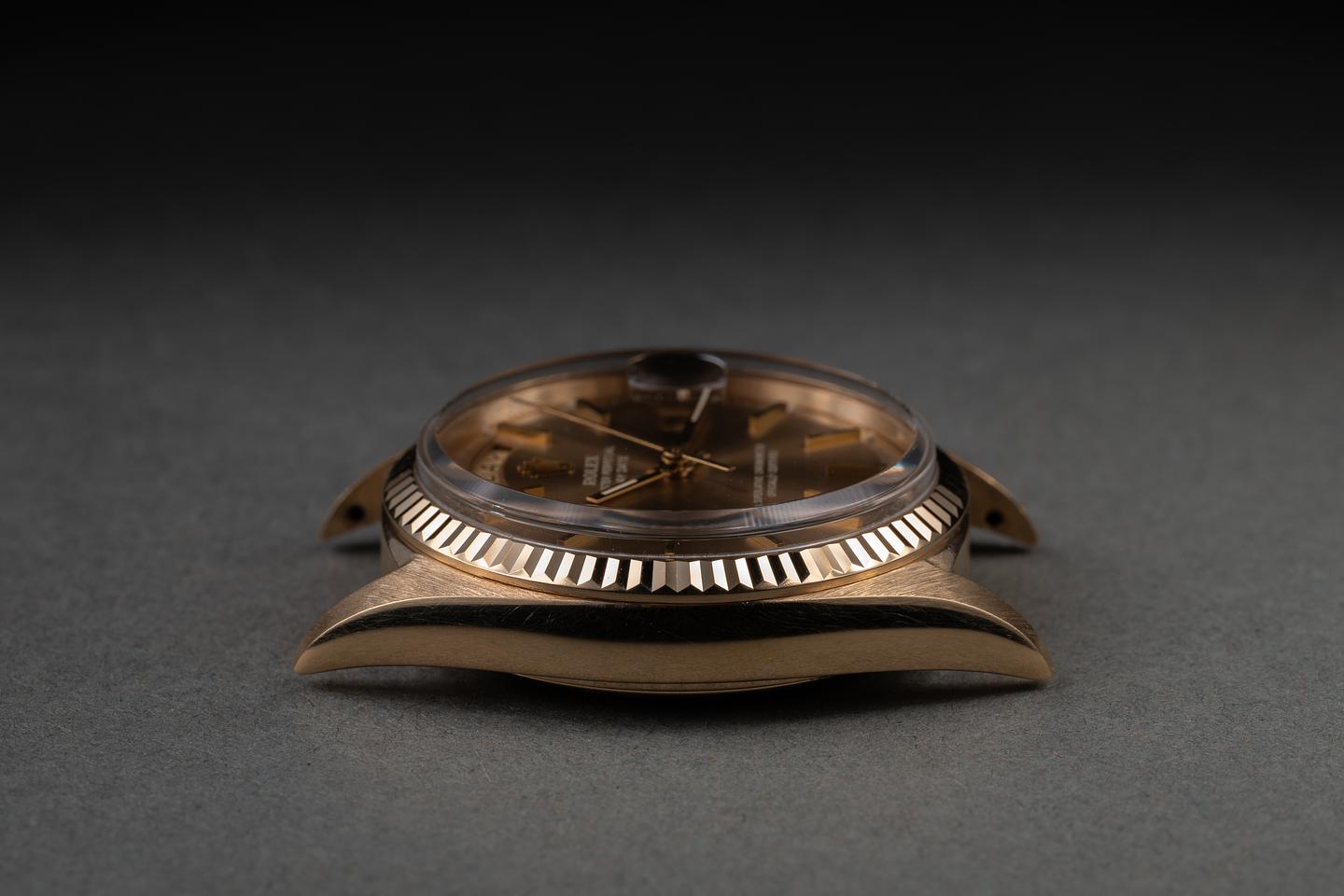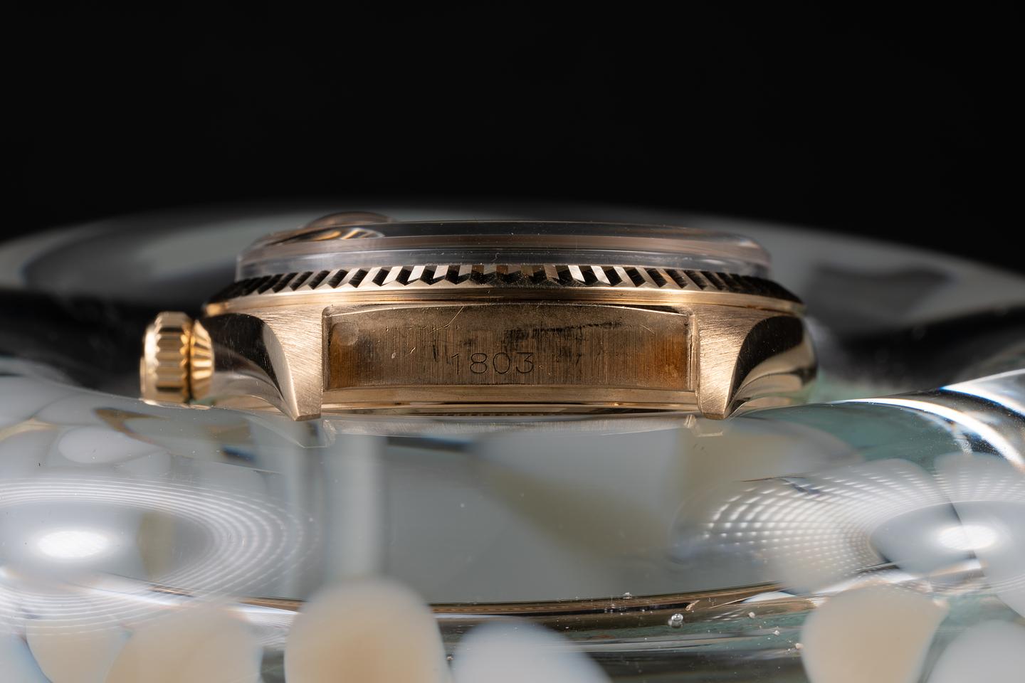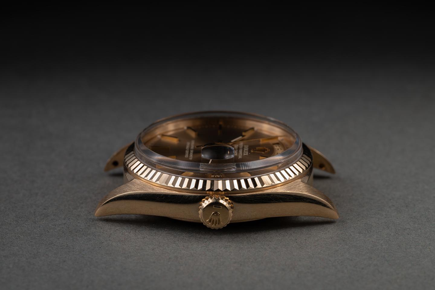 Case: The recently polished 18K yellow gold case is excellent, showing only very light wear from use. The sharp 18K yellow gold bezel is also in excellent, recently polished condition, showing only very light wear from use.