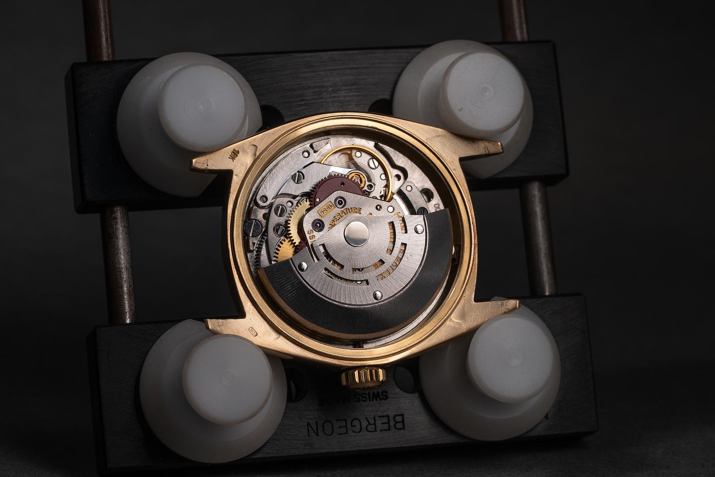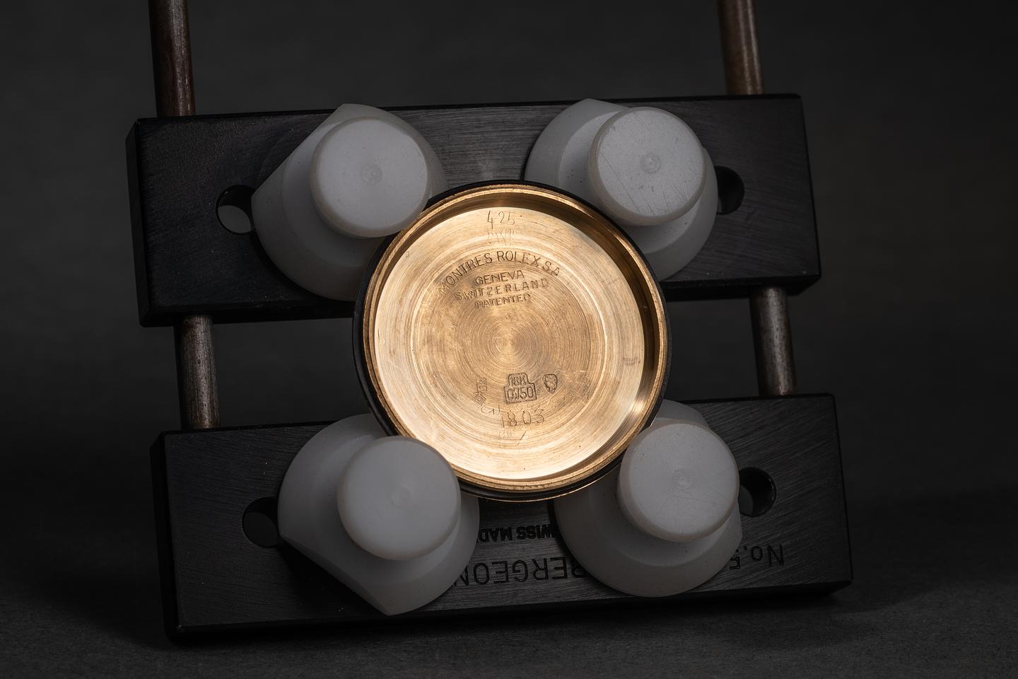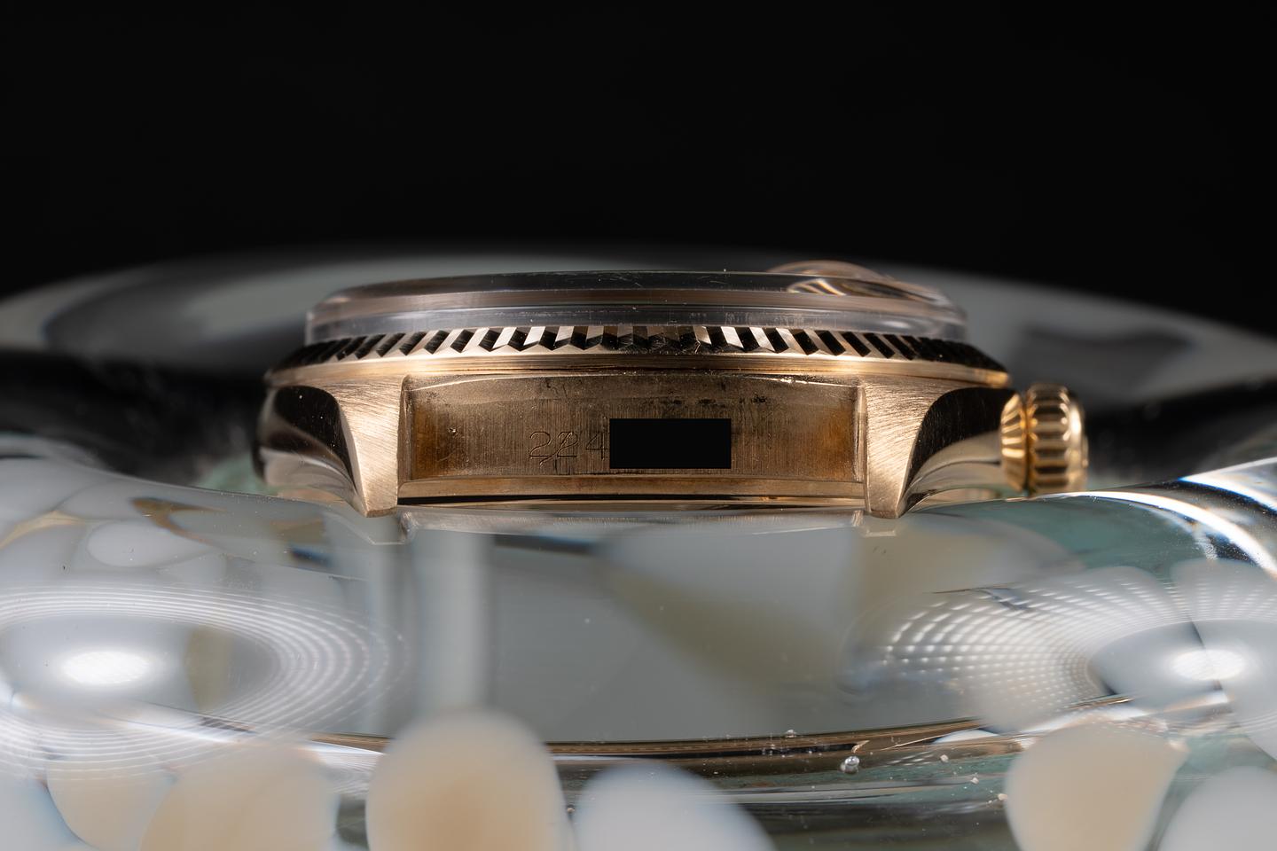 Case: The recently polished 18K yellow gold case is excellent, showing only very light wear from use. The sharp 18K yellow gold bezel is also in excellent, recently polished condition, showing only very light wear from use.