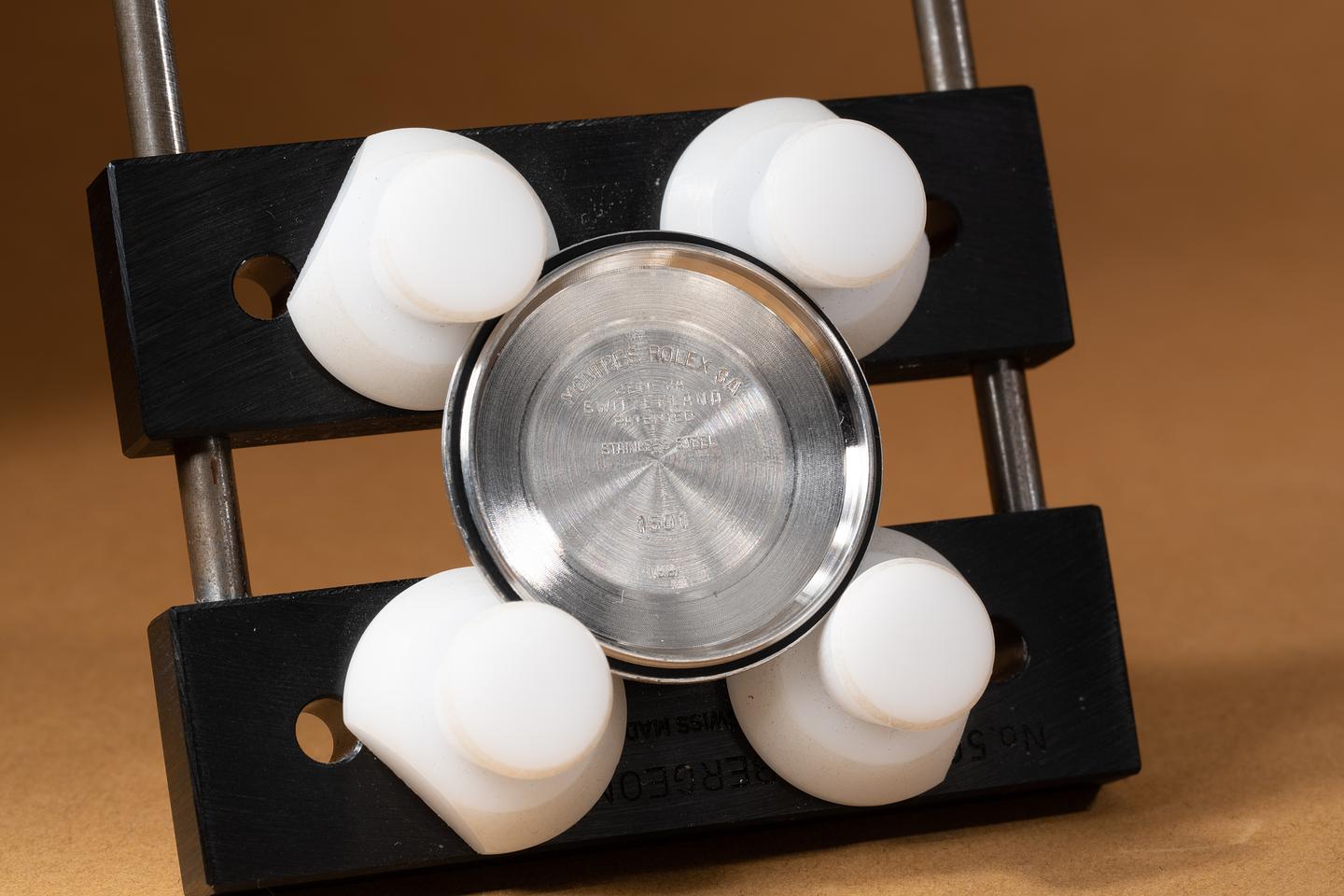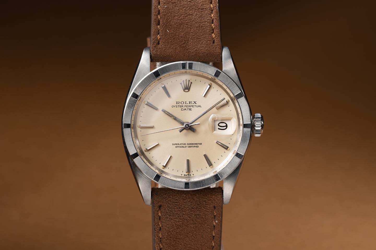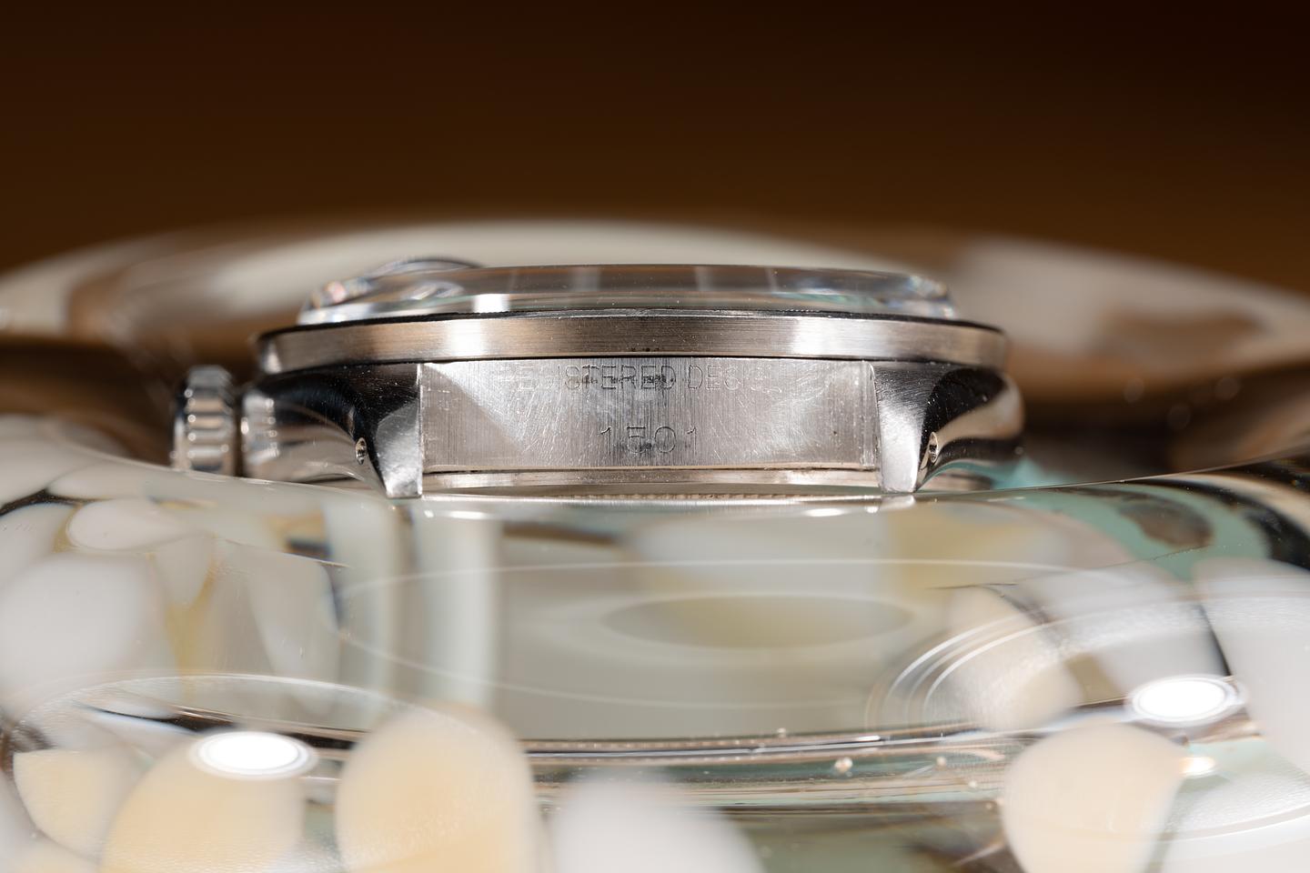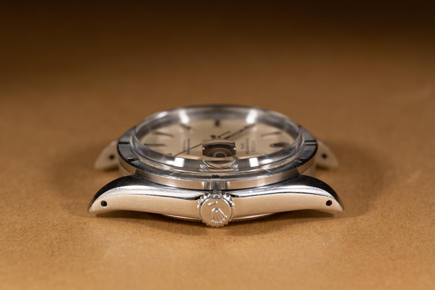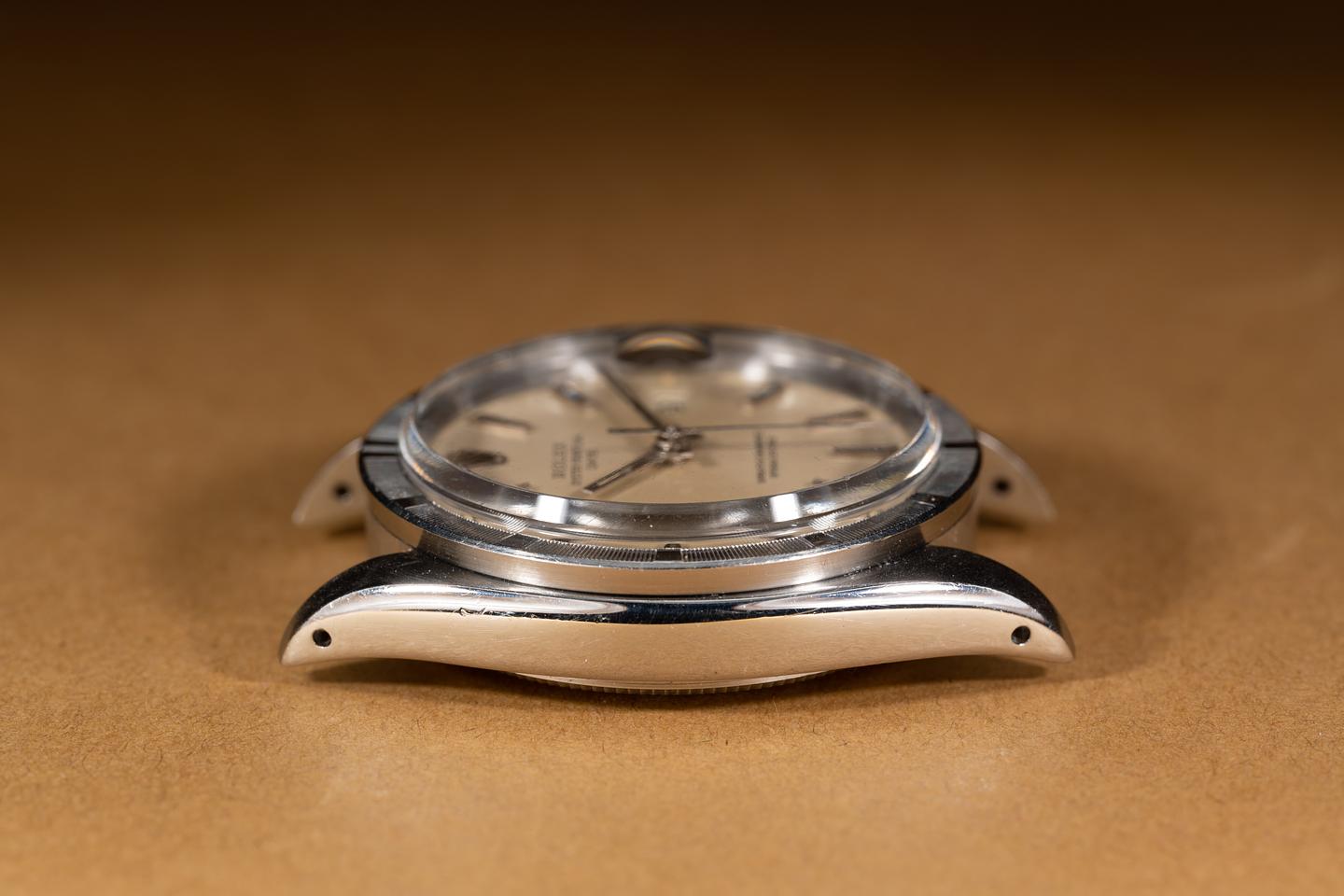 Case: The thick and even case has been polished in the past showing some light wear from use. The stainless engine turned bezel is also in excellent condition showing only very light wear from use.