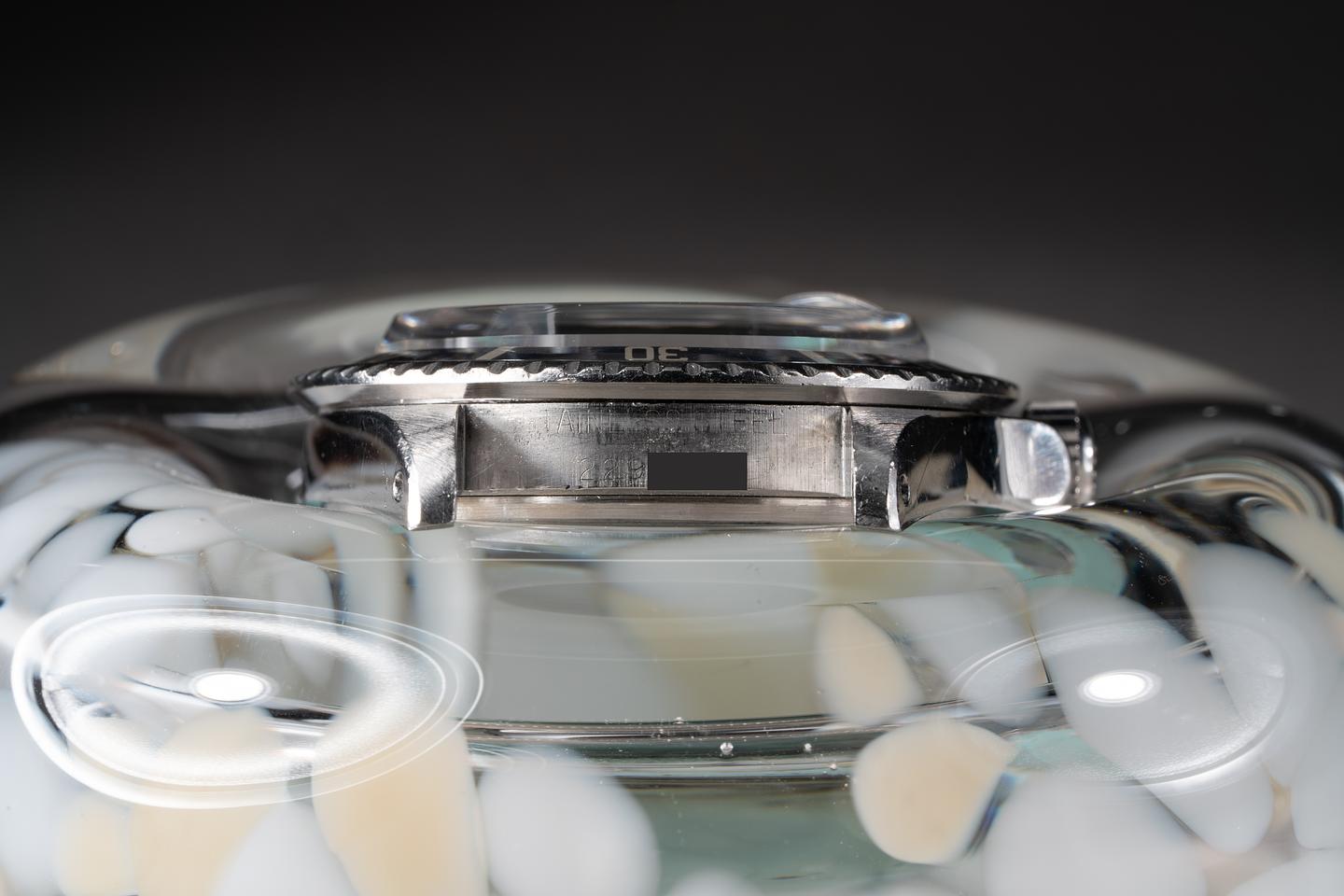 Case: The thick and even case appears to be unpolished showing wide sharp factory bevels and some wear from use. The bezel has faded to a glossy navy blue hue and showing some light wear from use.