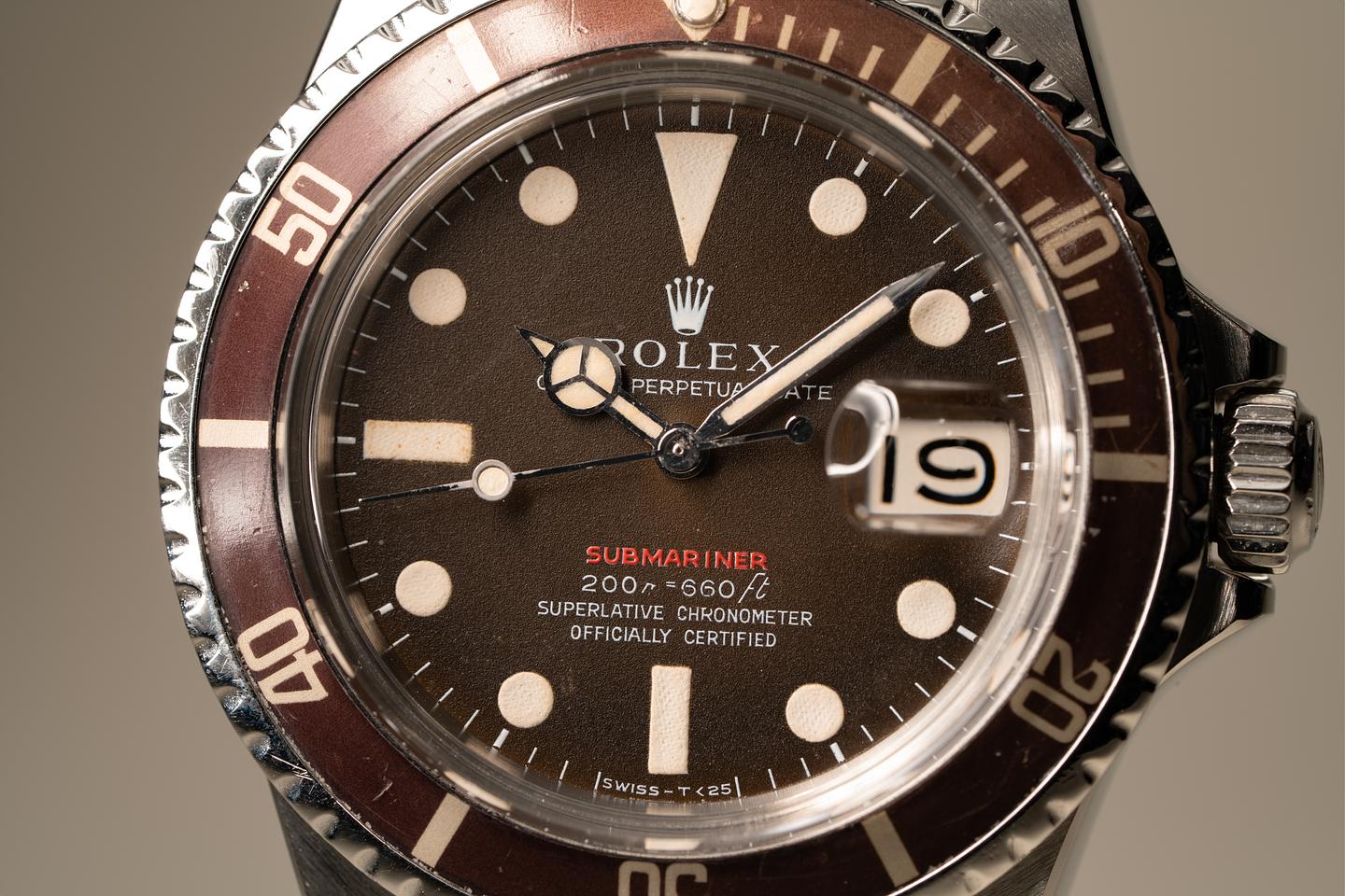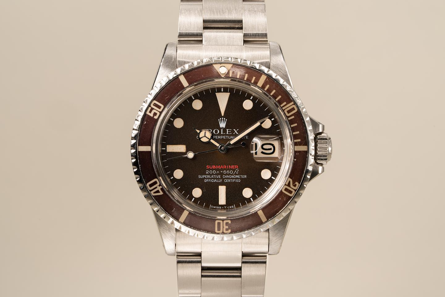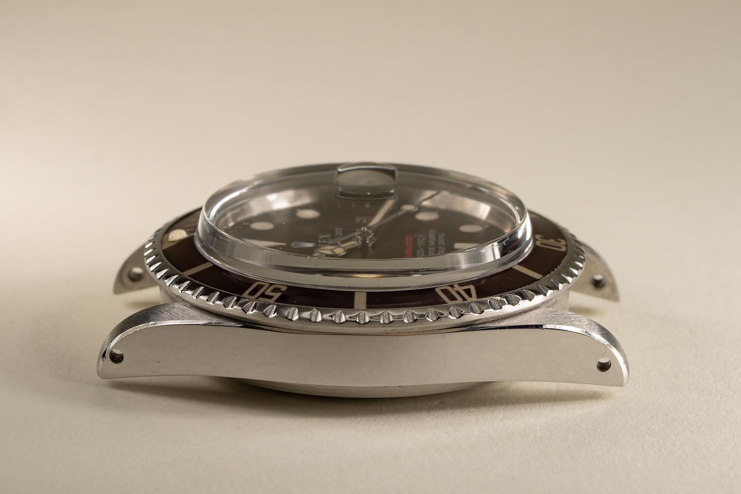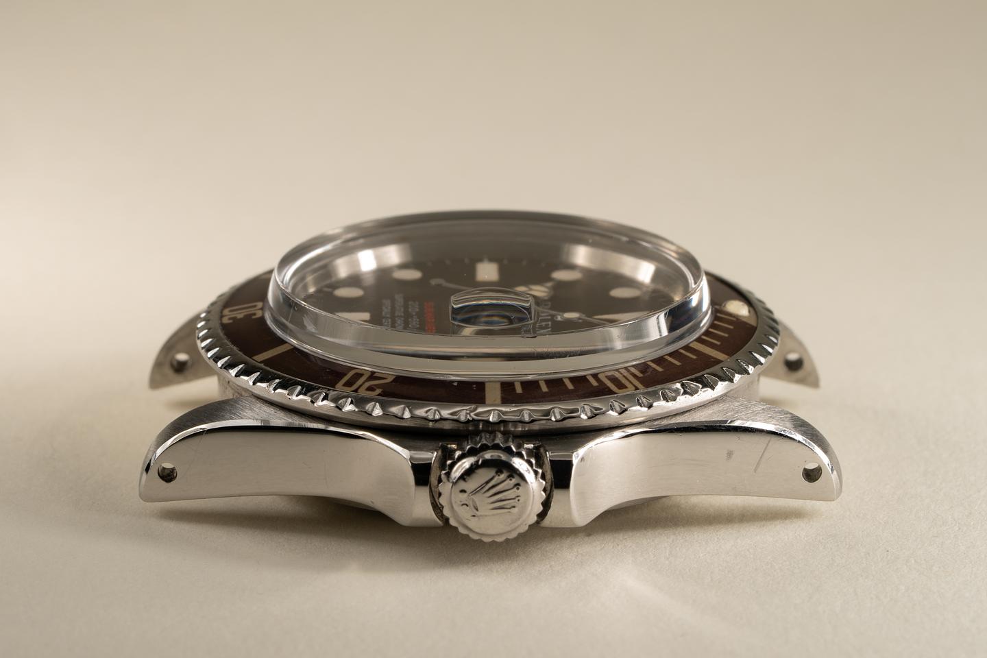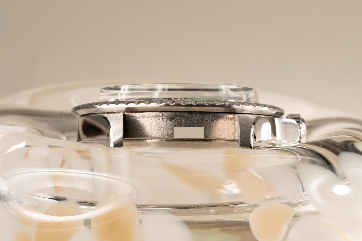 Case: Excellent case that has just returned from polishing. The bezel insert has faded to a deep brown hue and the silver numbering is warming to a creamy hue. The pearl is present and intact.