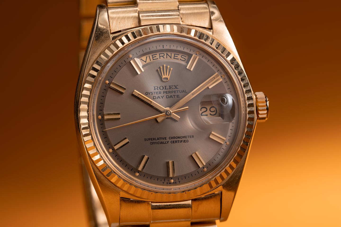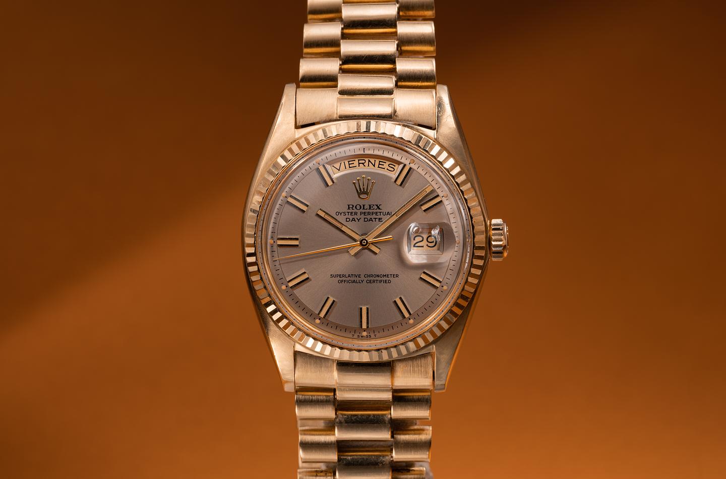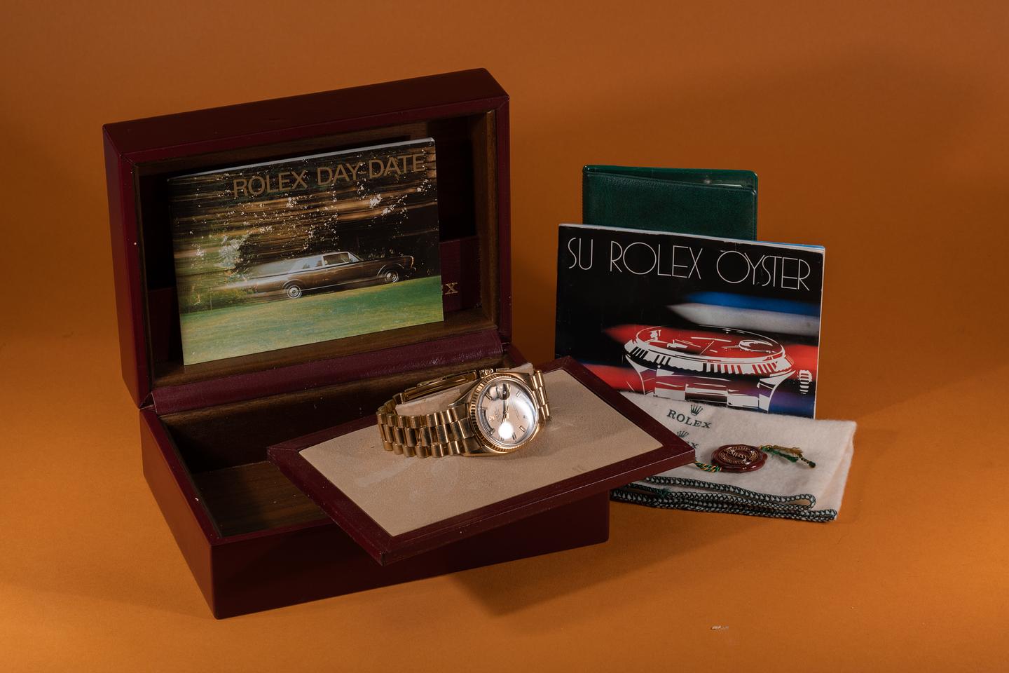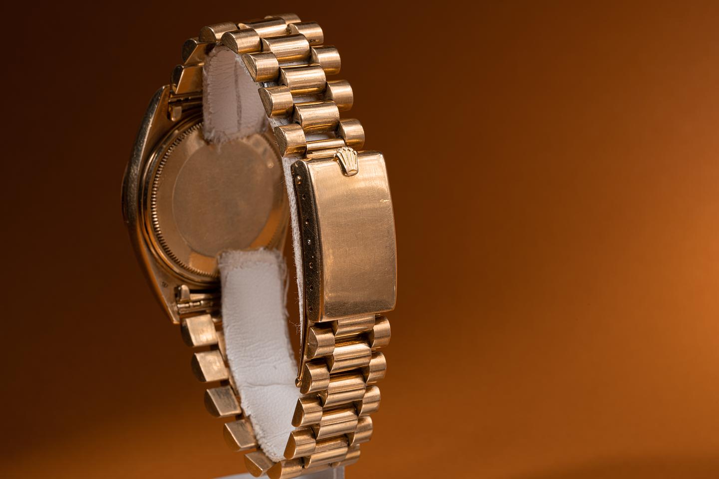 Bracelet: The 19 link 18K yellow gold president bracelet is excellent showing average stretch for its age. The clasp is stamped with a 1969 date code.