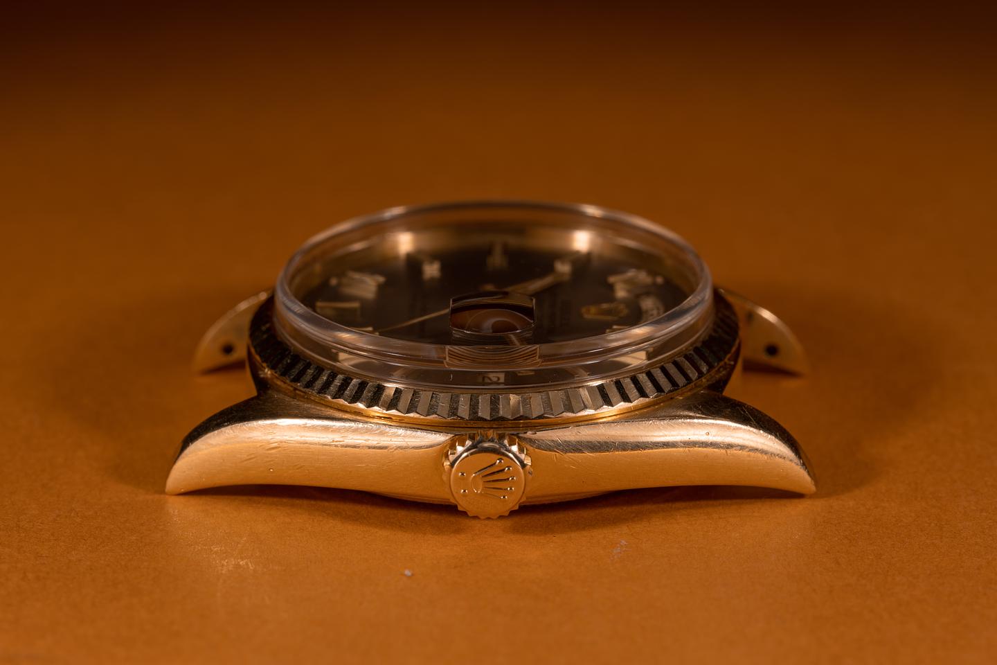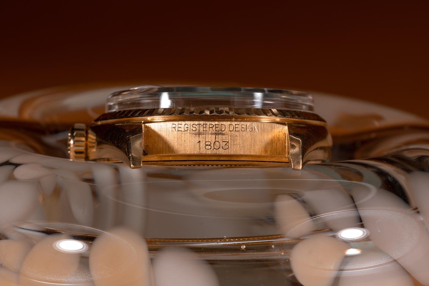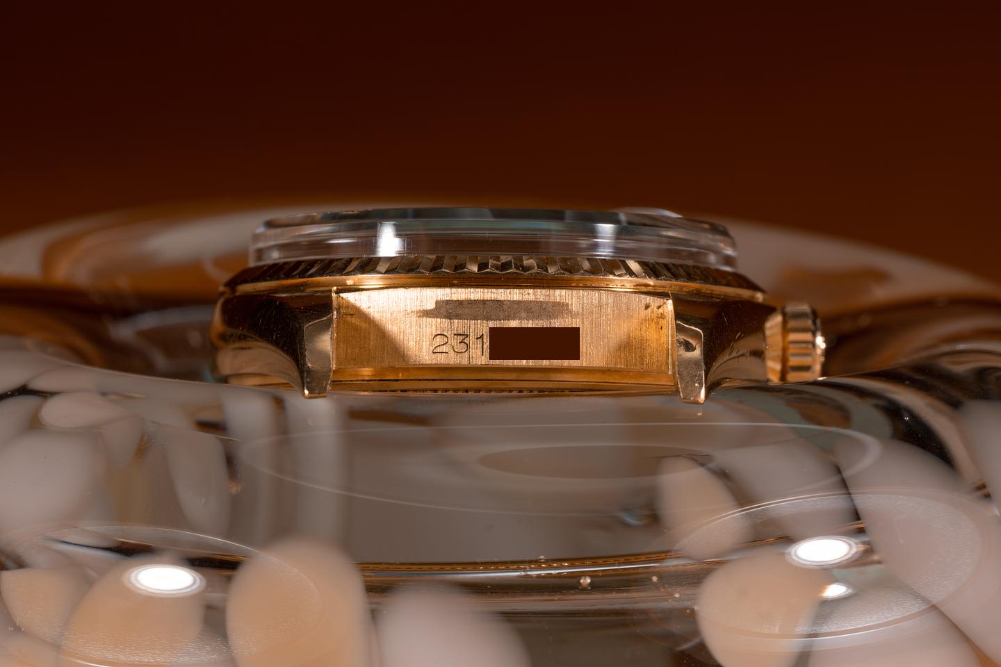Case: The 18k yellow gold case is excellent showing a bright sleeve polished finish and some light wear from use. The sharp 18k yellow gold fluted bezel is also in excellent condition showing only light wear from use.