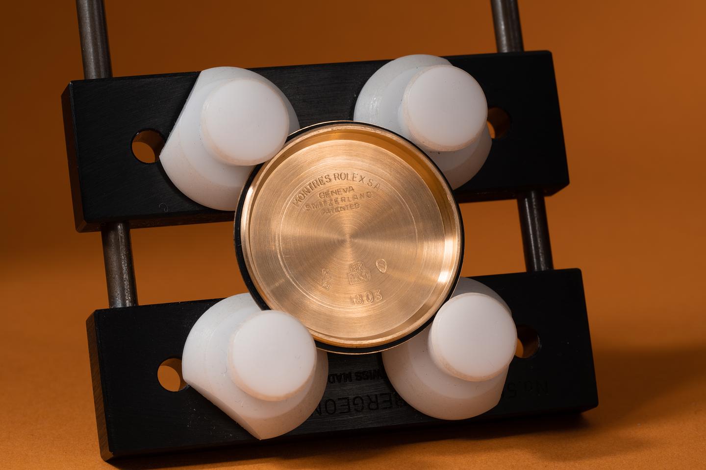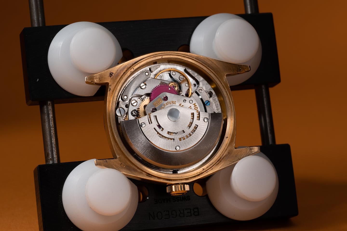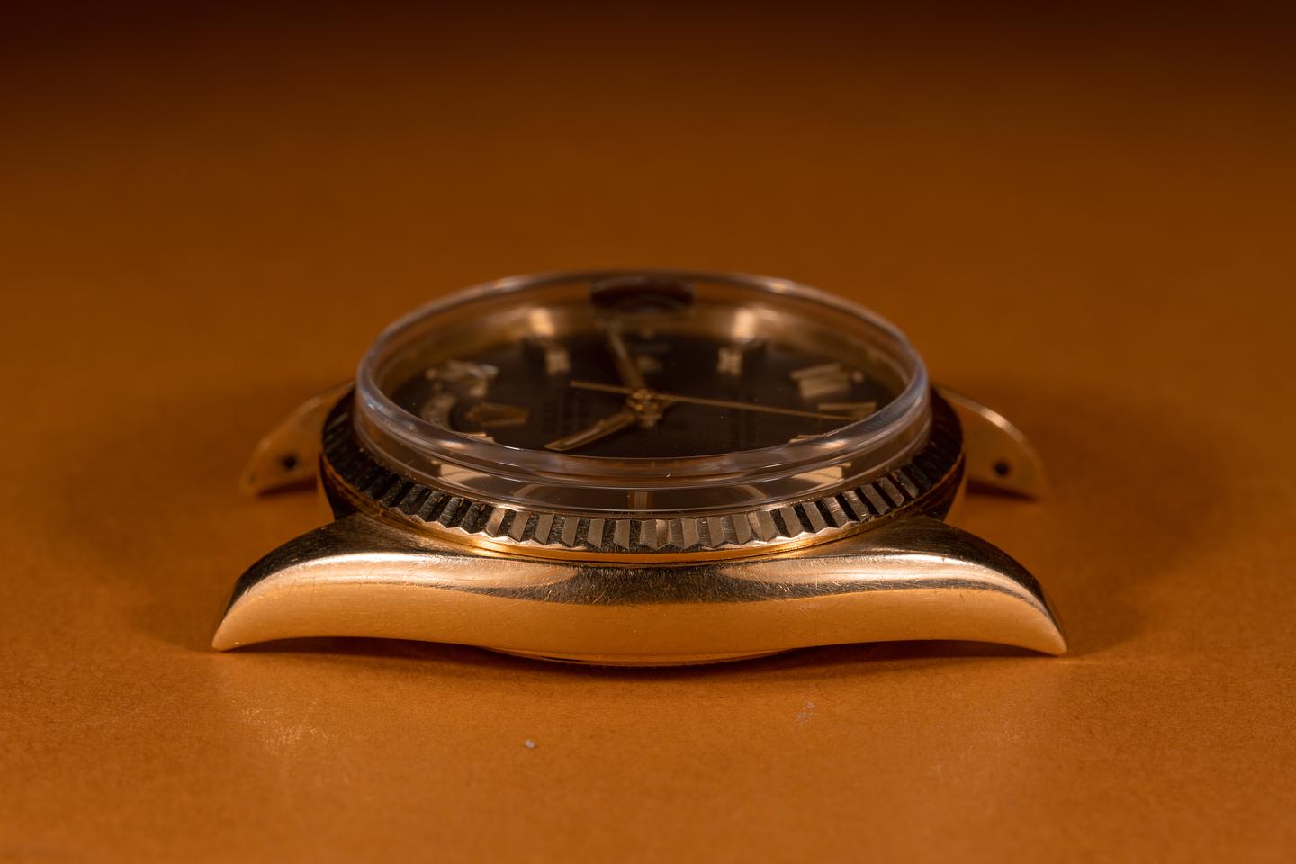Case: The 18k yellow gold case is excellent showing a bright sleeve polished finish and some light wear from use. The sharp 18k yellow gold fluted bezel is also in excellent condition showing only light wear from use.