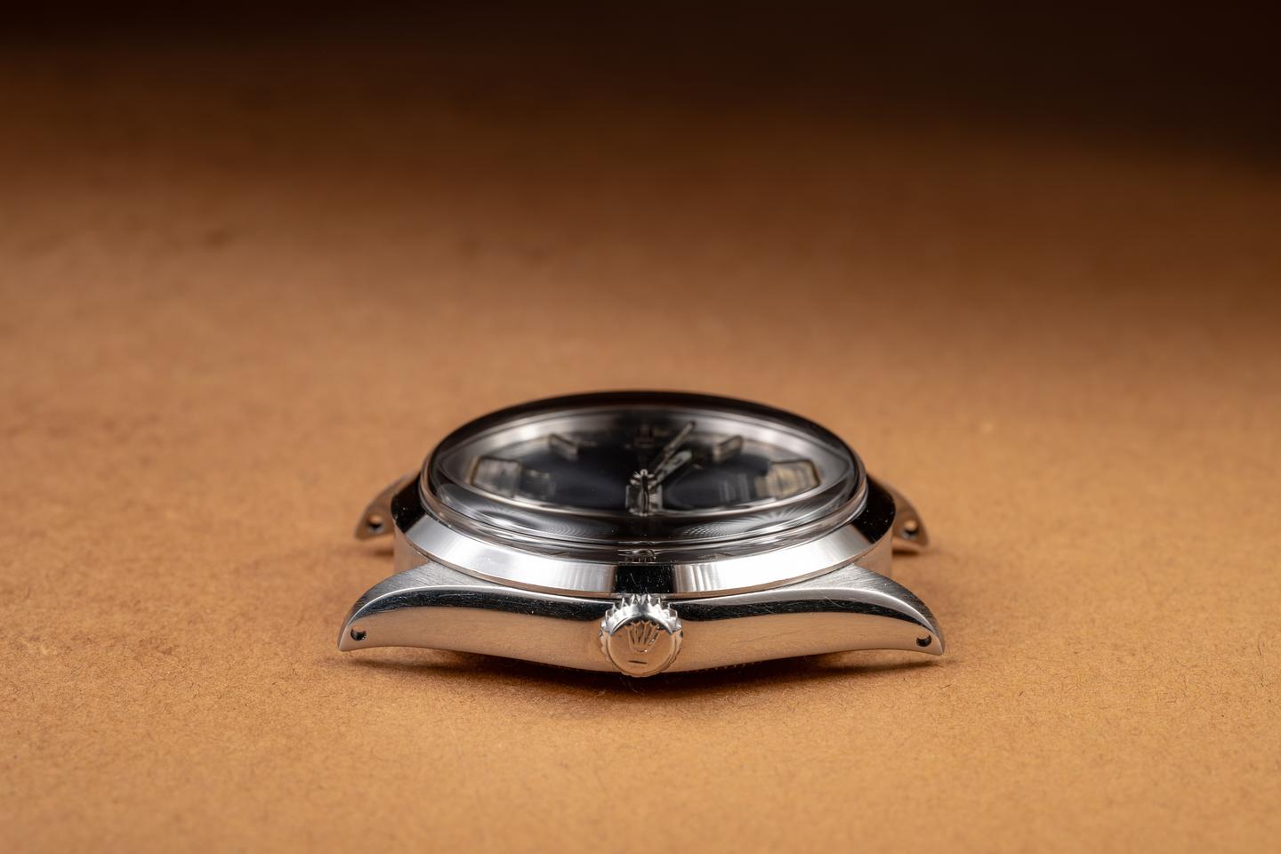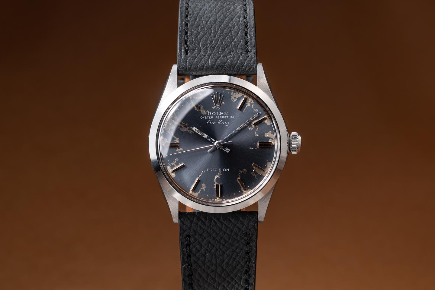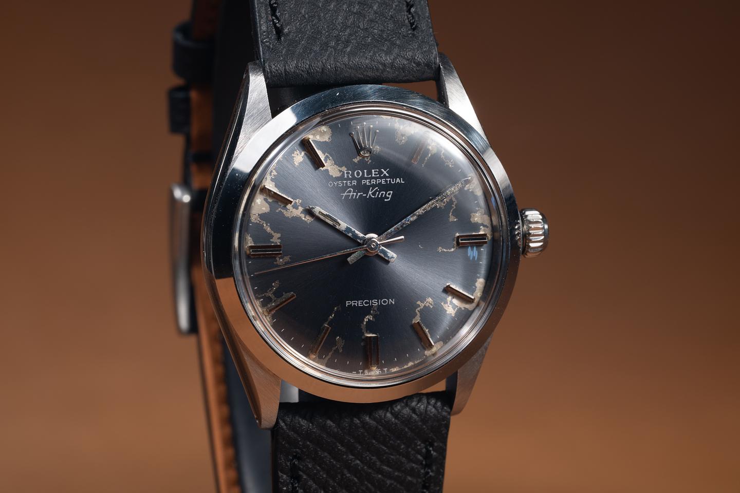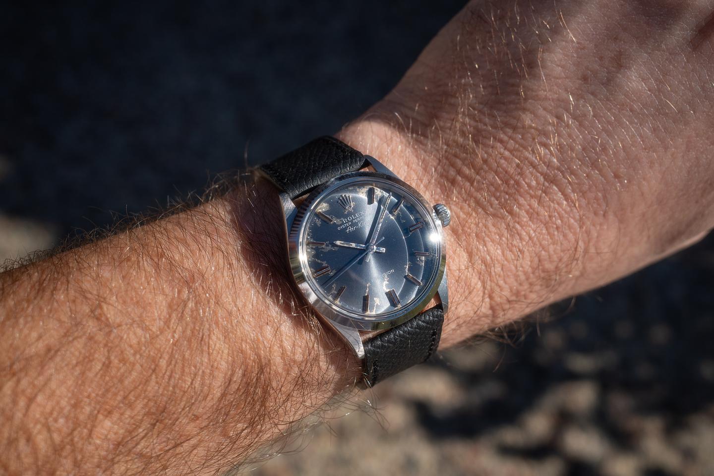 Dial: The blue-grey dial is excellent, showing a pattern of gold tropical patina across its surface. The lume has aged to a warm, creamy hue, and the hands have aged slightly darker than the lume on the dial.
