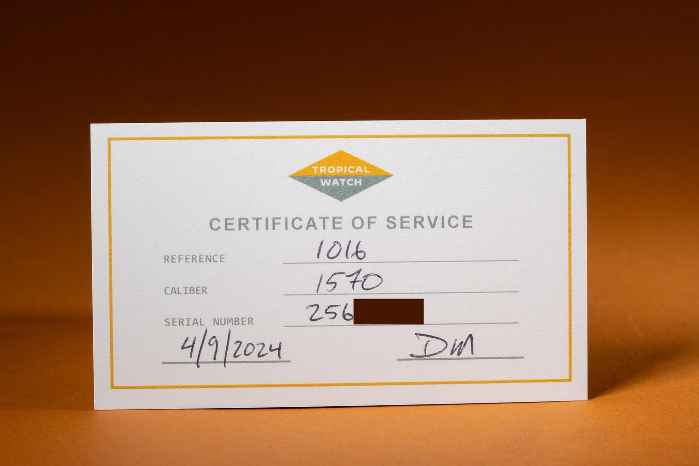 Accessories: April 2024 Certificate of Service from Tropical Watch.