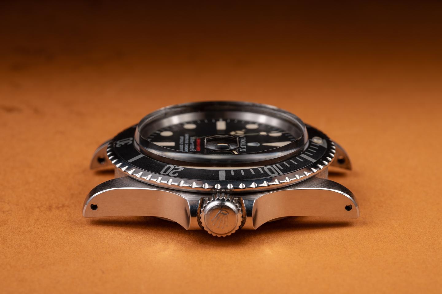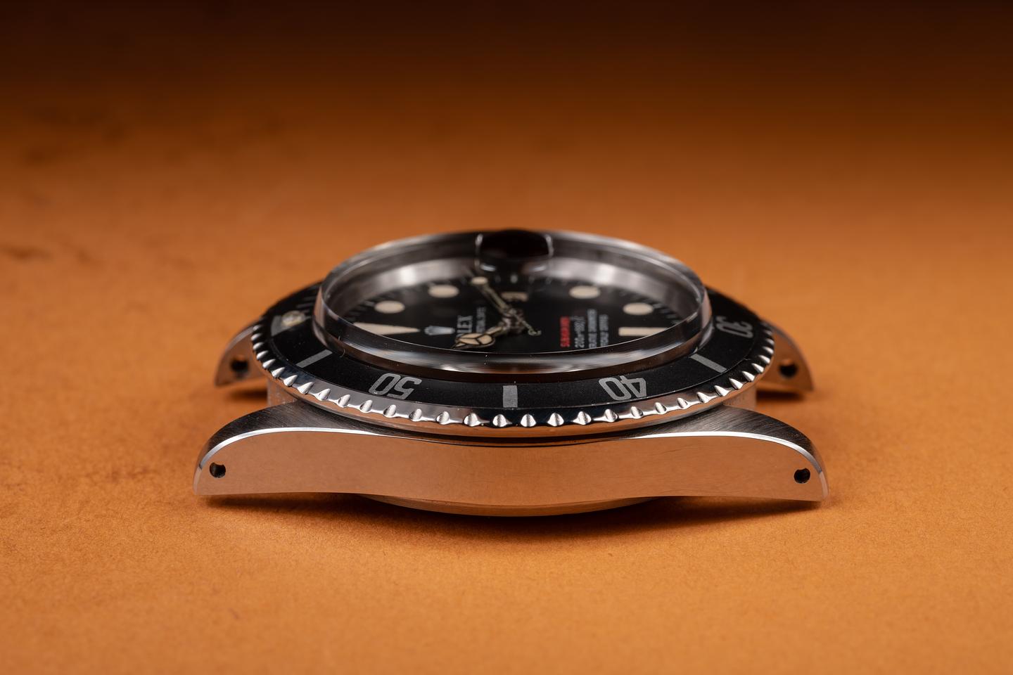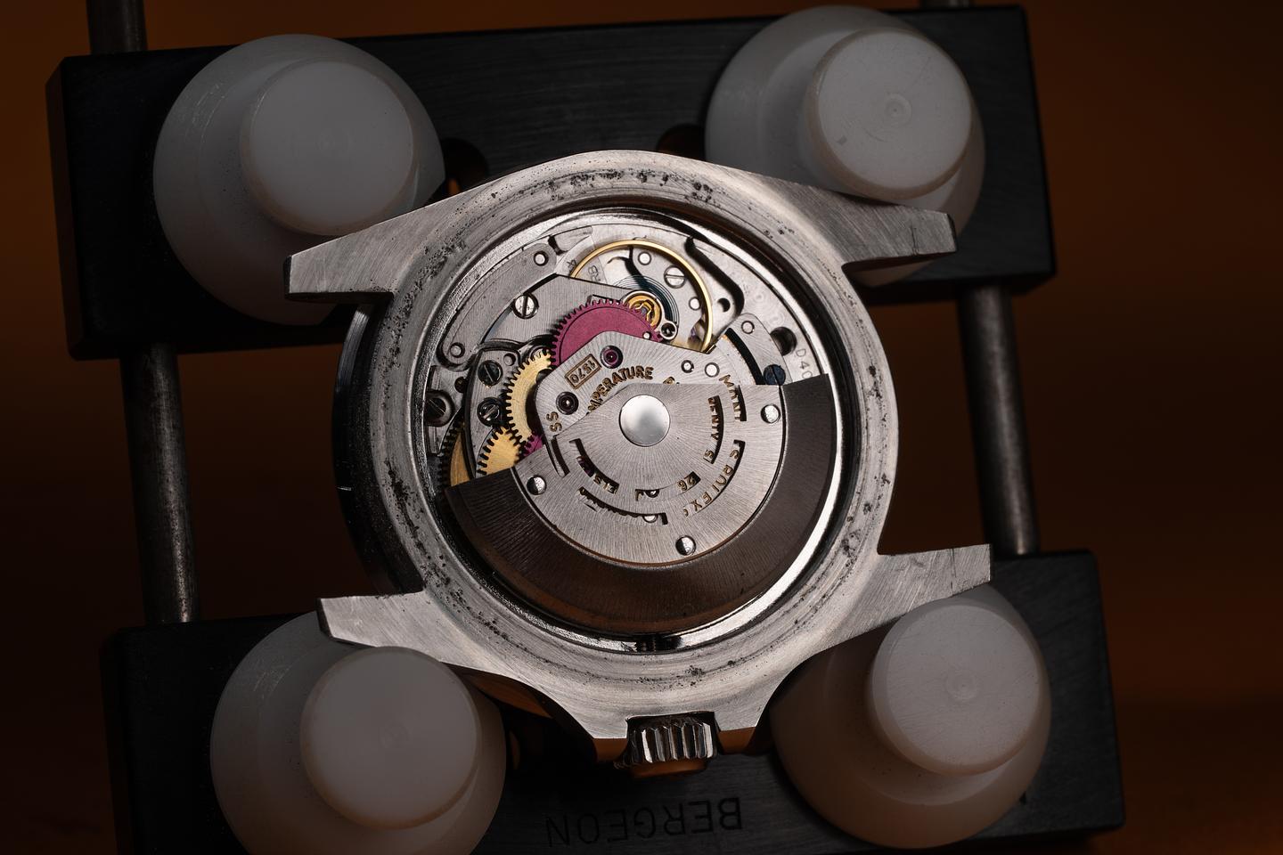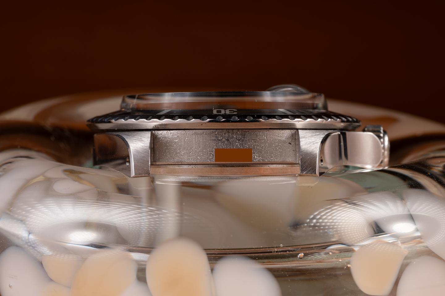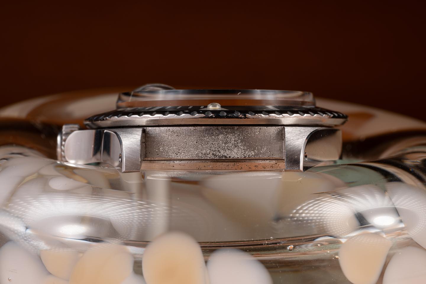 Case: The freshly polished case is excellent, showing sharp, prominent bevels. The bezel insert is also in excellent condition and has aged to a glossy grey tone. The case has some pitting on the reference side but it passes a pressure test.
