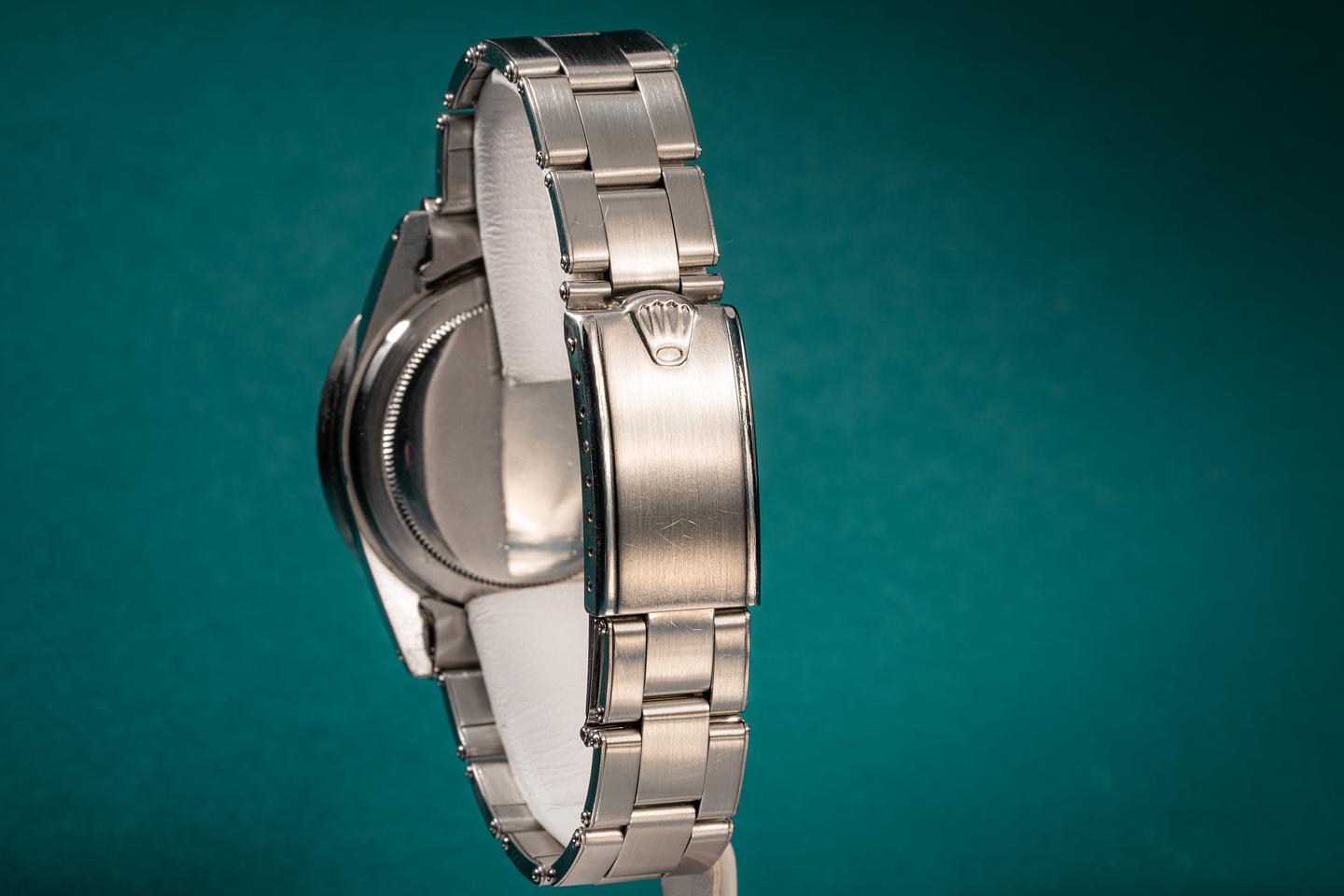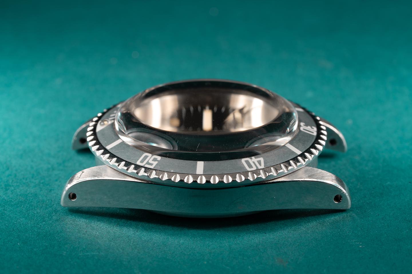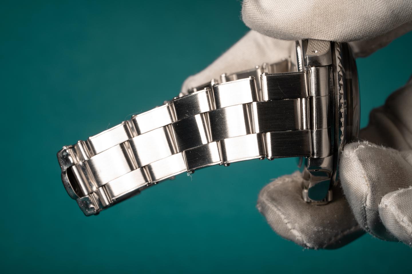 Case: The previously polished case is excellent and features wide prominent bevels. The bezel insert shows very light wear and has faded to a silvery satin grey.