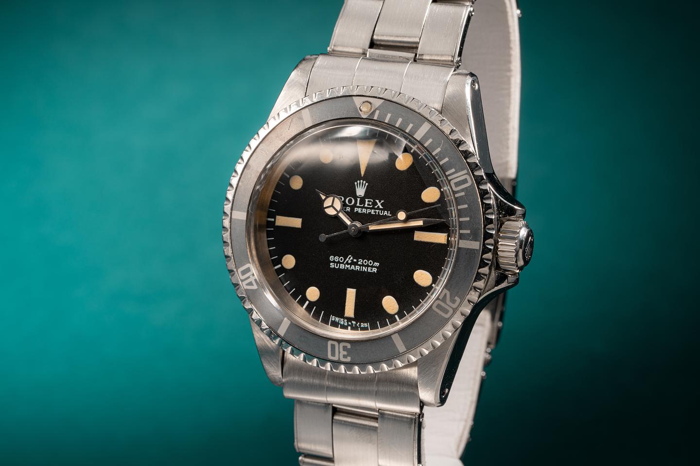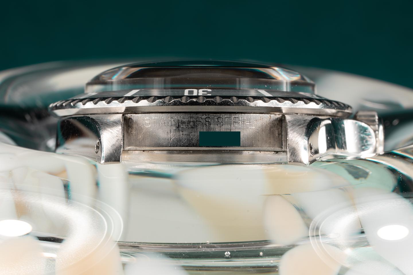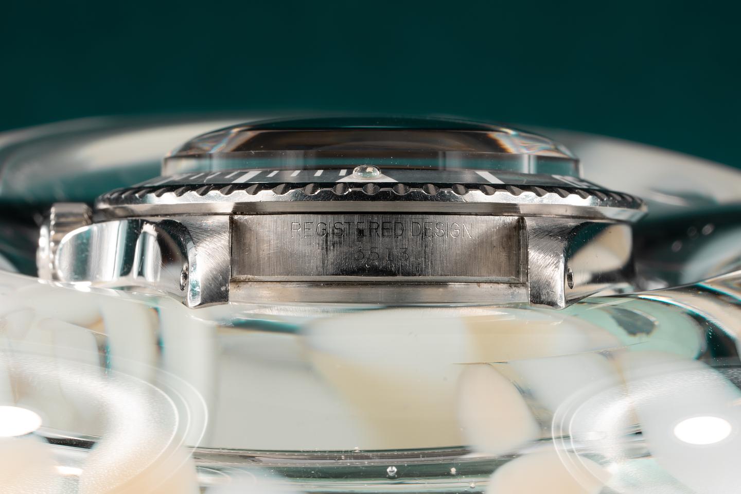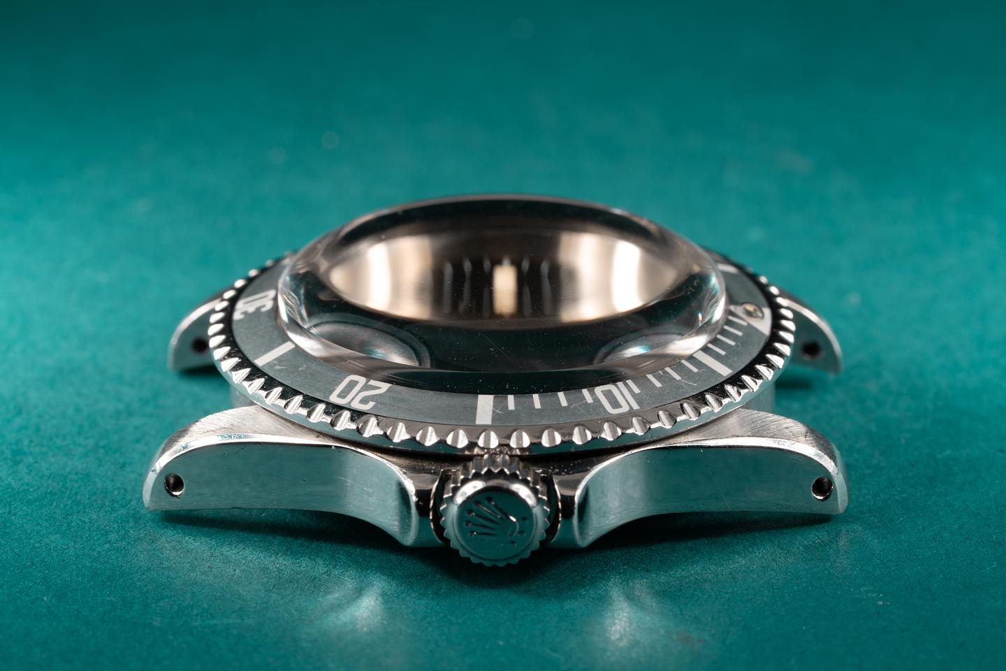 Case: The previously polished case is excellent and features wide prominent bevels. The bezel insert shows very light wear and has faded to a silvery satin grey.