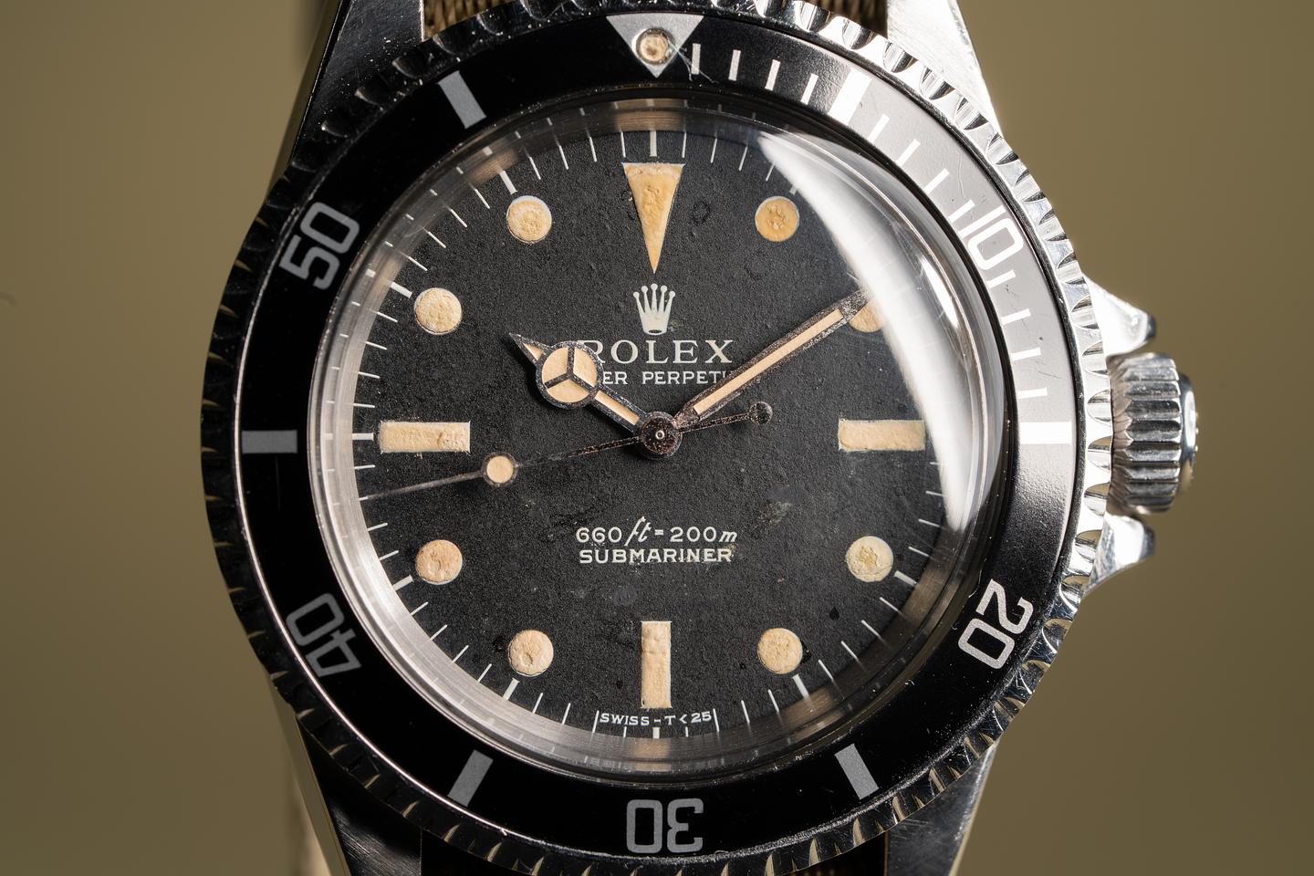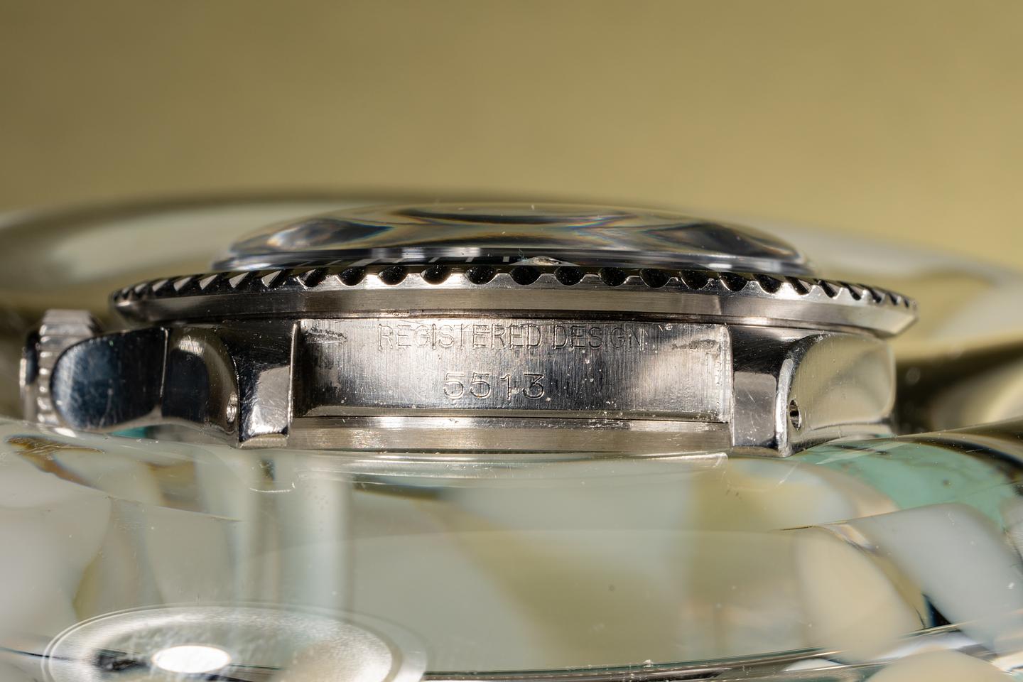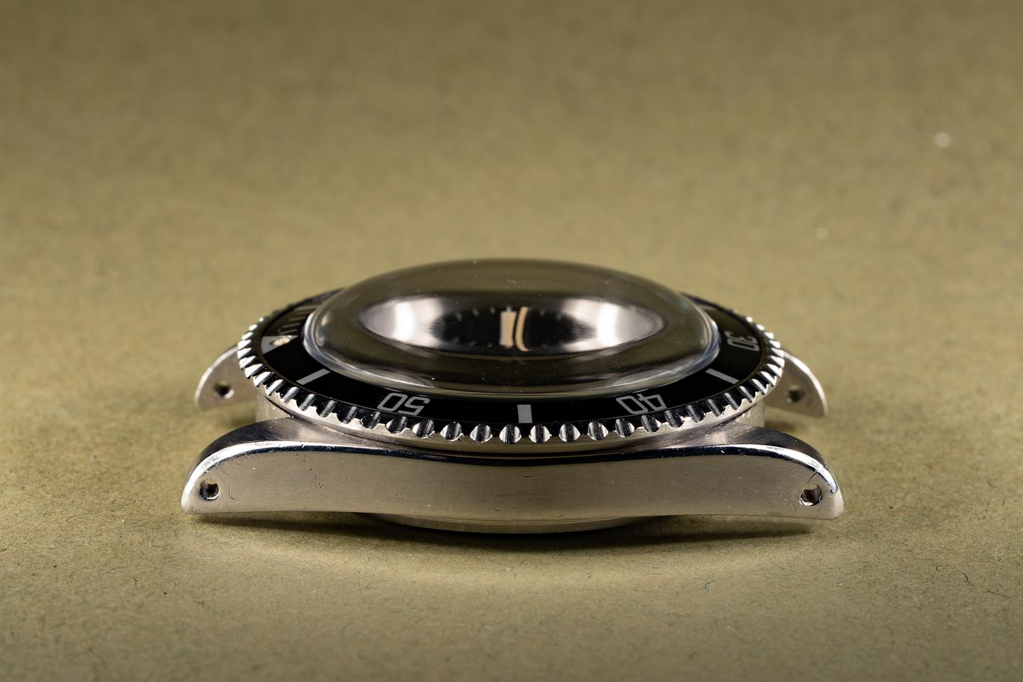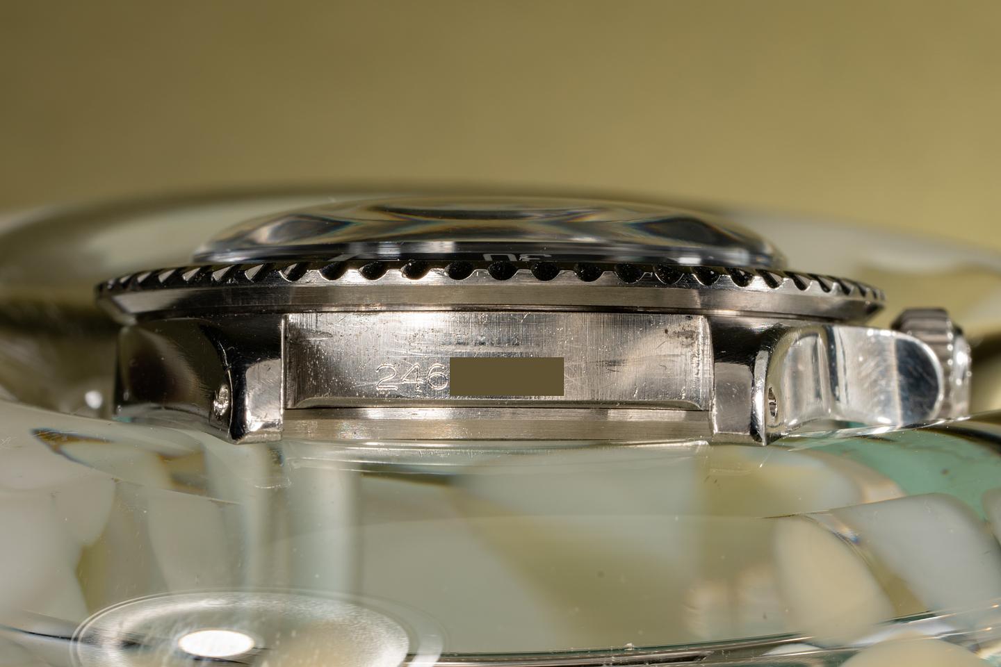 Dial: On the dial 3, 6, 9, and 12 o'clock markers have been relumed and color-matched to the remaining original lume, and the 1 o'clock looks like it has been touched up. The dial was chipped in several spots and these spots have been painted over. The hands have been relumed and color-matched to the dial.