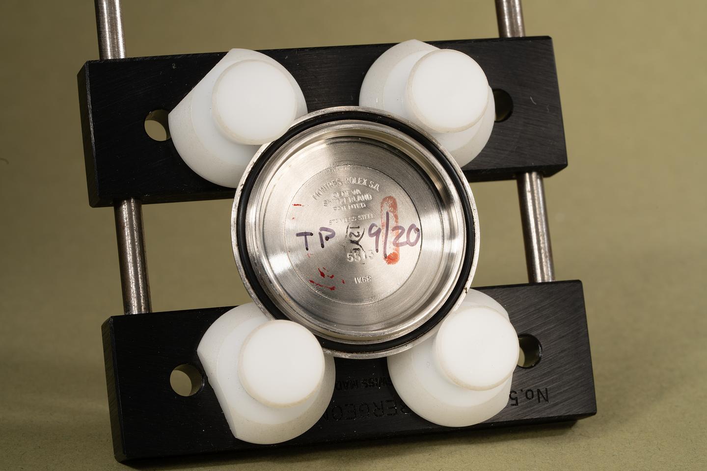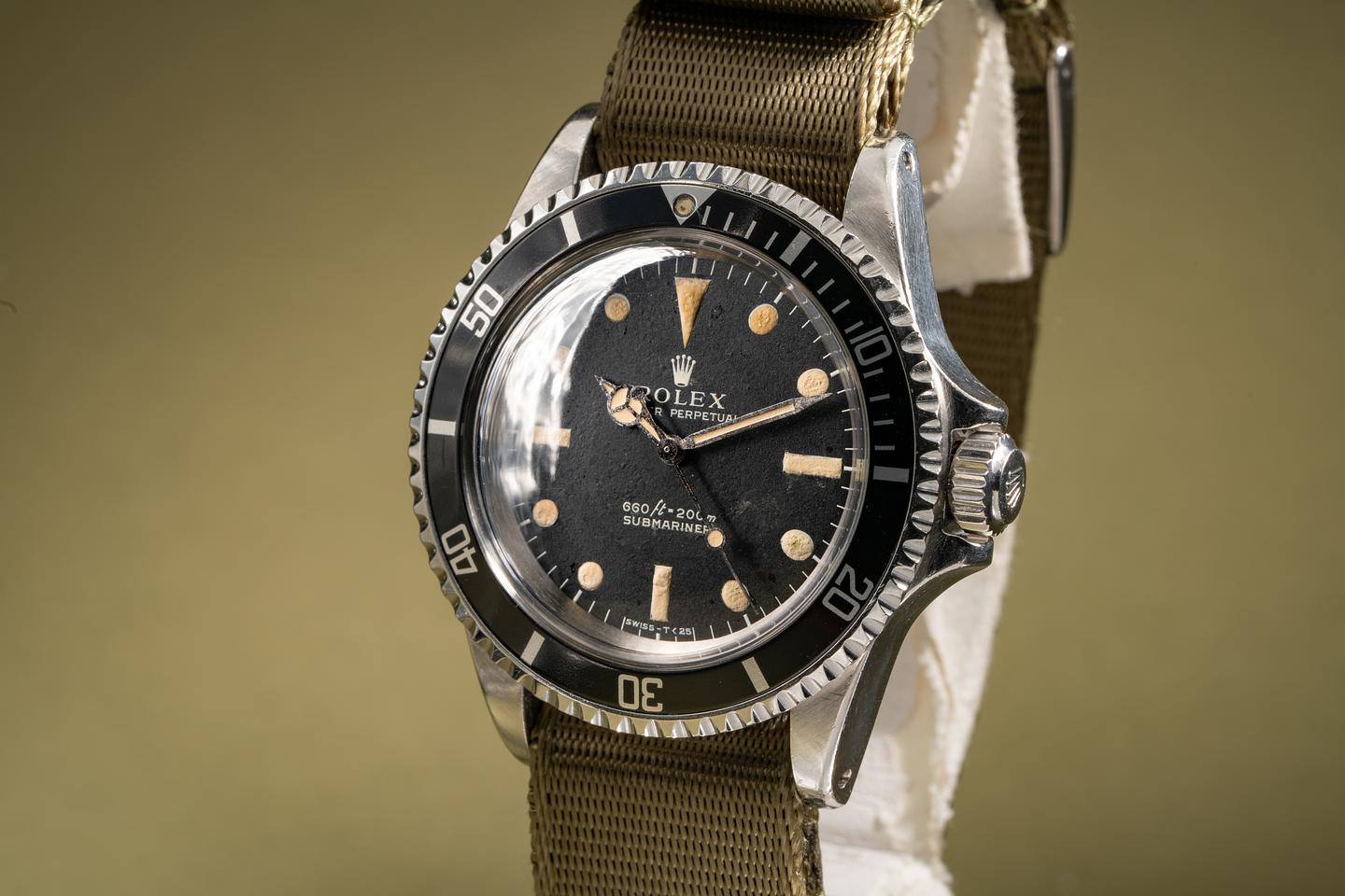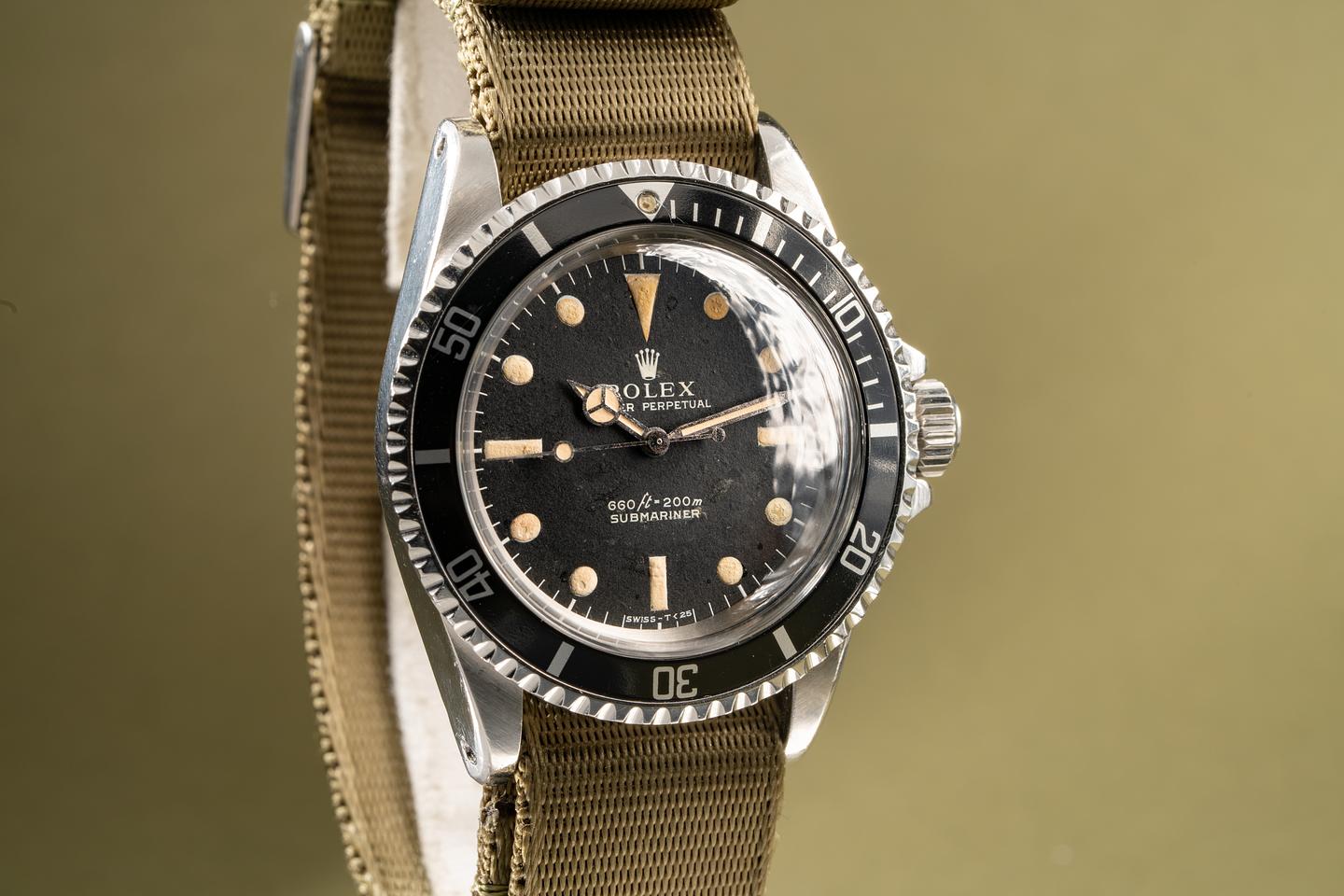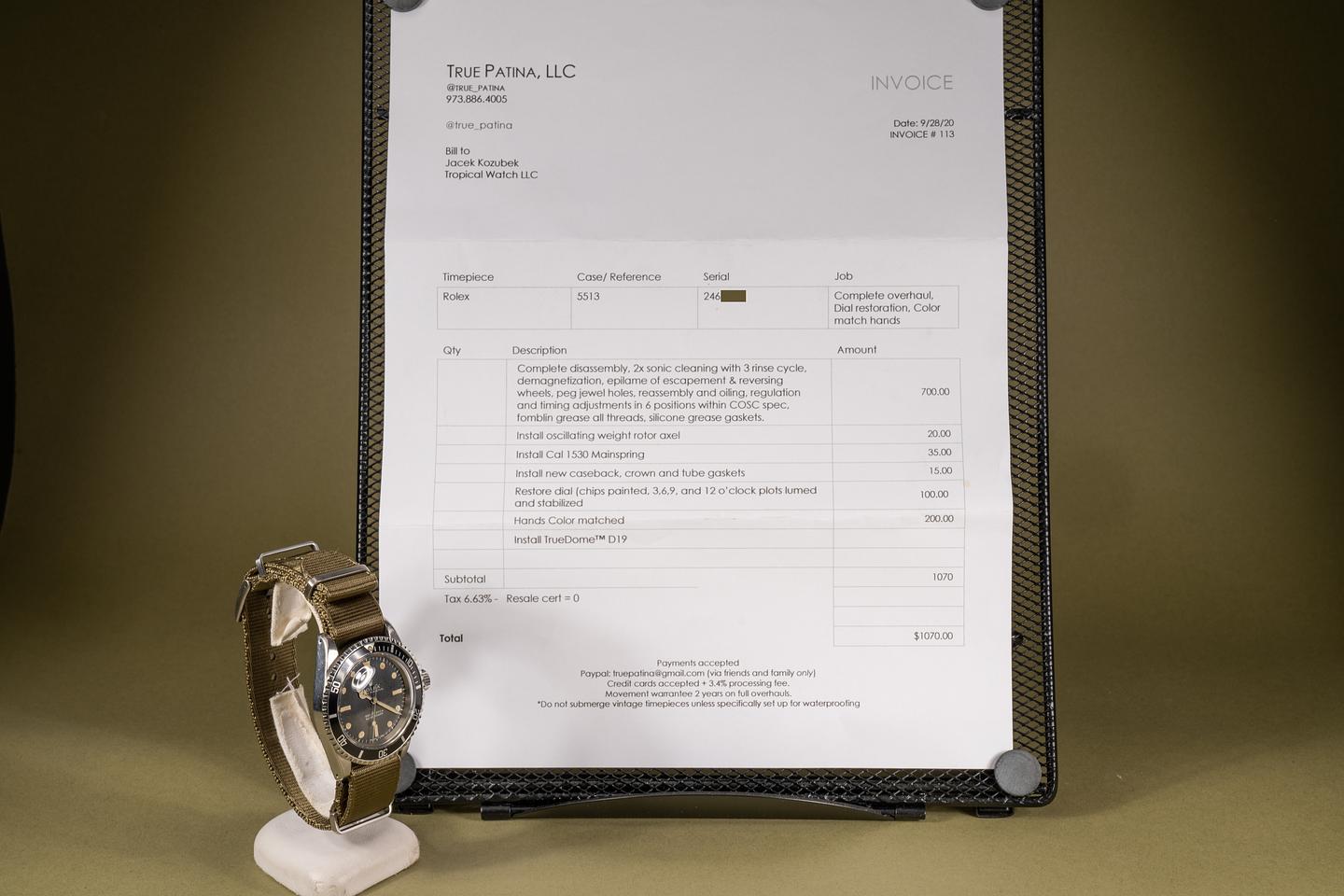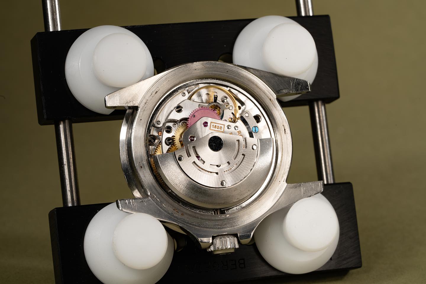 Dial: On the dial 3, 6, 9, and 12 o'clock markers have been relumed and color-matched to the remaining original lume, and the 1 o'clock looks like it has been touched up. The dial was chipped in several spots and these spots have been painted over. The hands have been relumed and color-matched to the dial.