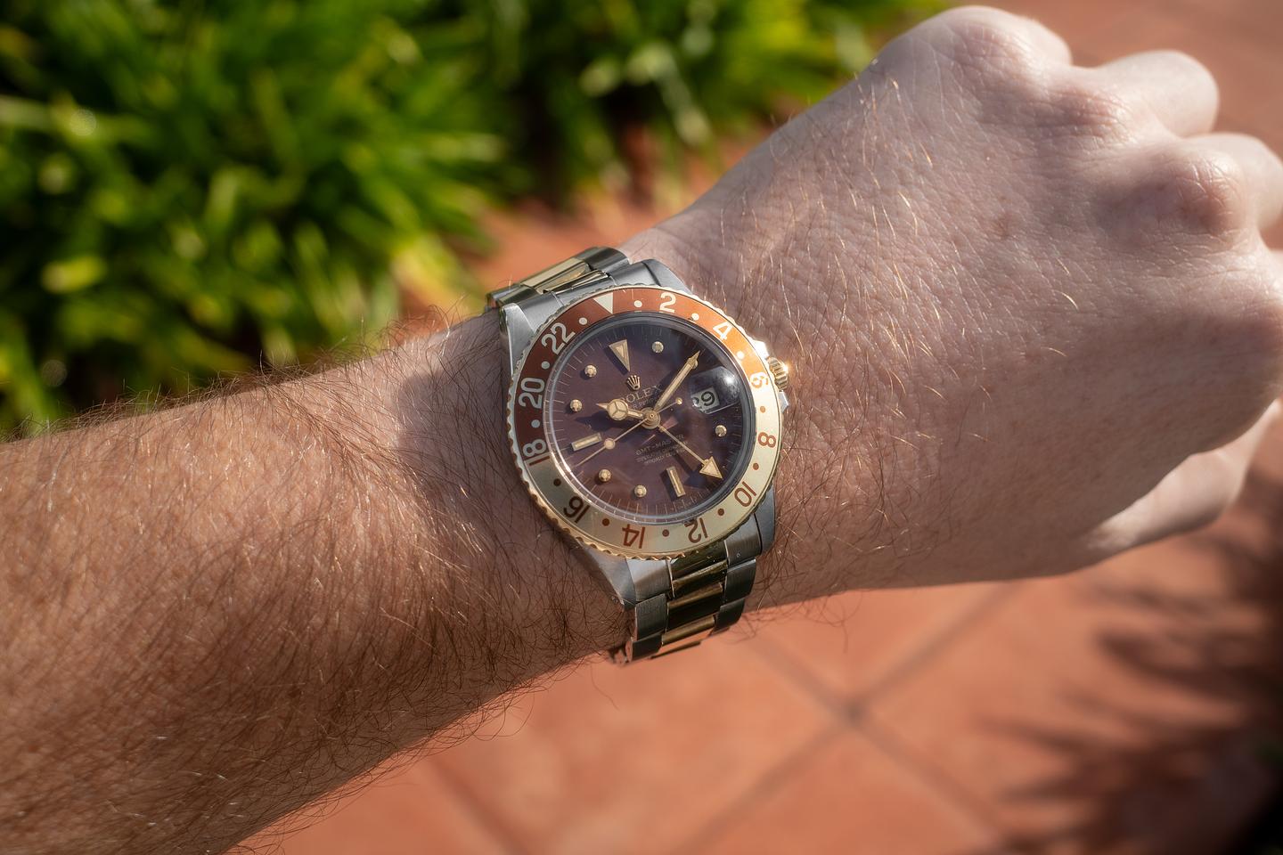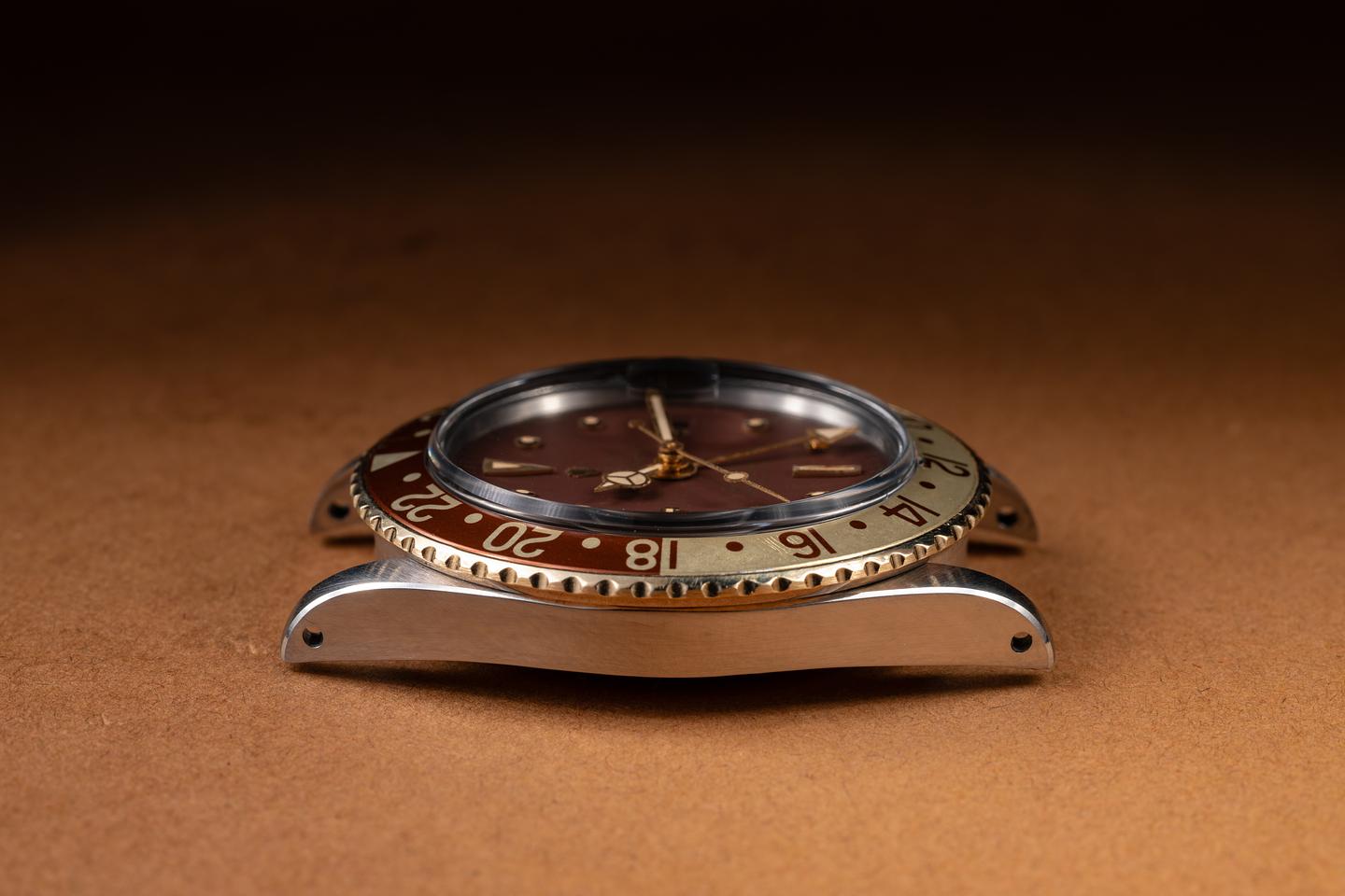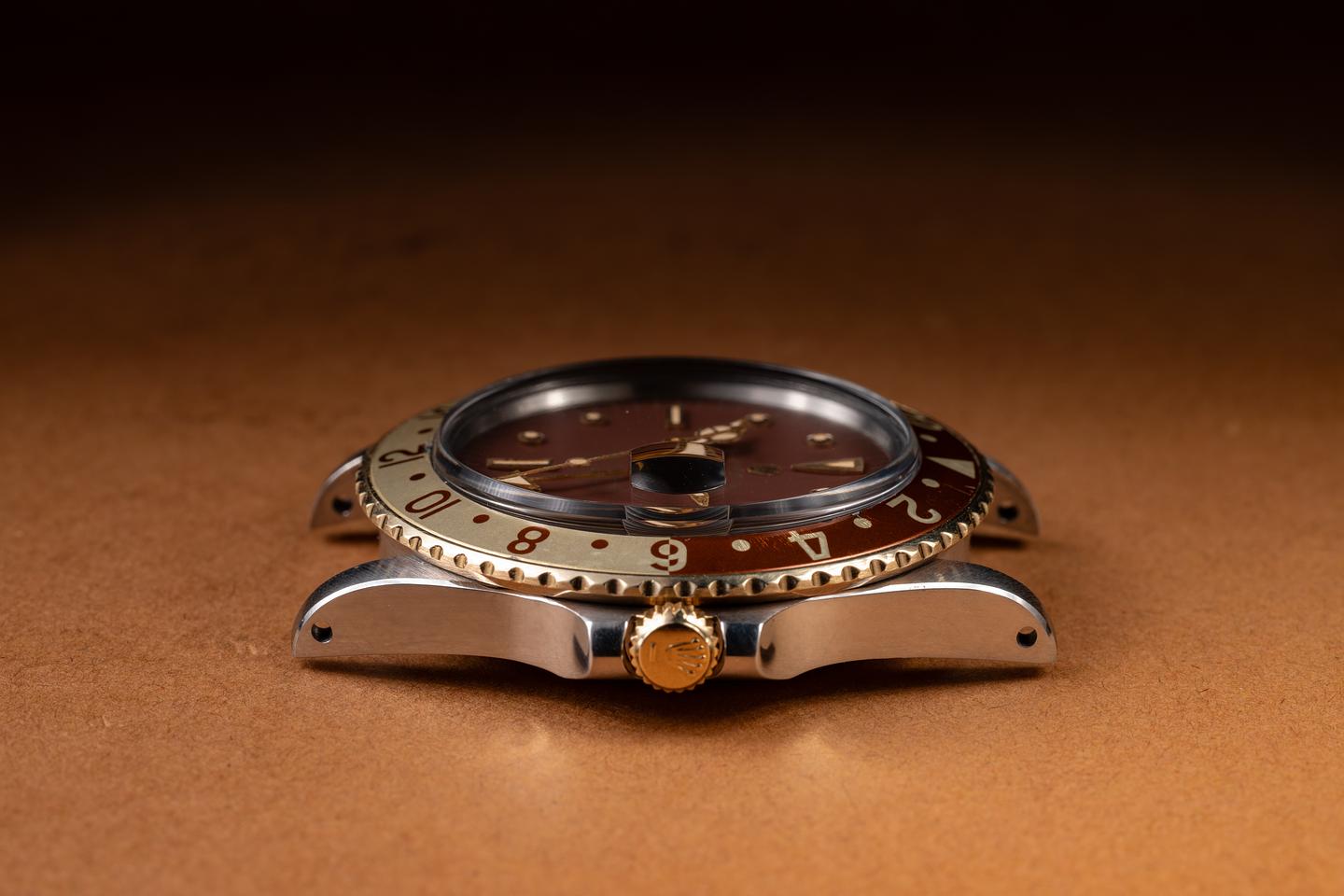 Case: The recently polished case is excellent, showing sharp, prominent bevels and only very light wear. The brown and gold bezel insert is also in excellent condition, showing only very light wear from use.