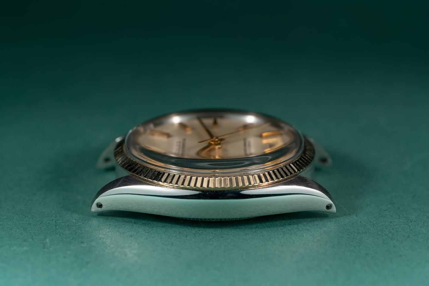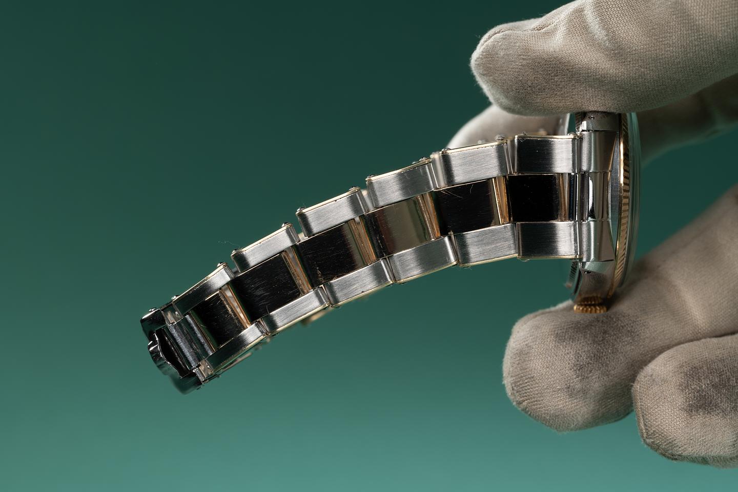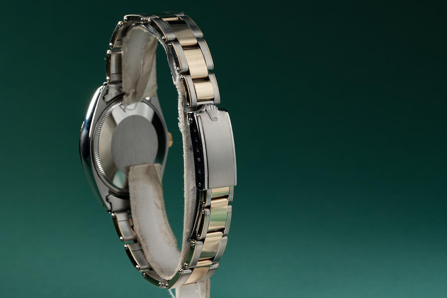 Bracelet: The 13 link 18k two-tone Oyster bracelet is excellent showing average stretch for its age. The clasp is stamped with a 1968 date code.